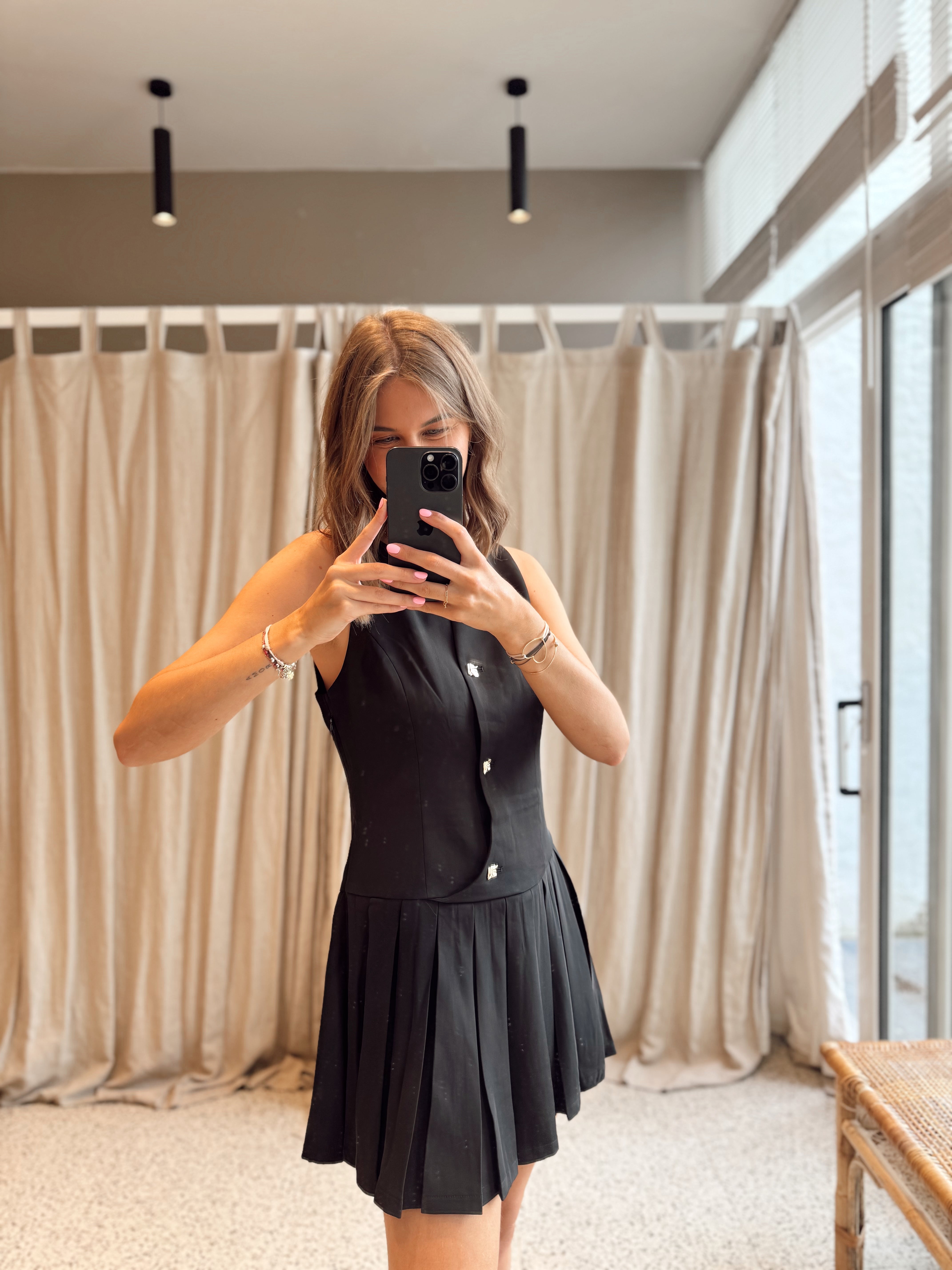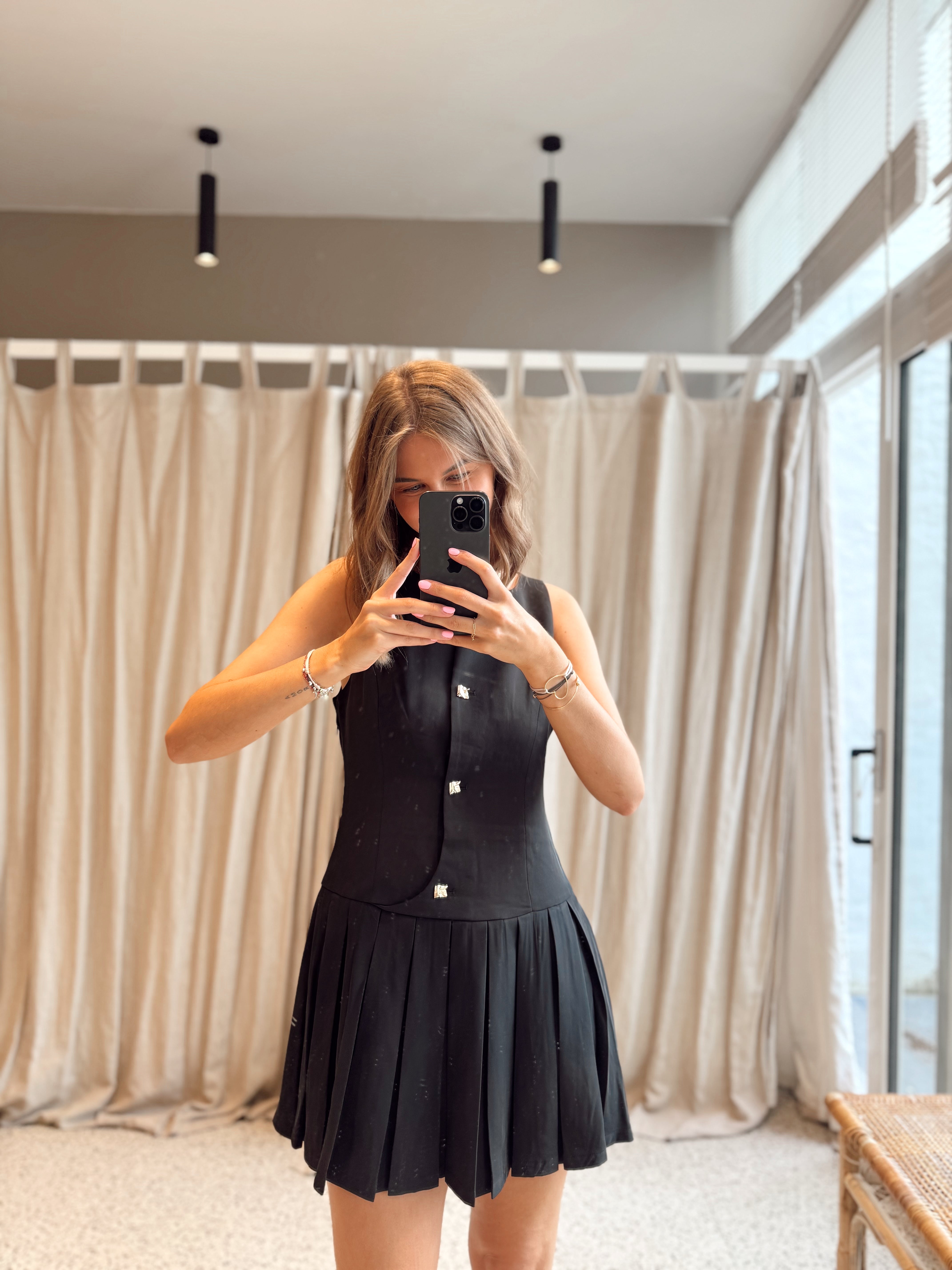 Cette robe courte noire se distingue par ses petits boutons dorés et son bas plissé élégant. Conçue avec 96 % de polyester et 4 % de spandex, elle offre confort et légèreté. Facile d'entretien, elle se lave à 30 degrés, parfaite pour sublimer votre style au quotidien.