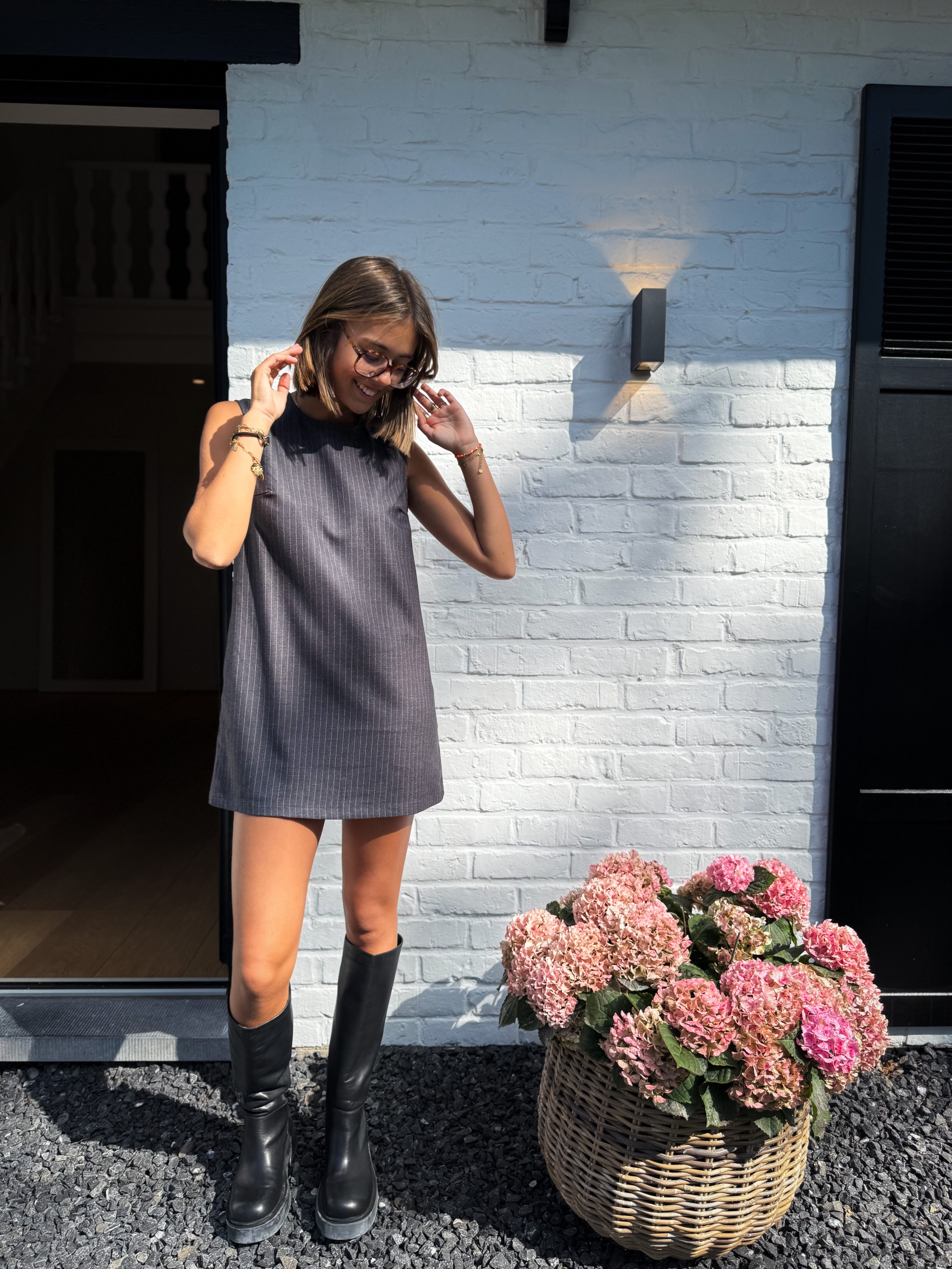 Cette robe courte grise, ornée de fines rayures blanches et dotée de manches courtes, est disponible en tailles S, M et L. Elle s’adapte parfaitement aux tailles 34 à 42, alliant élégance et confort pour toutes les occasions.