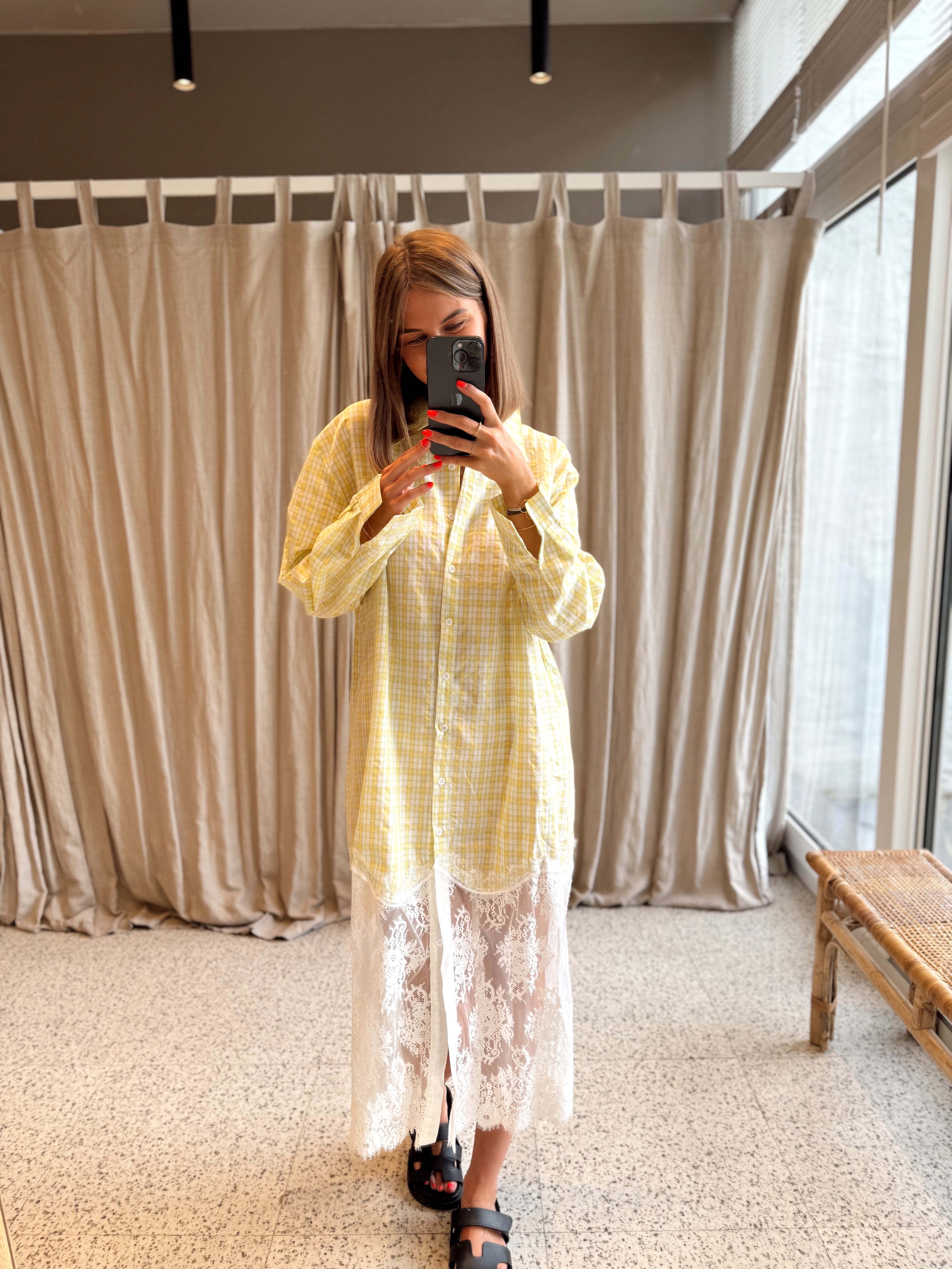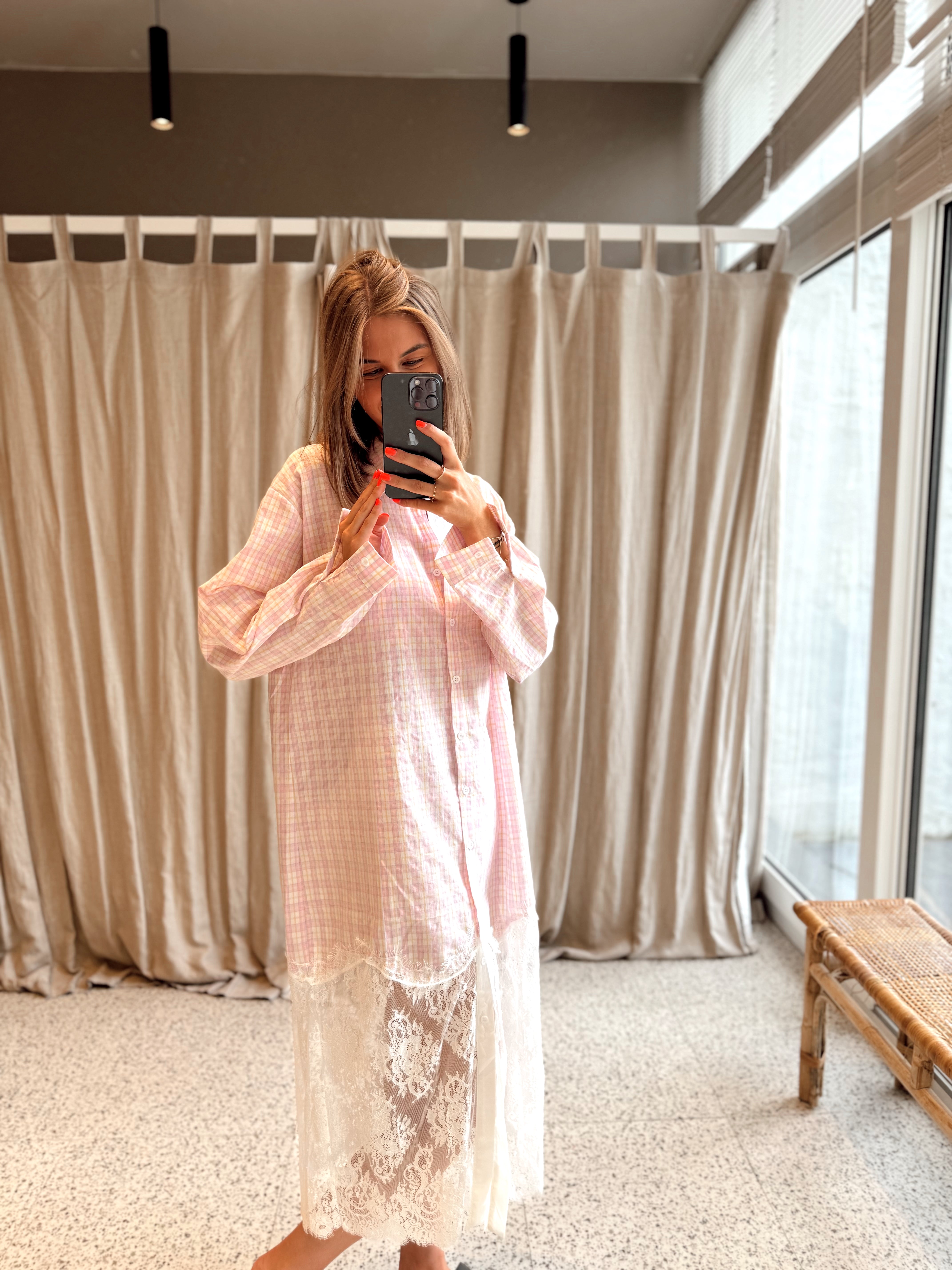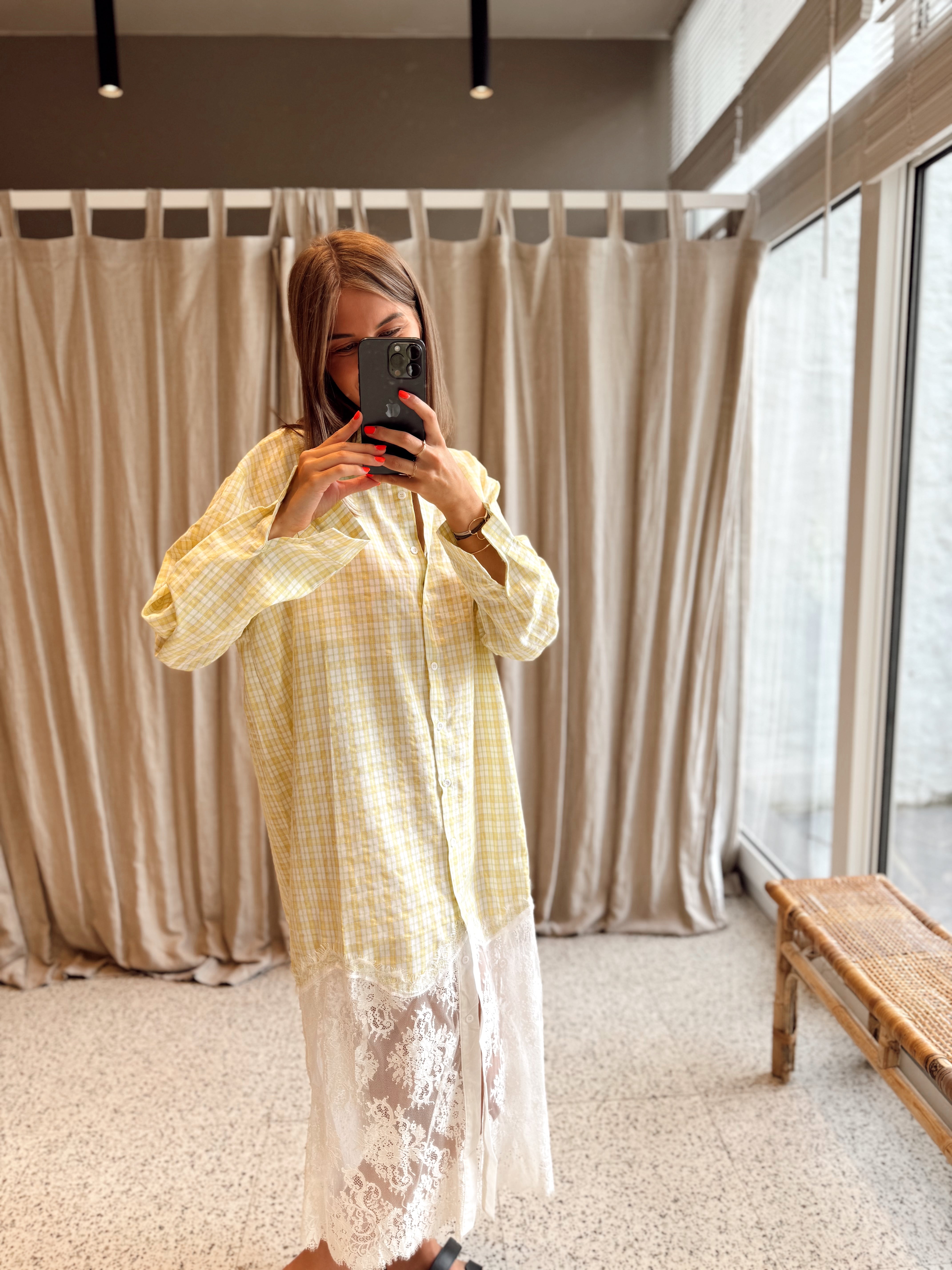 Cette robe chemise à manches longues se distingue par son imprimé à carreaux élégant et sa délicate dentelle ornant le bas, apportant une touche raffinée à votre tenue. Elle est disponible en SM ou ML.
