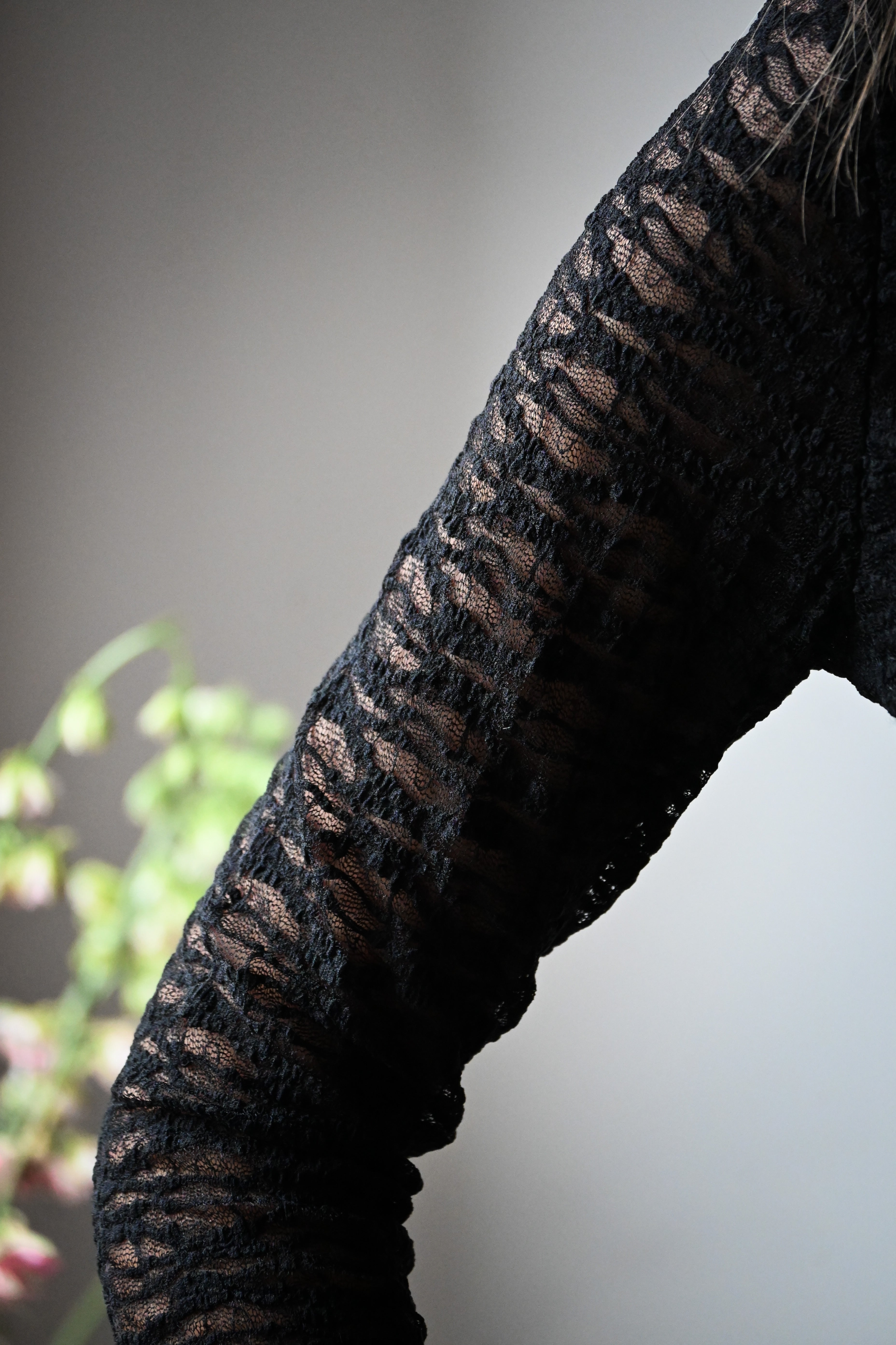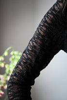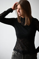 Cette blouse courte à manches longues en dentelle noire séduit par son délicat bandeau sur la poitrine et son col montant élégant. Disponible en tailles S, M et L, elle allie sophistication et charme pour sublimer votre silhouette.