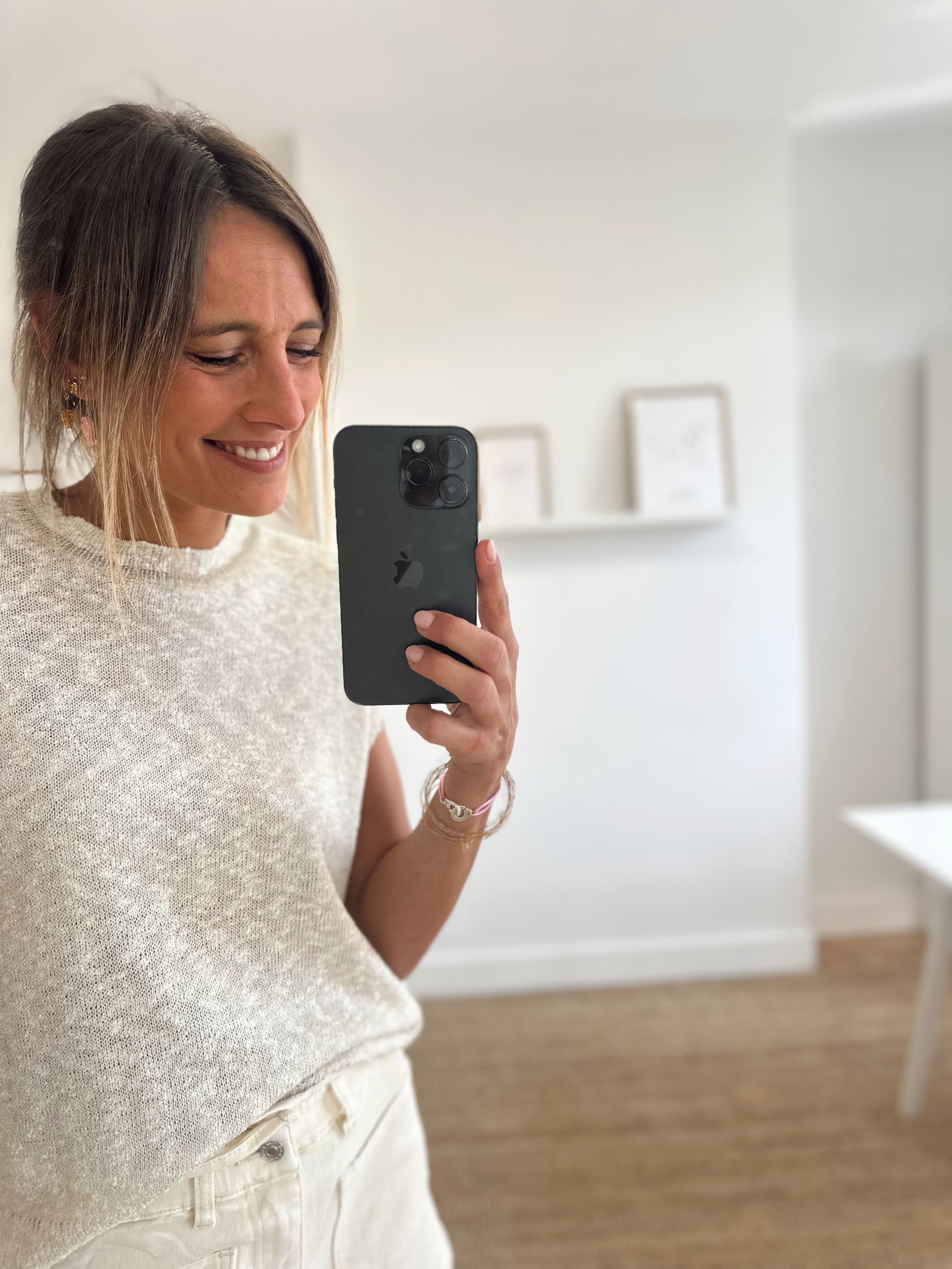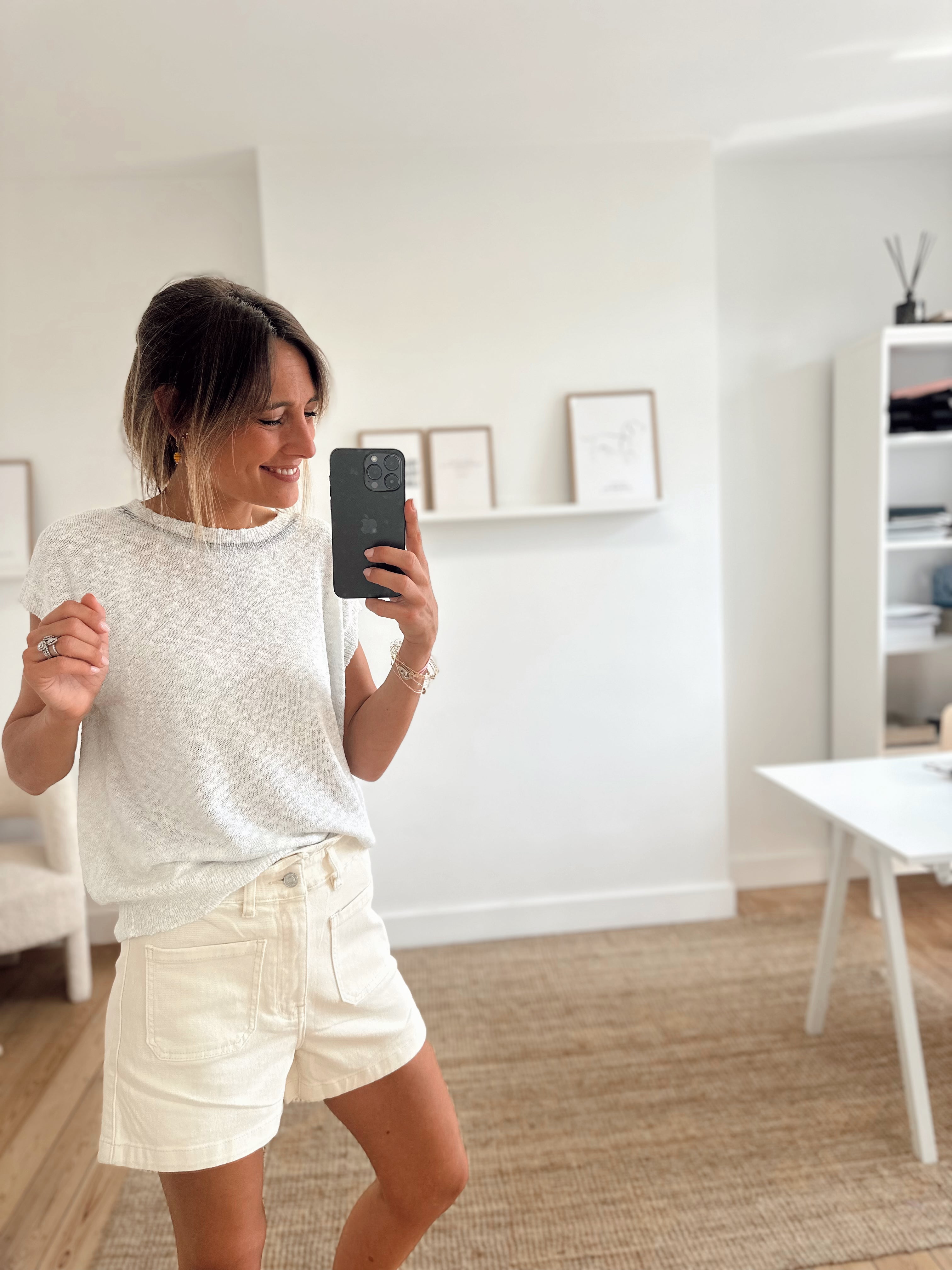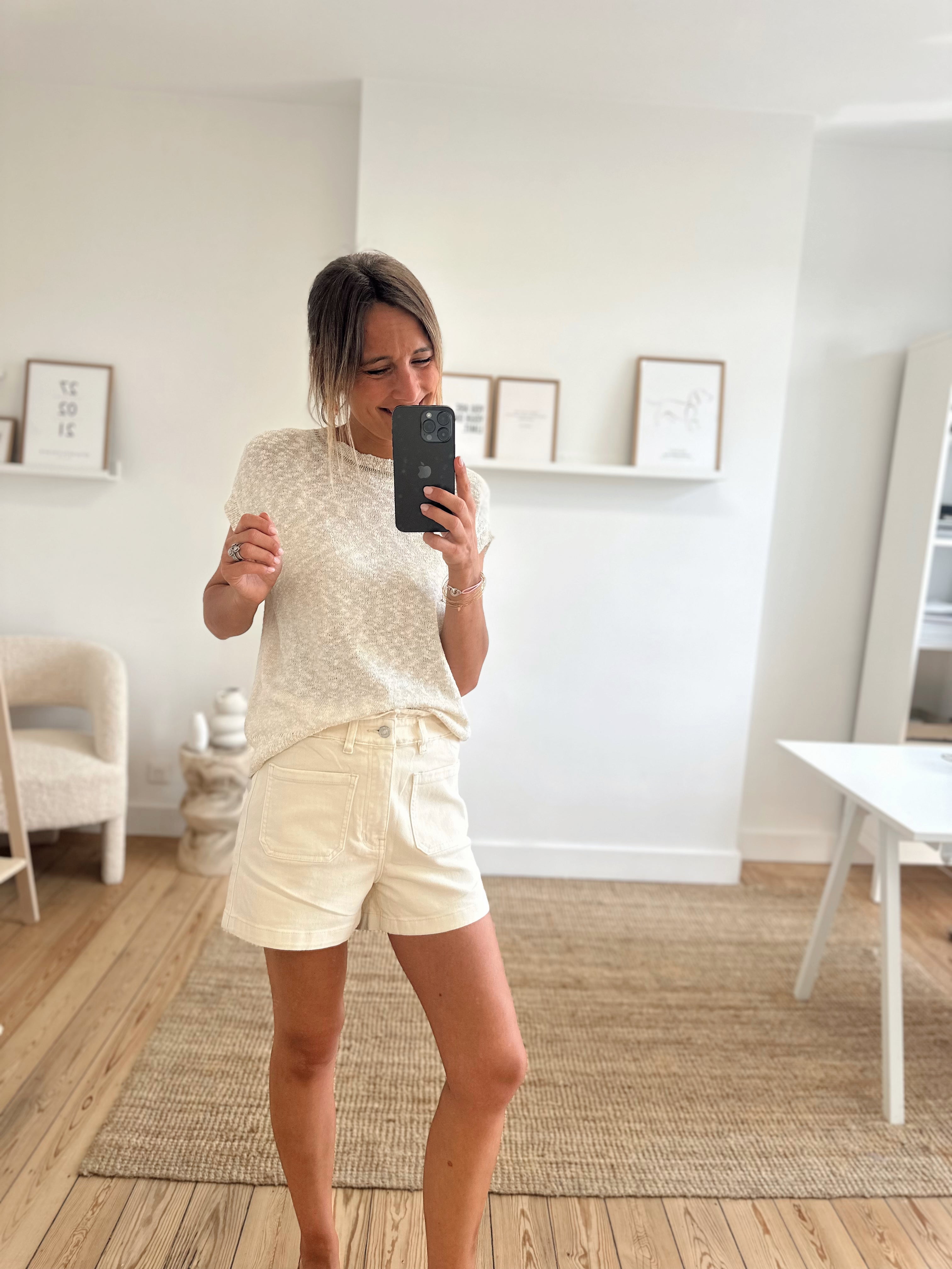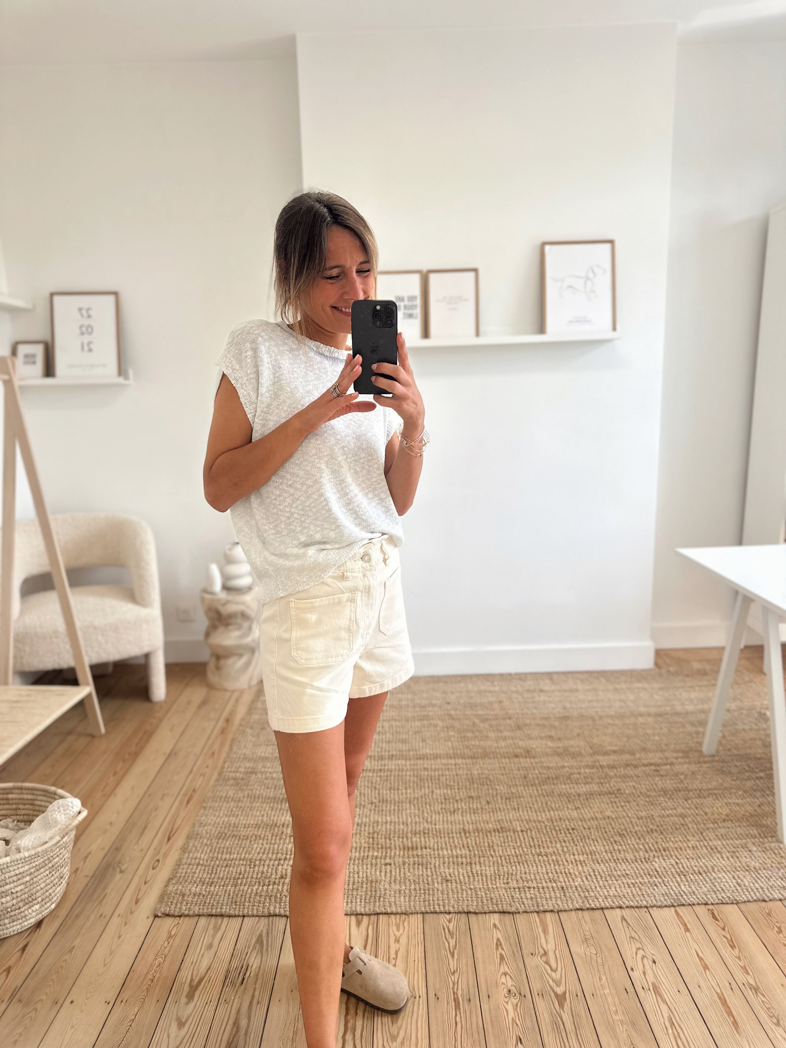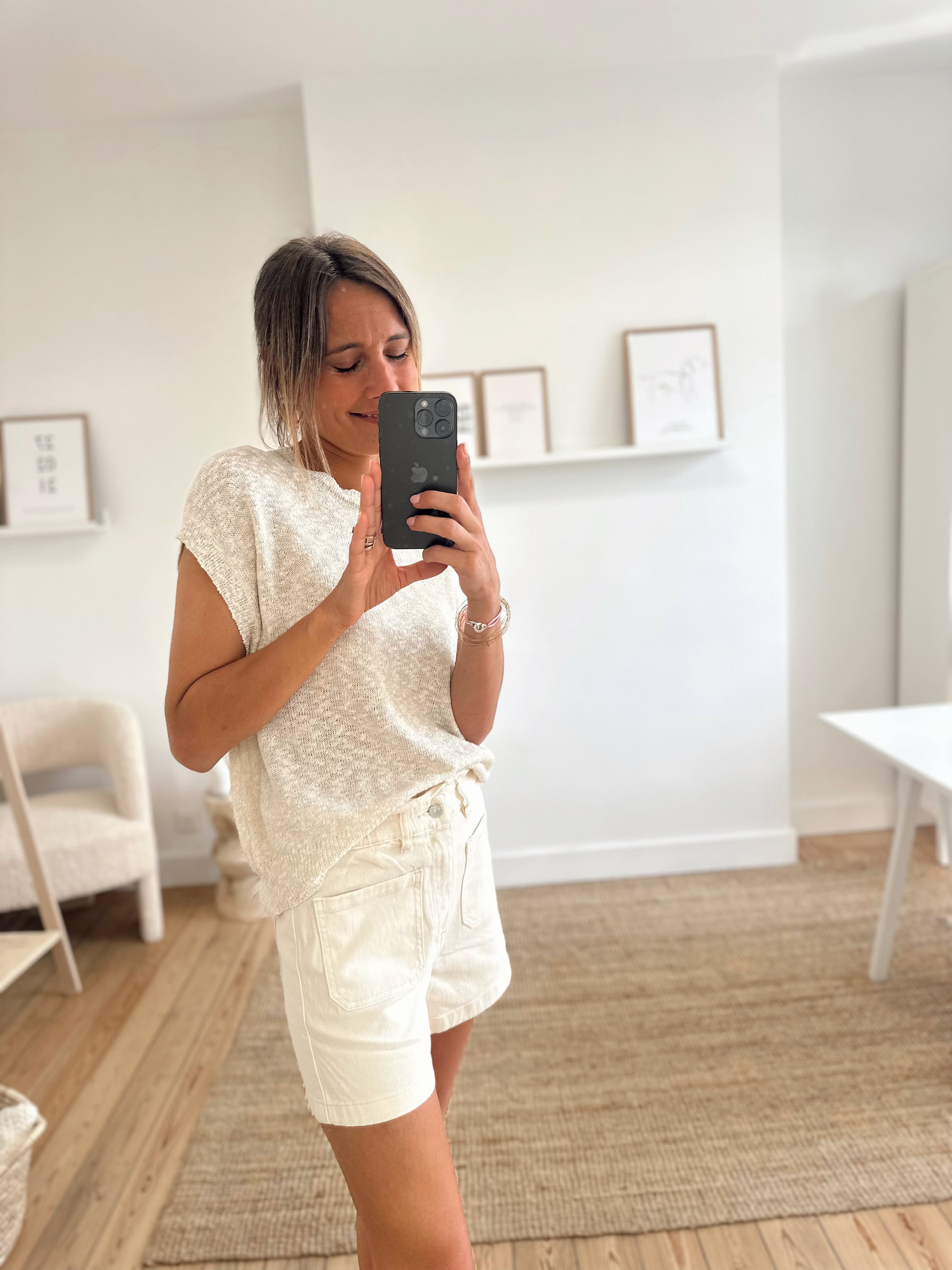 Blouse en crochet sans manche, avec un fin liseré brillant. Disponible en beige et doré et en blanc et argenté. Il existe en taille S/M et en taille M/L.