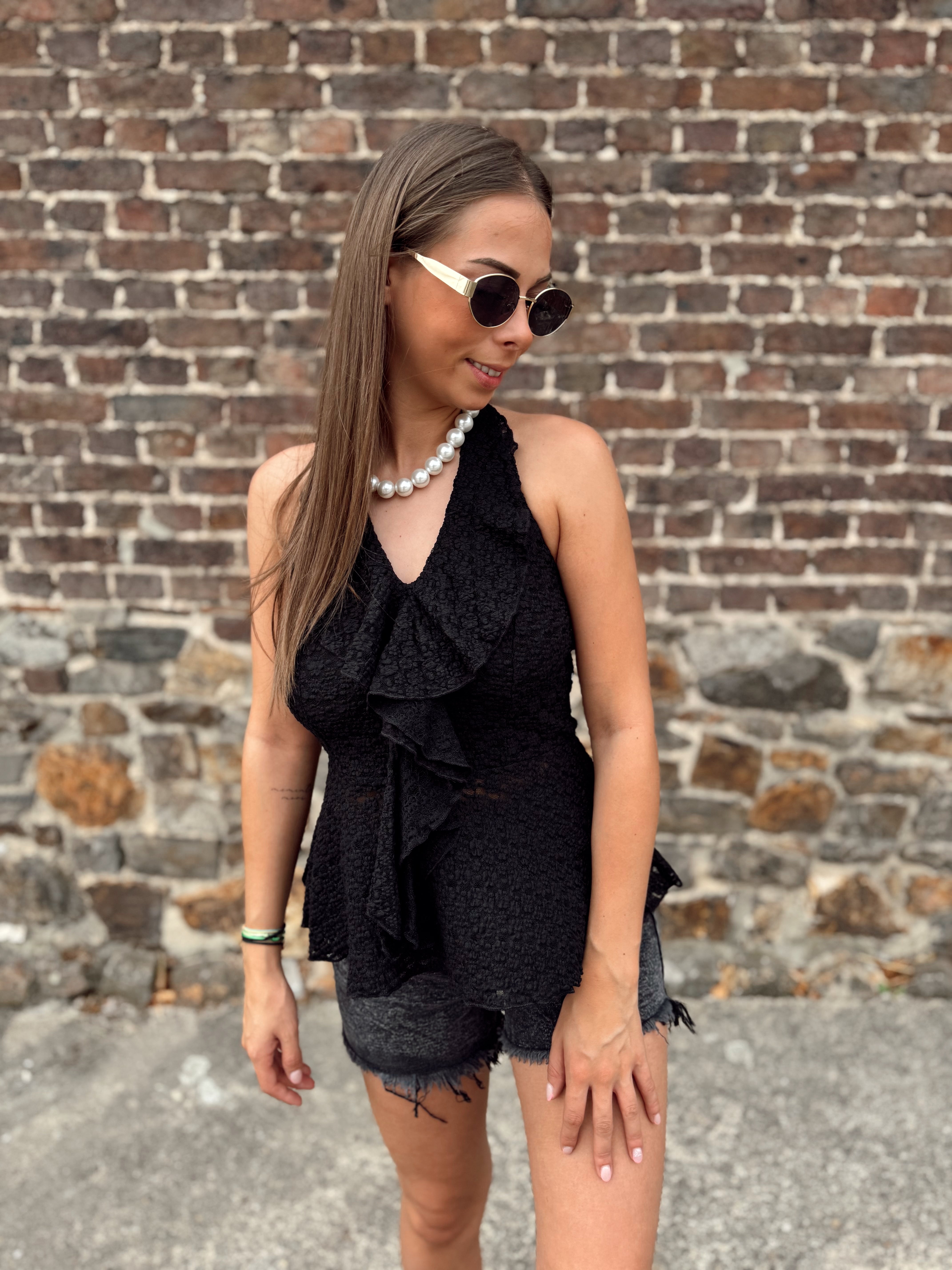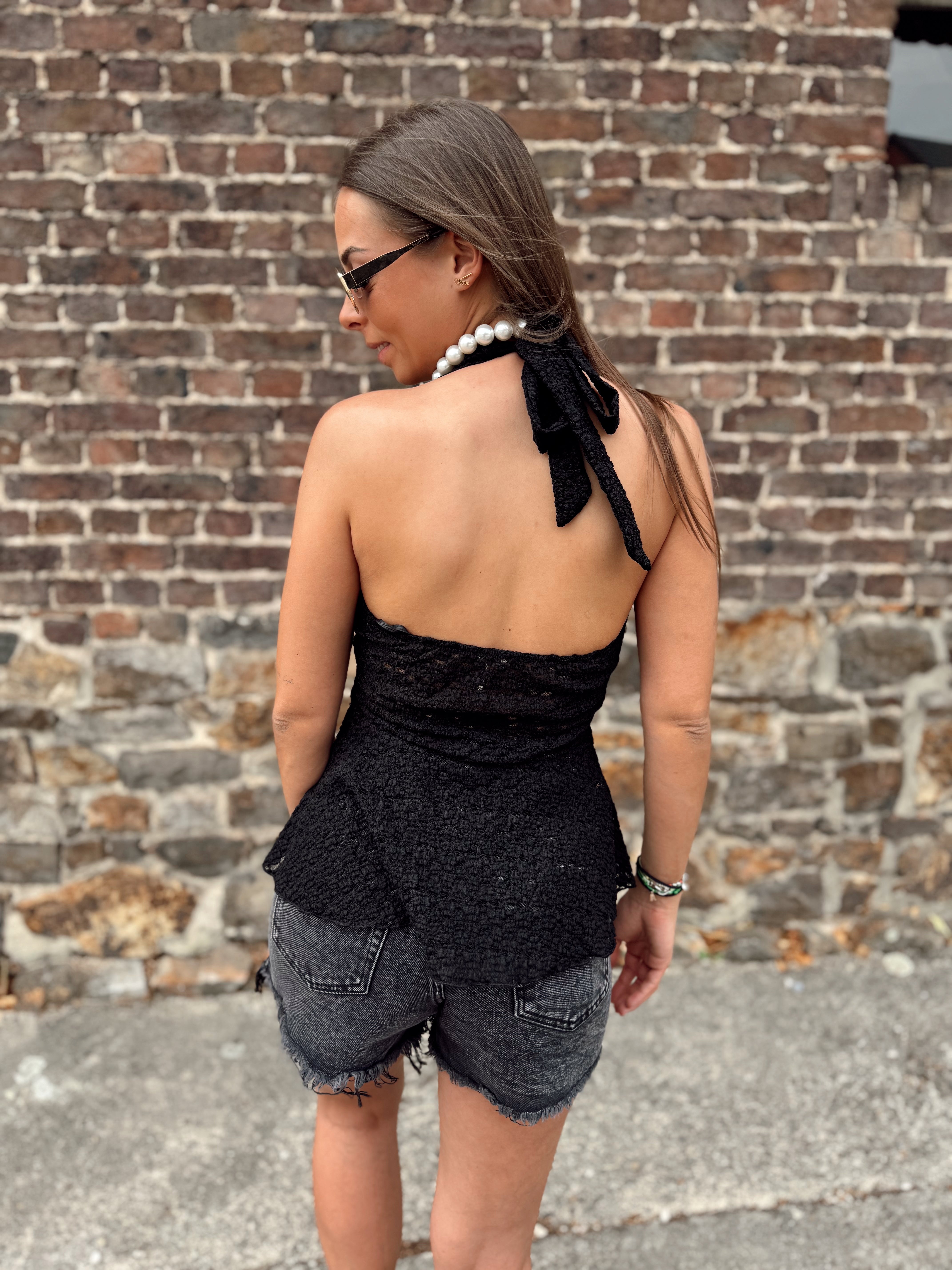 Cette blouse en dentelle se noue élégamment autour du cou, avec un décolleté subtil à l’avant et un large décolleté dans le dos. Elle présente des découpes délicates sur le devant pour une touche sophistiquée. Disponible en blanc cassé, chocolat et noir, elle se décline en tailles SM et ML pour s’adapter parfaitement à votre silhouette.