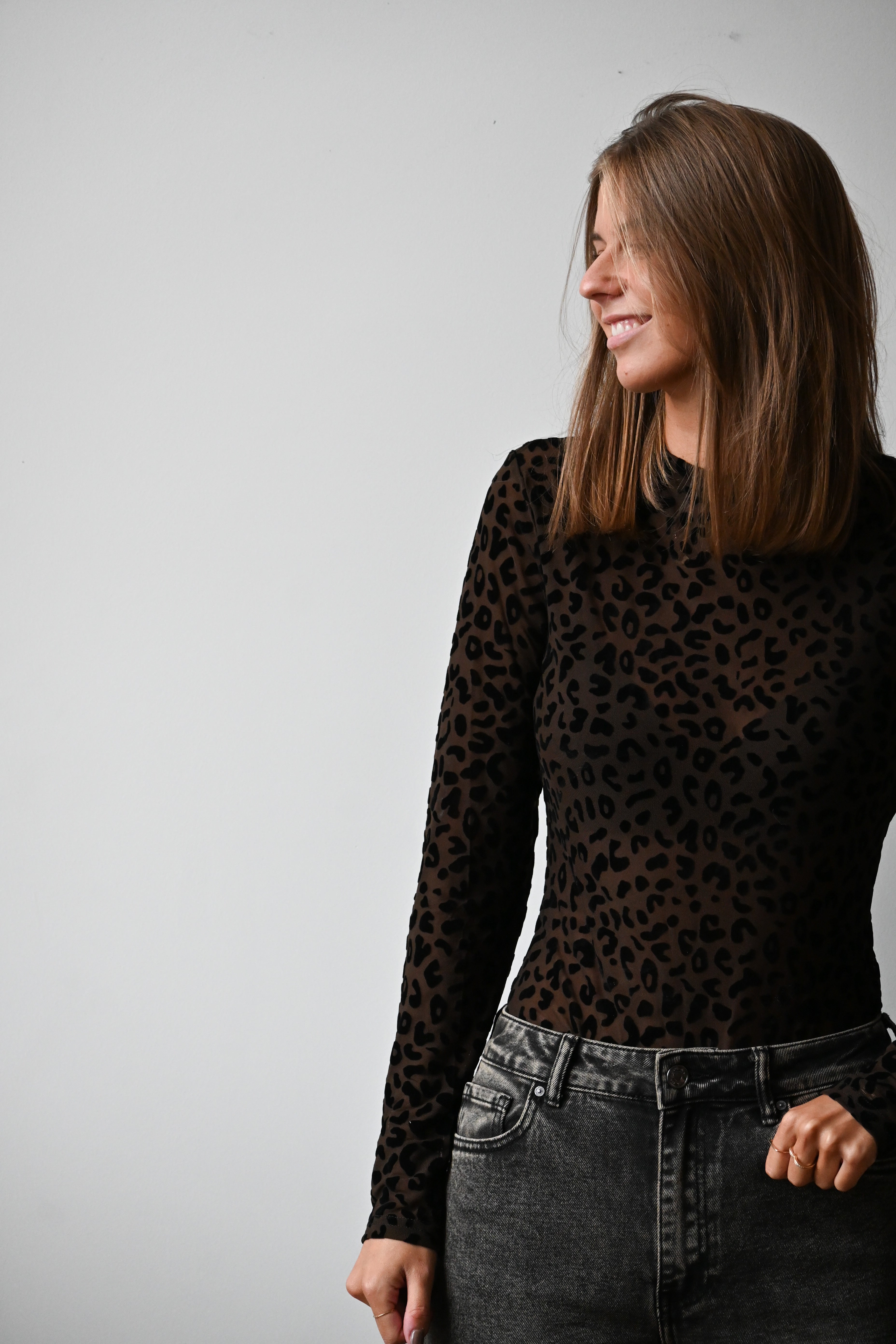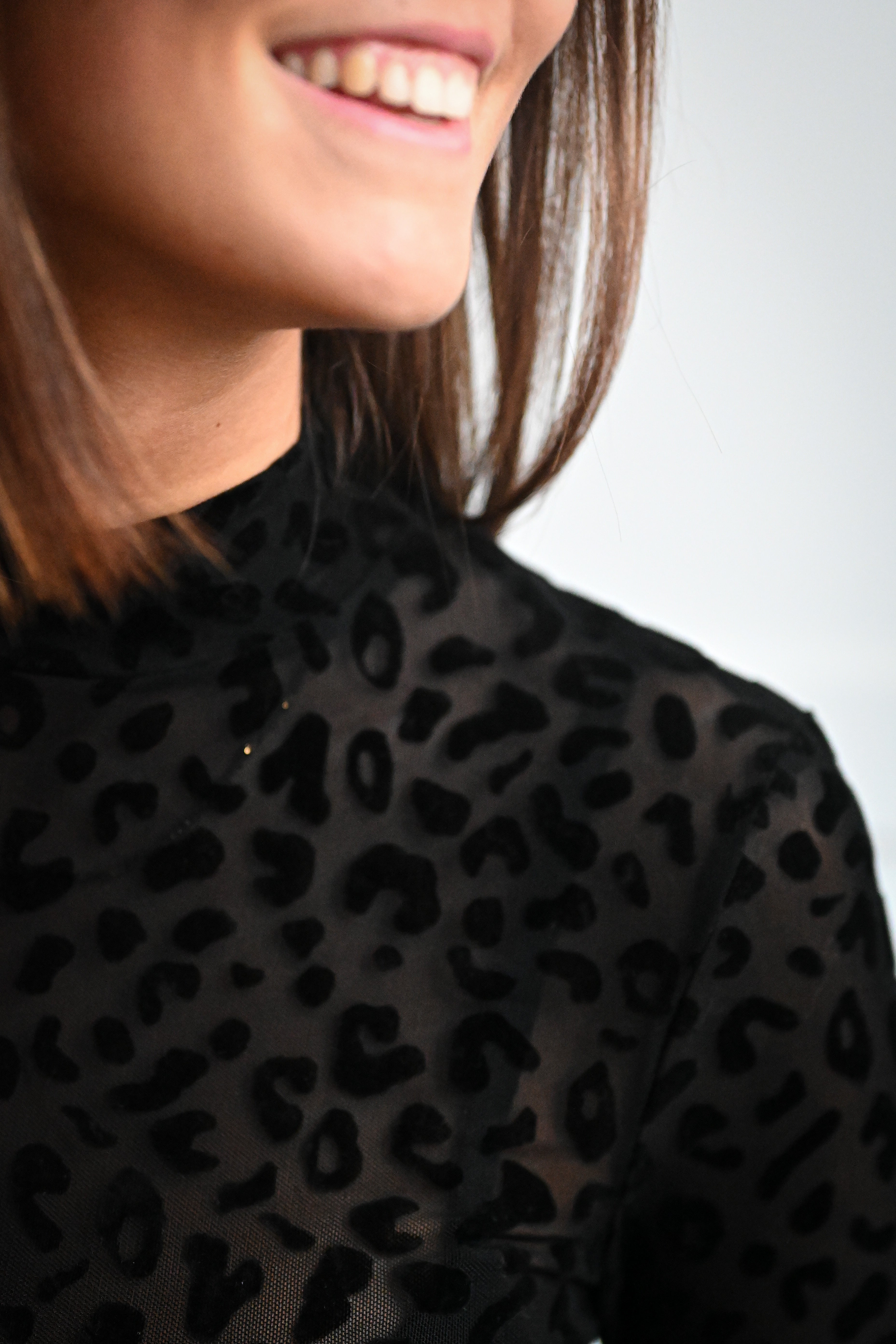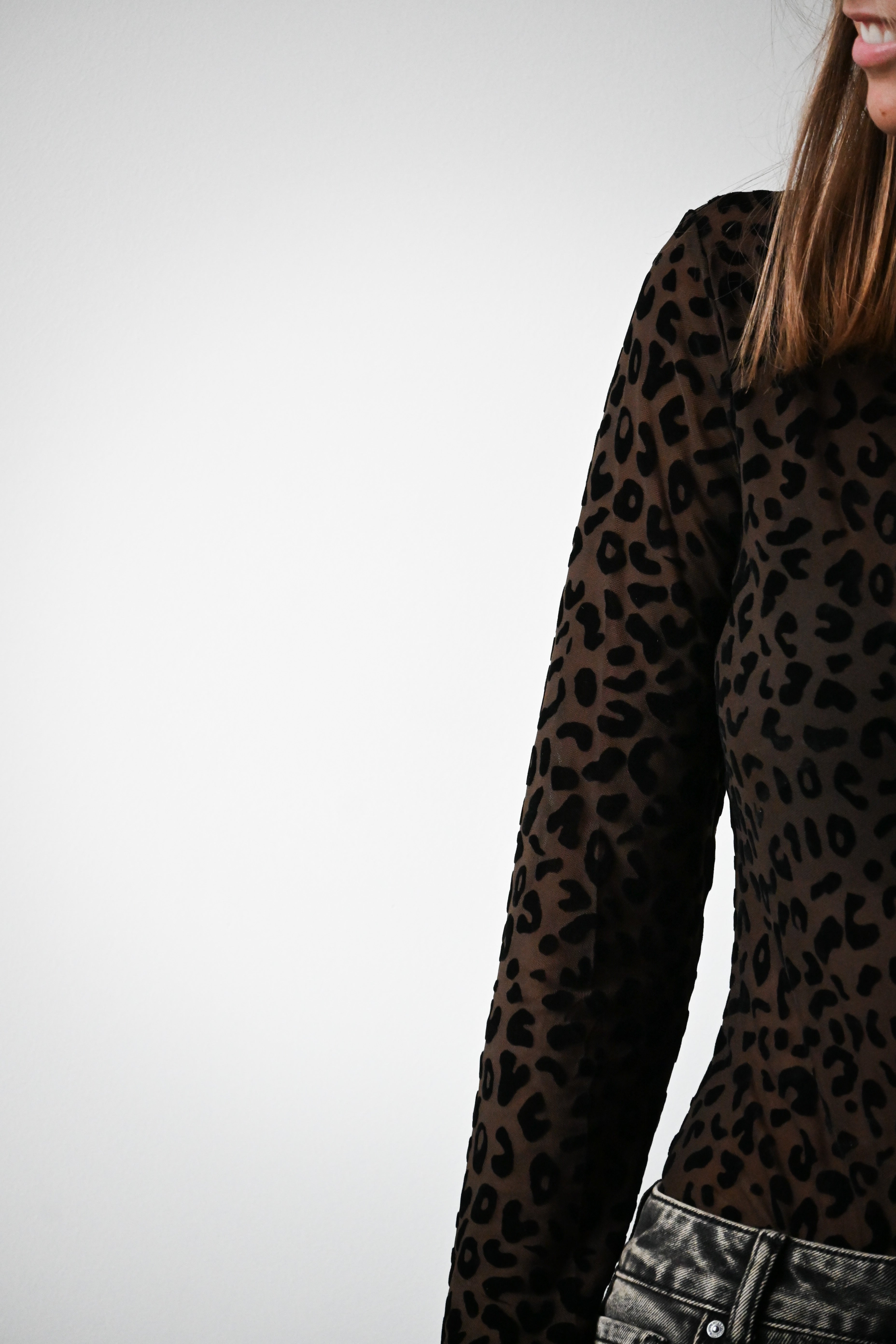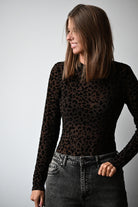 Ce body à manches longues couleur chocolat présente un motif léopard noir en velours et un col montant élégant. Disponible en tailles S, M et L, il allie style et confort pour sublimer votre silhouette.
