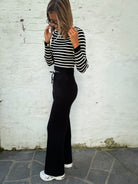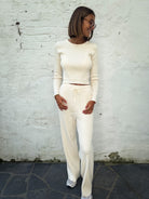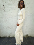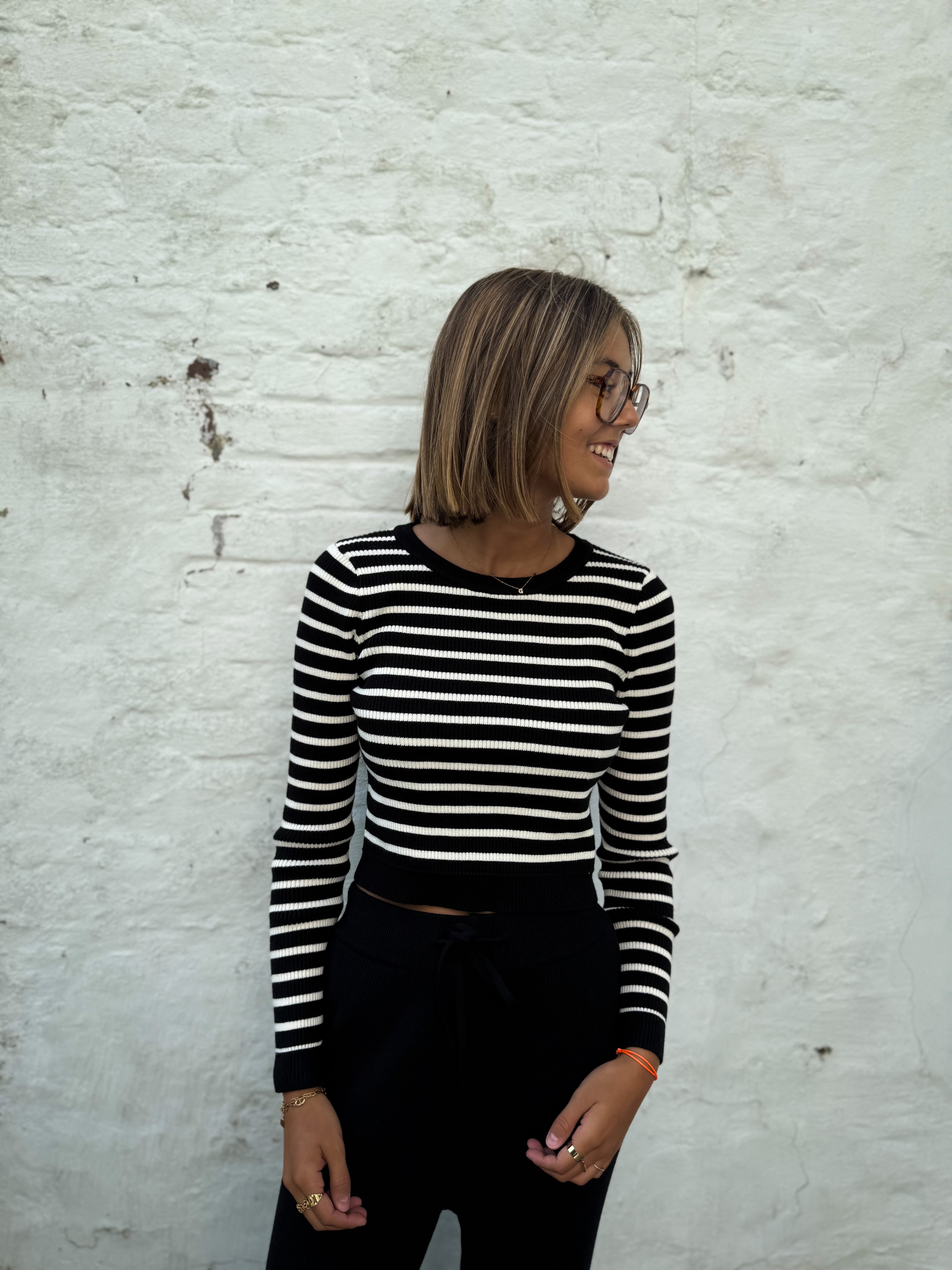 Ce ensemble en maille douce comprend un crop-top à manches longues et un pantalon ample, proposé en noir rayé blanc ou en beige uni, disponible en tailles S/M et M/L. Ce look confortable et élégant est parfait pour toutes vos occasions décontractées.