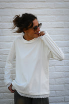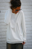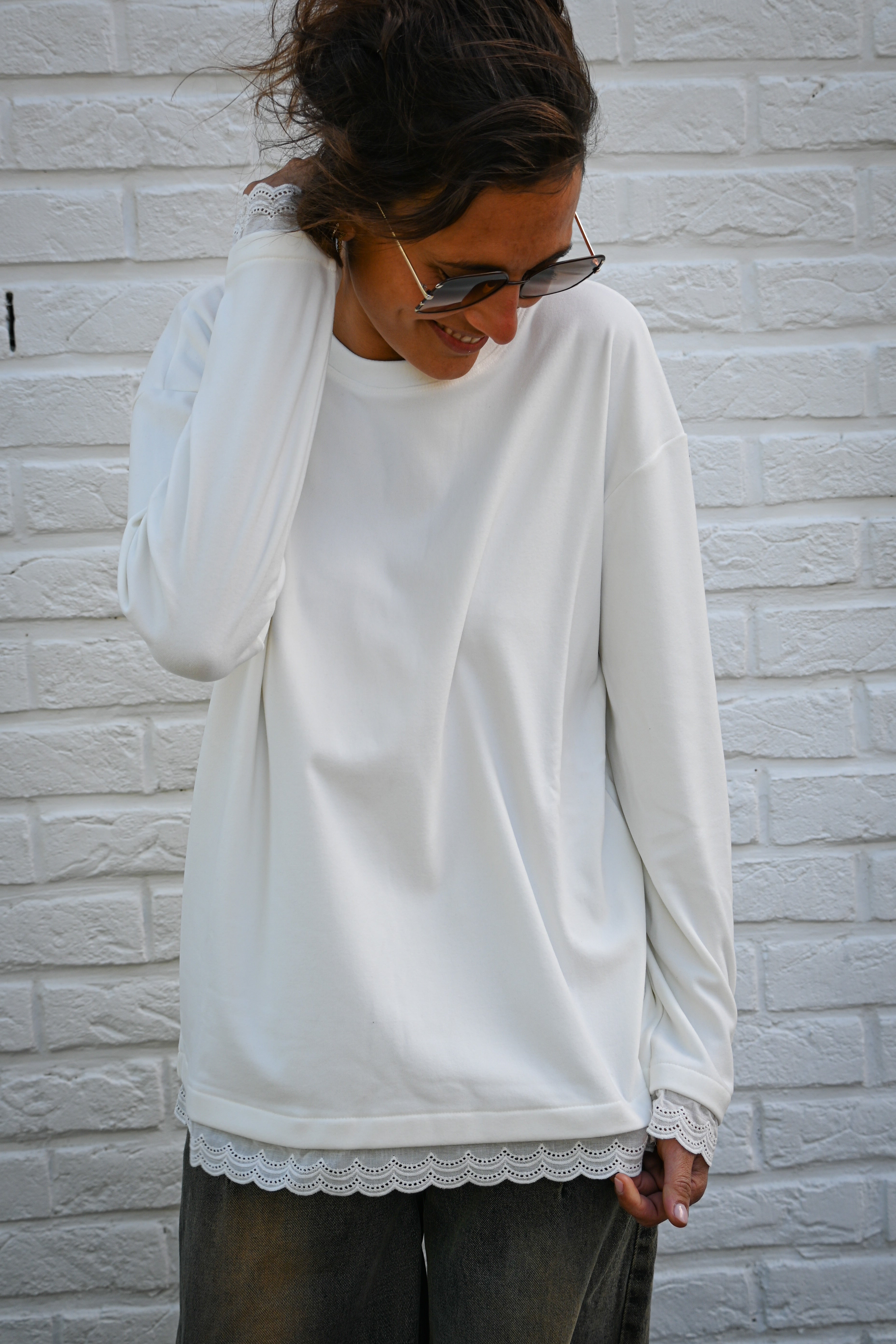 Ce vêtement combine la légèreté d'un t-shirt à manches longues avec la finesse d'un sweat. De couleur blanche, il offre une texture particulièrement douce. Il se démarque par un délicat motif en dentelle placé au bas et sur les manches. Proposé en taille unique, il convient parfaitement aux tailles allant du XS au XL.