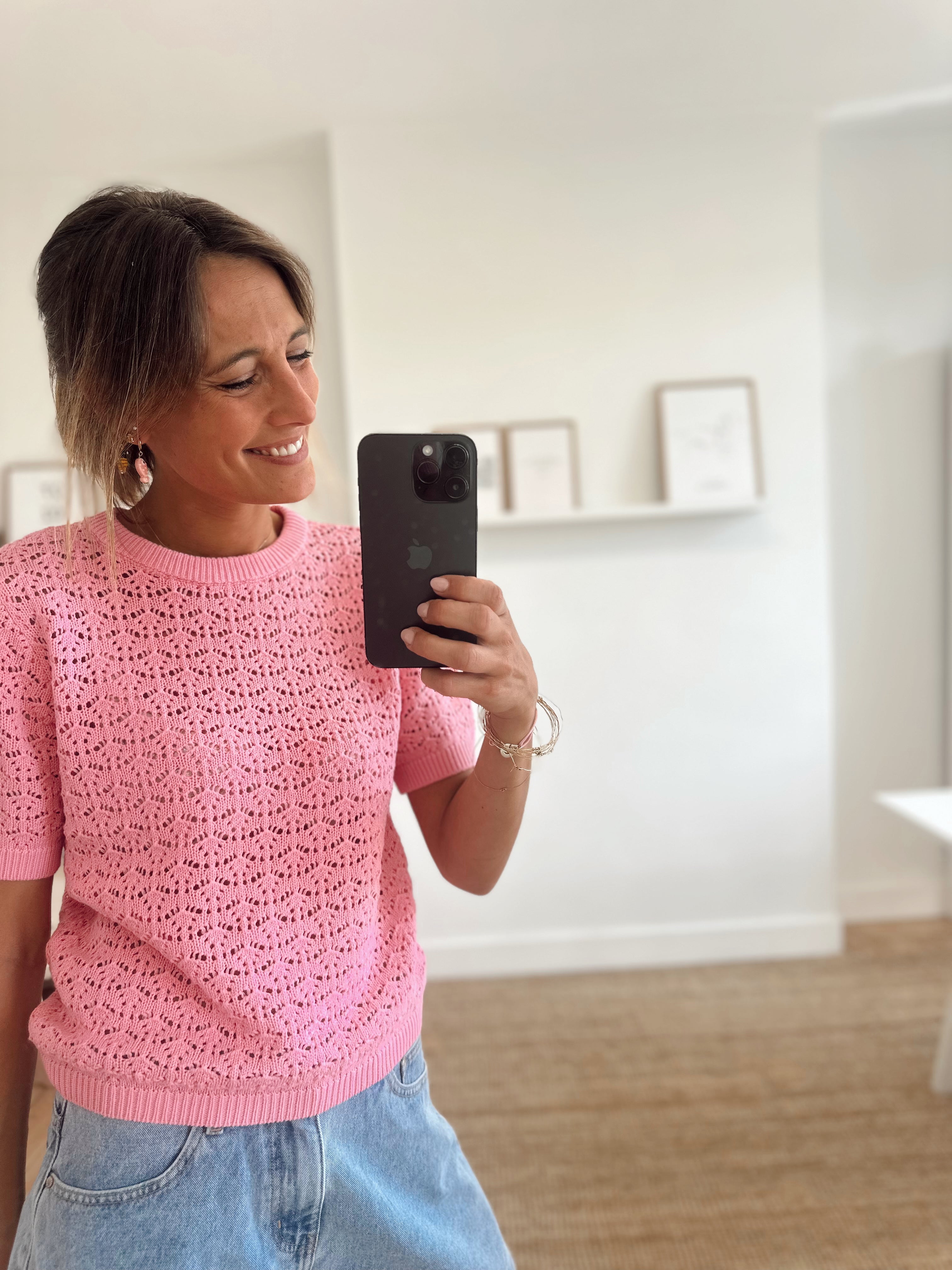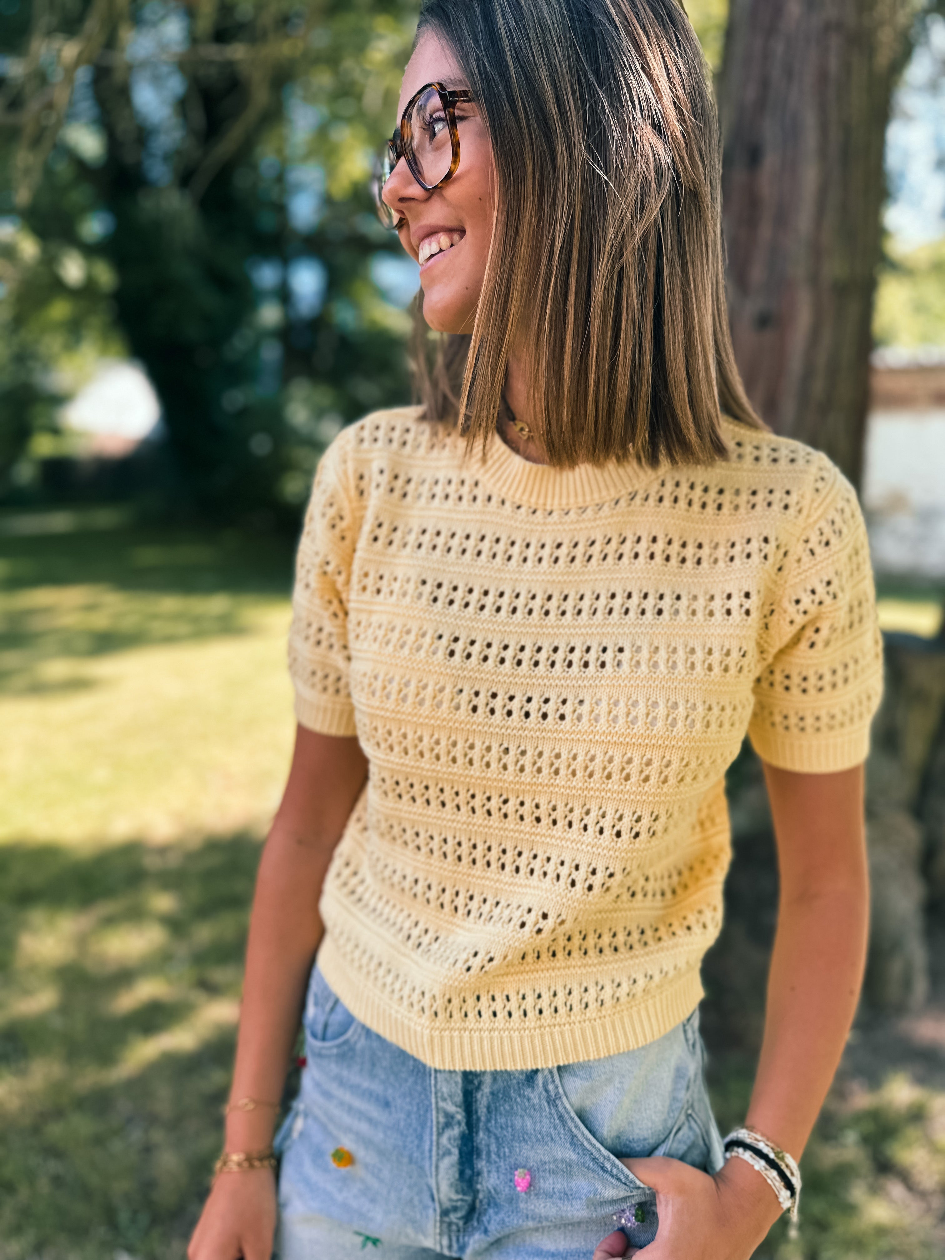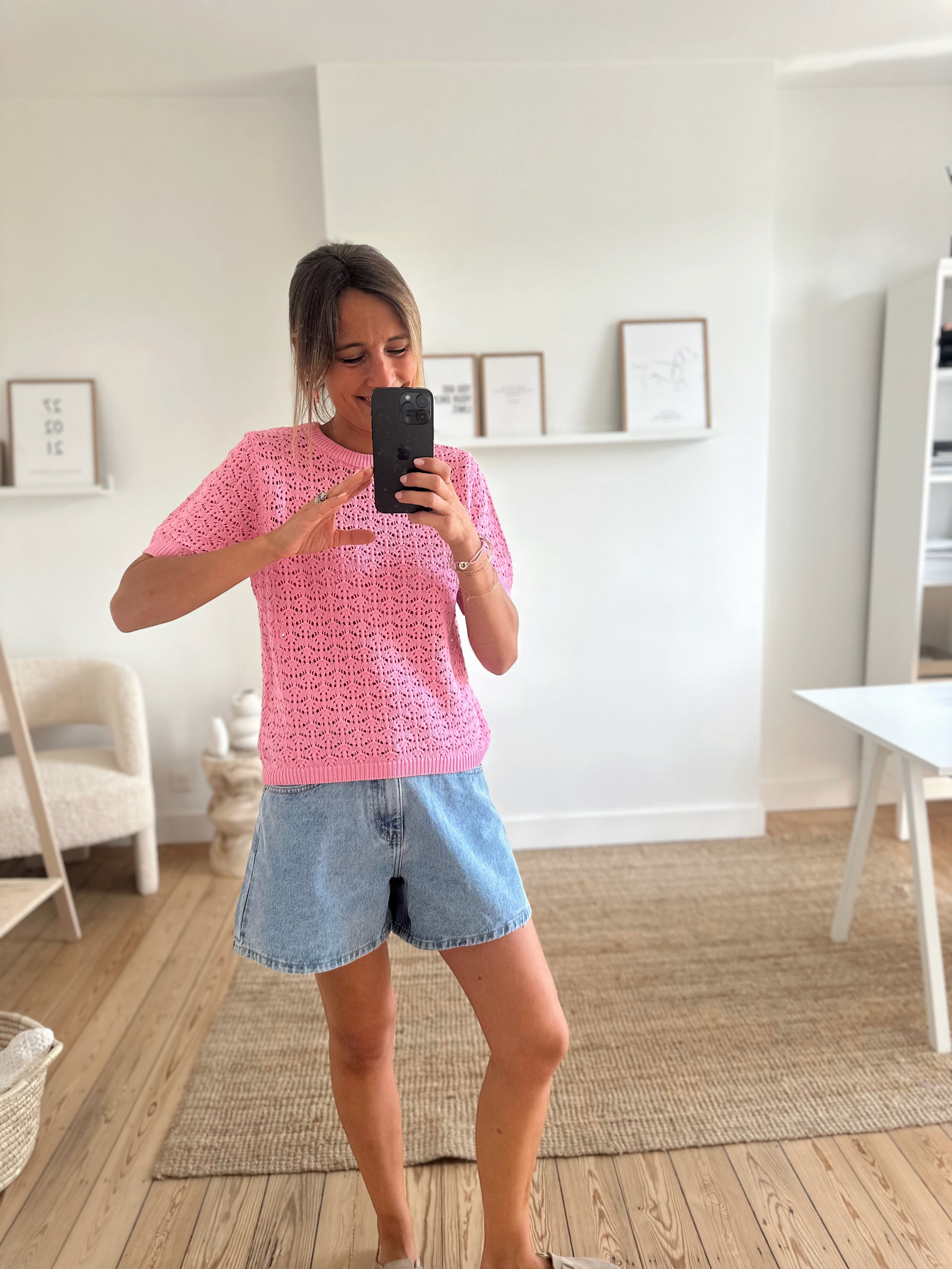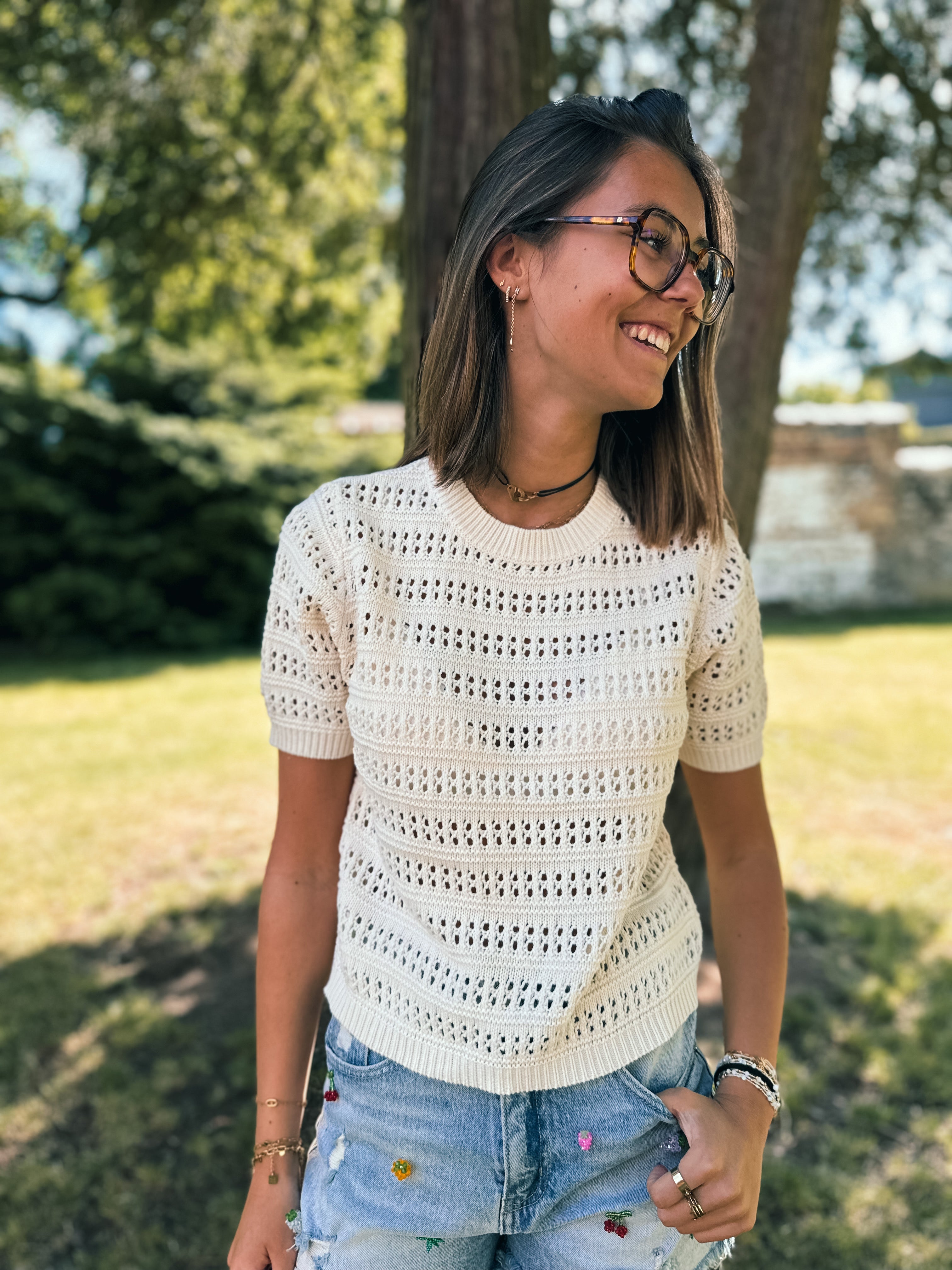 T-shirt manches courtes en crochet, disponible en SM ou ML. Le mannequin porte la taille SM.