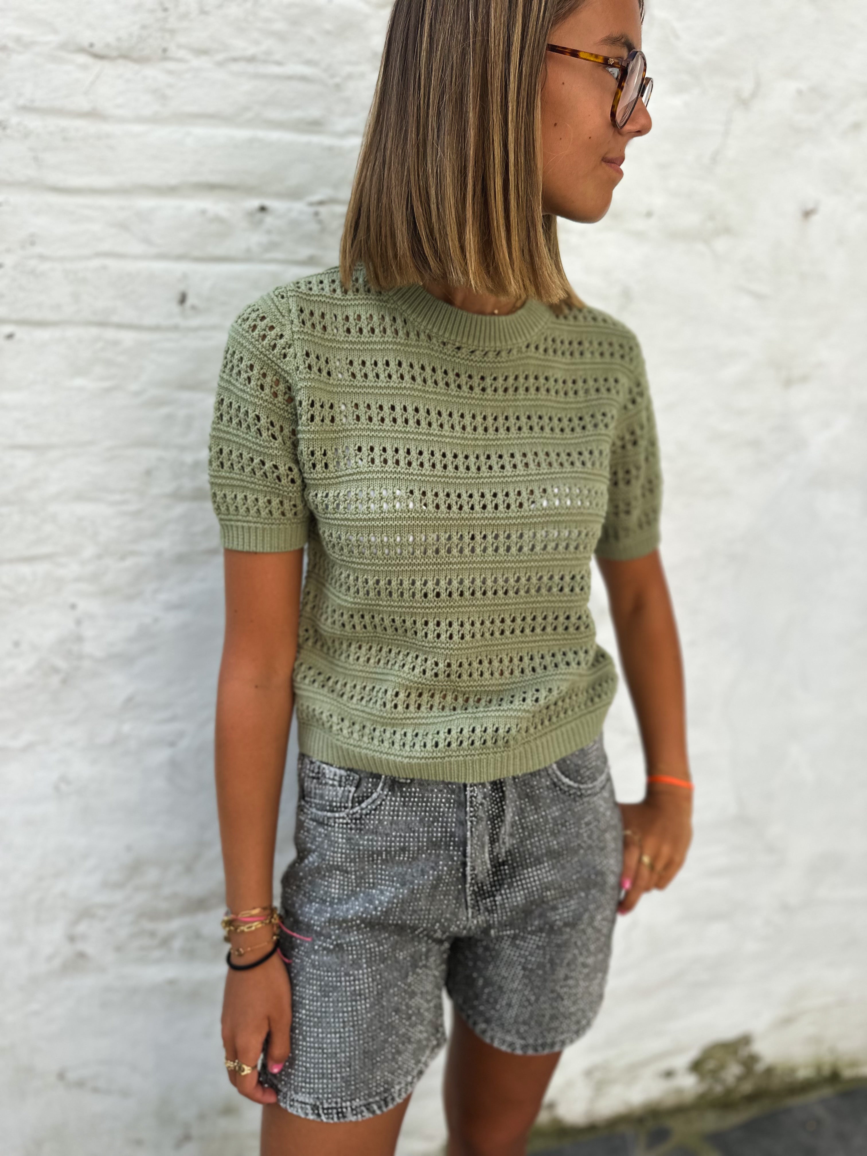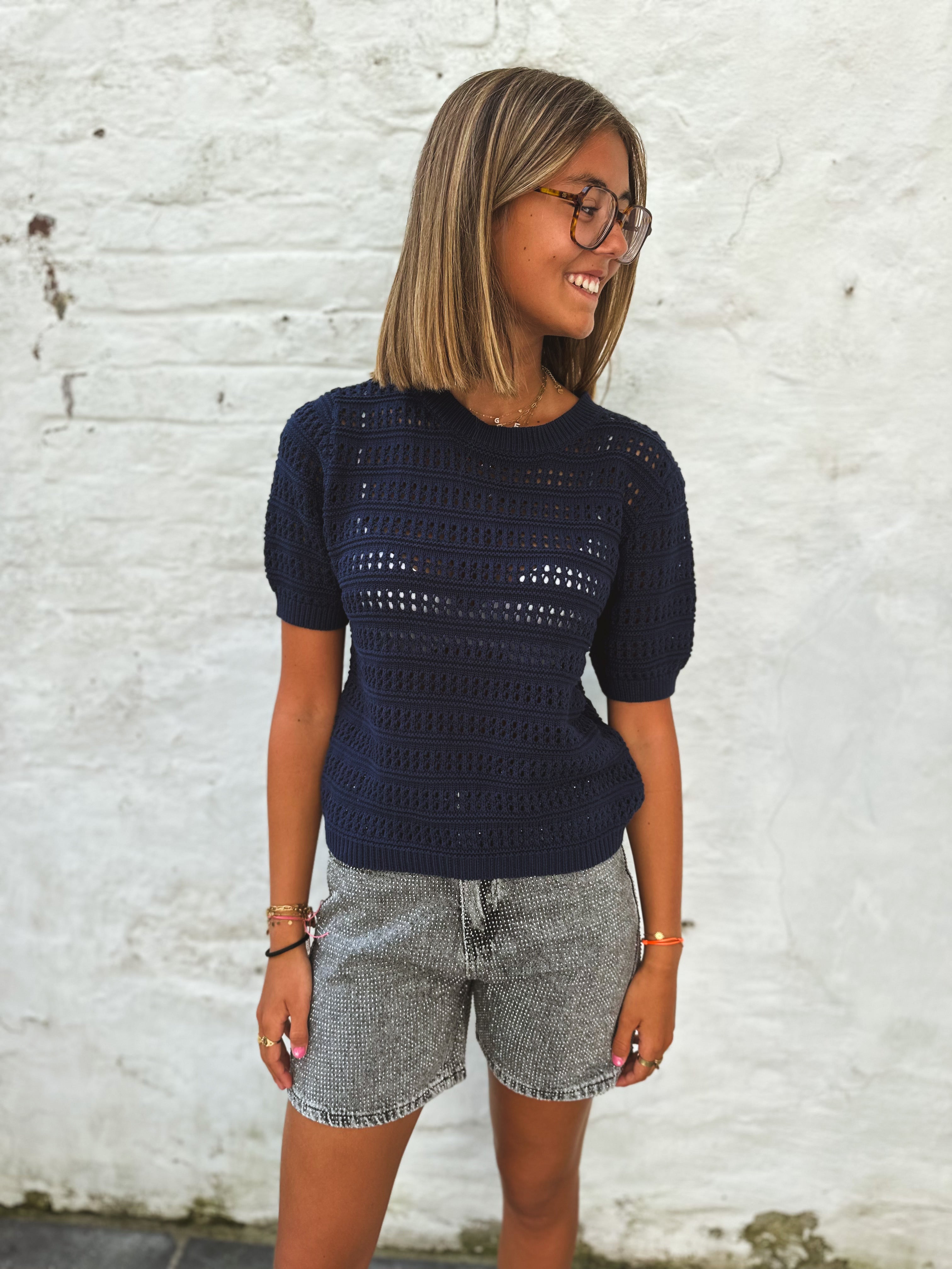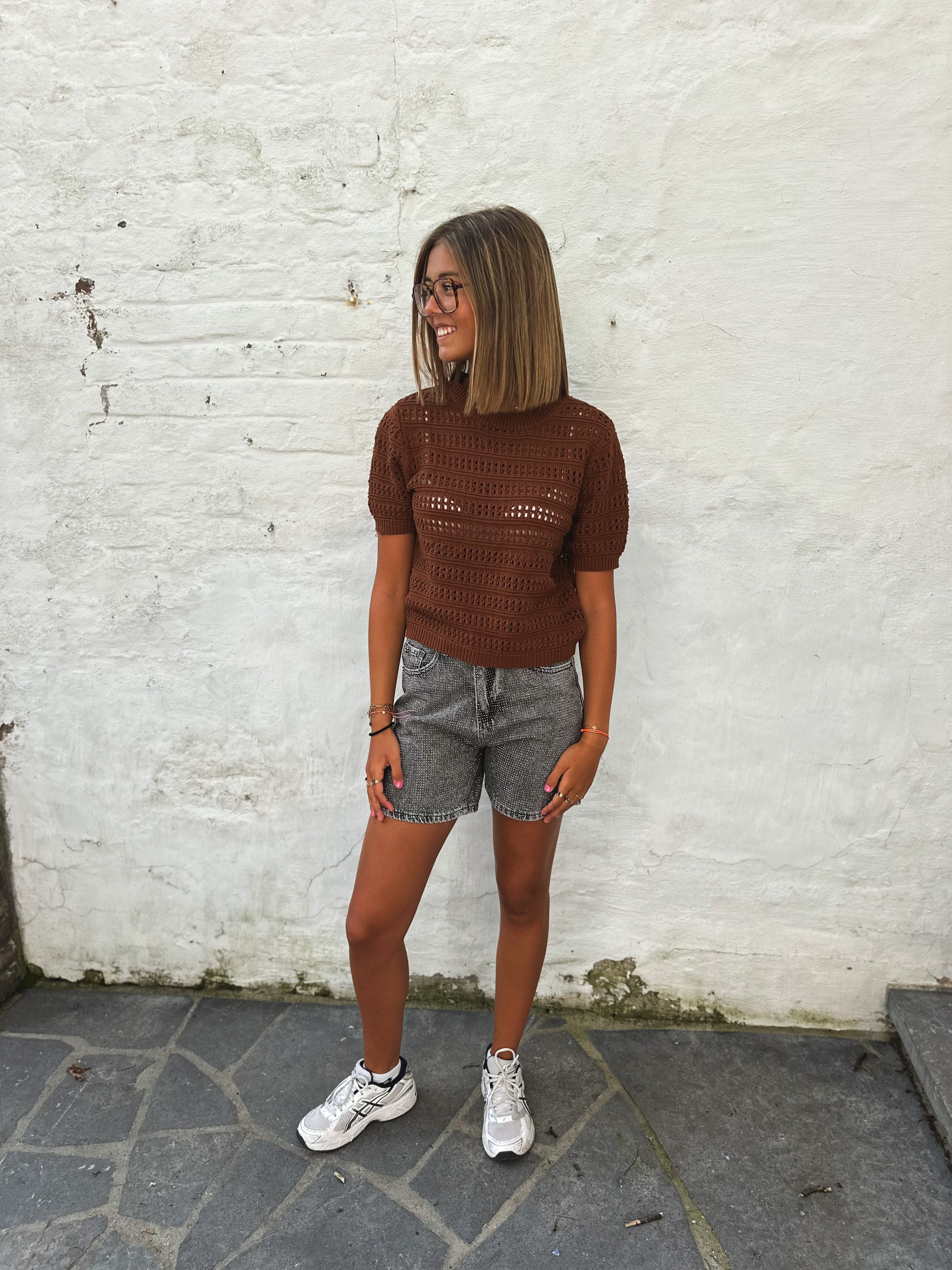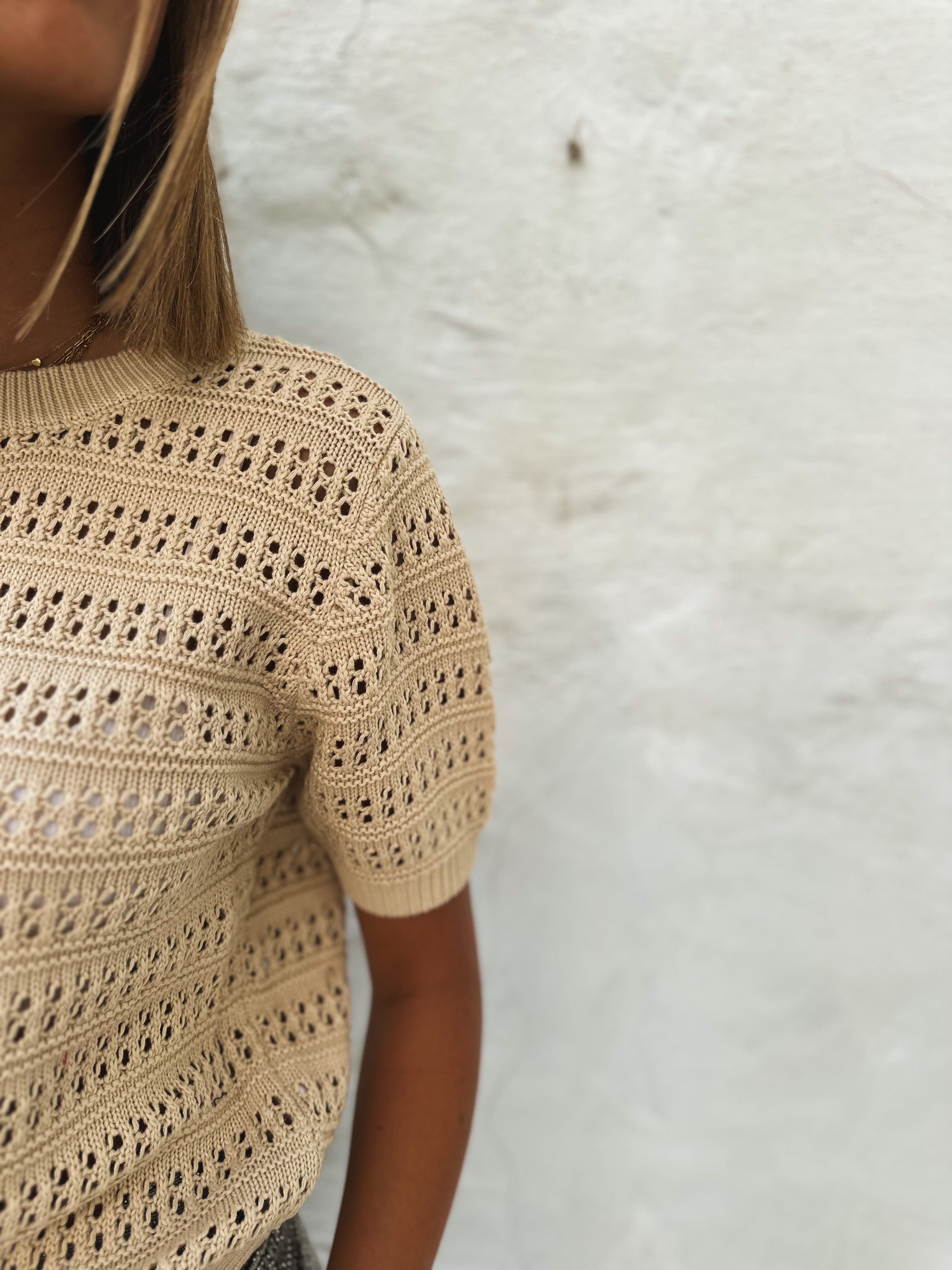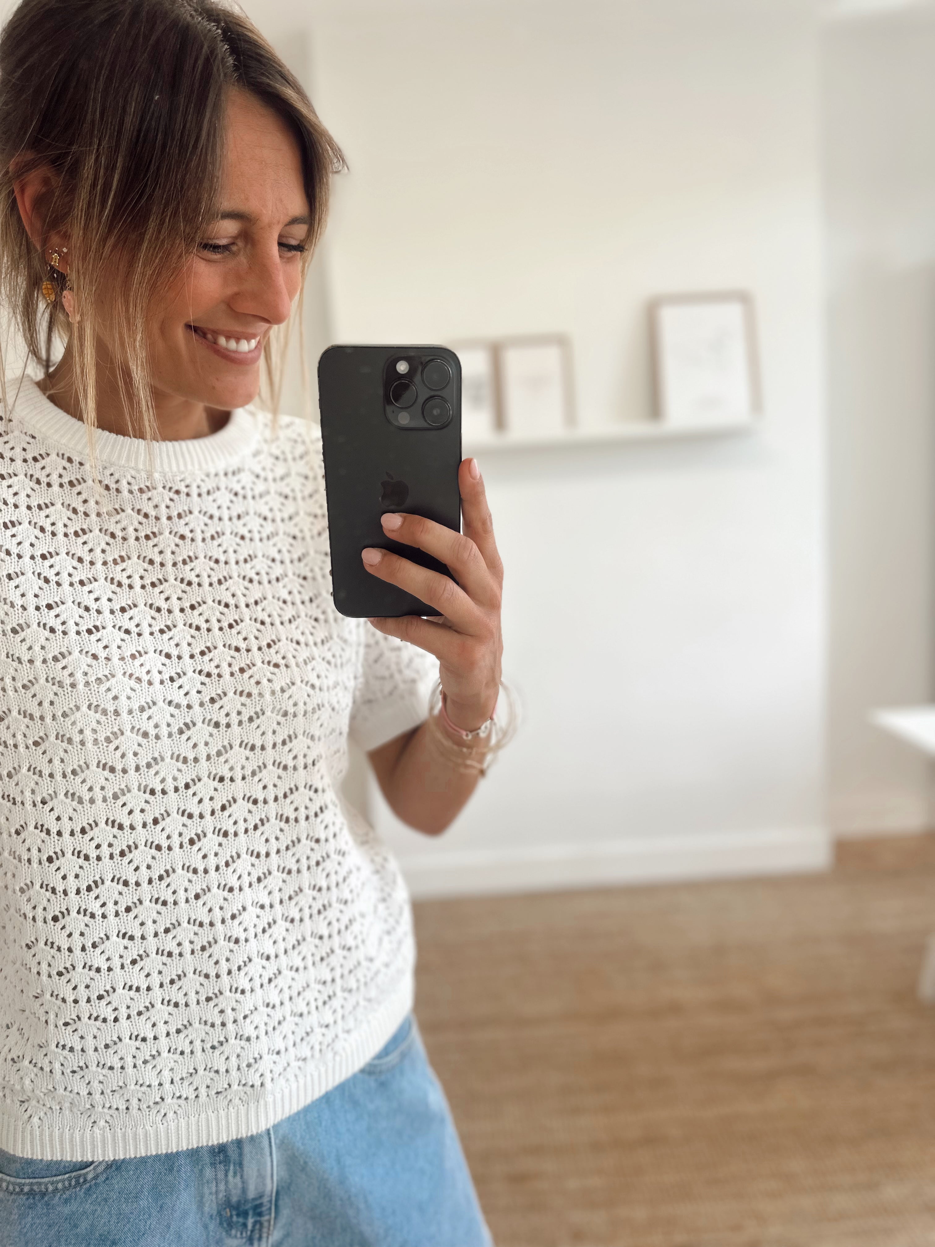 T-shirt manches courtes en crochet, disponible en SM ou ML. Le mannequin porte la taille SM.