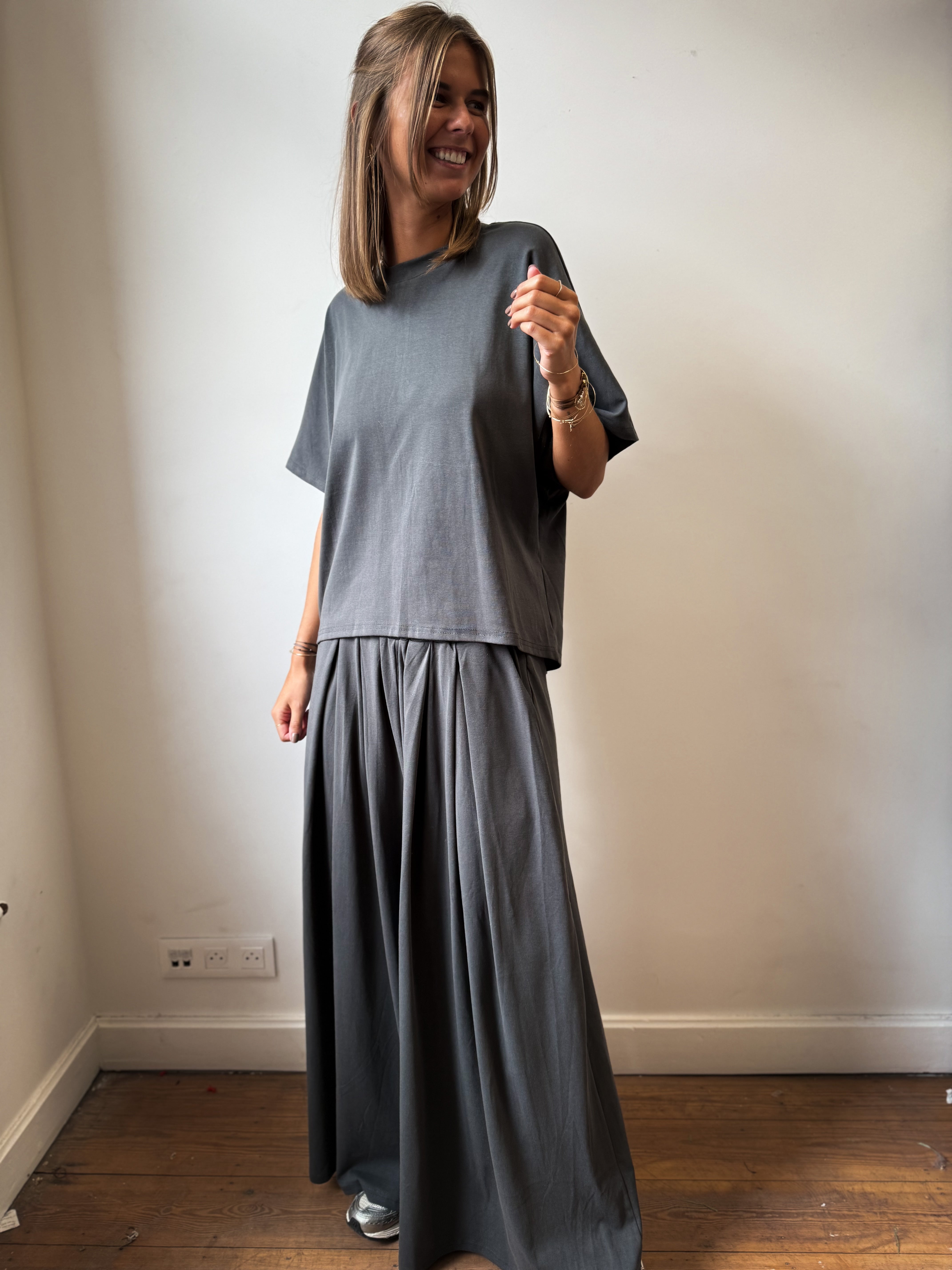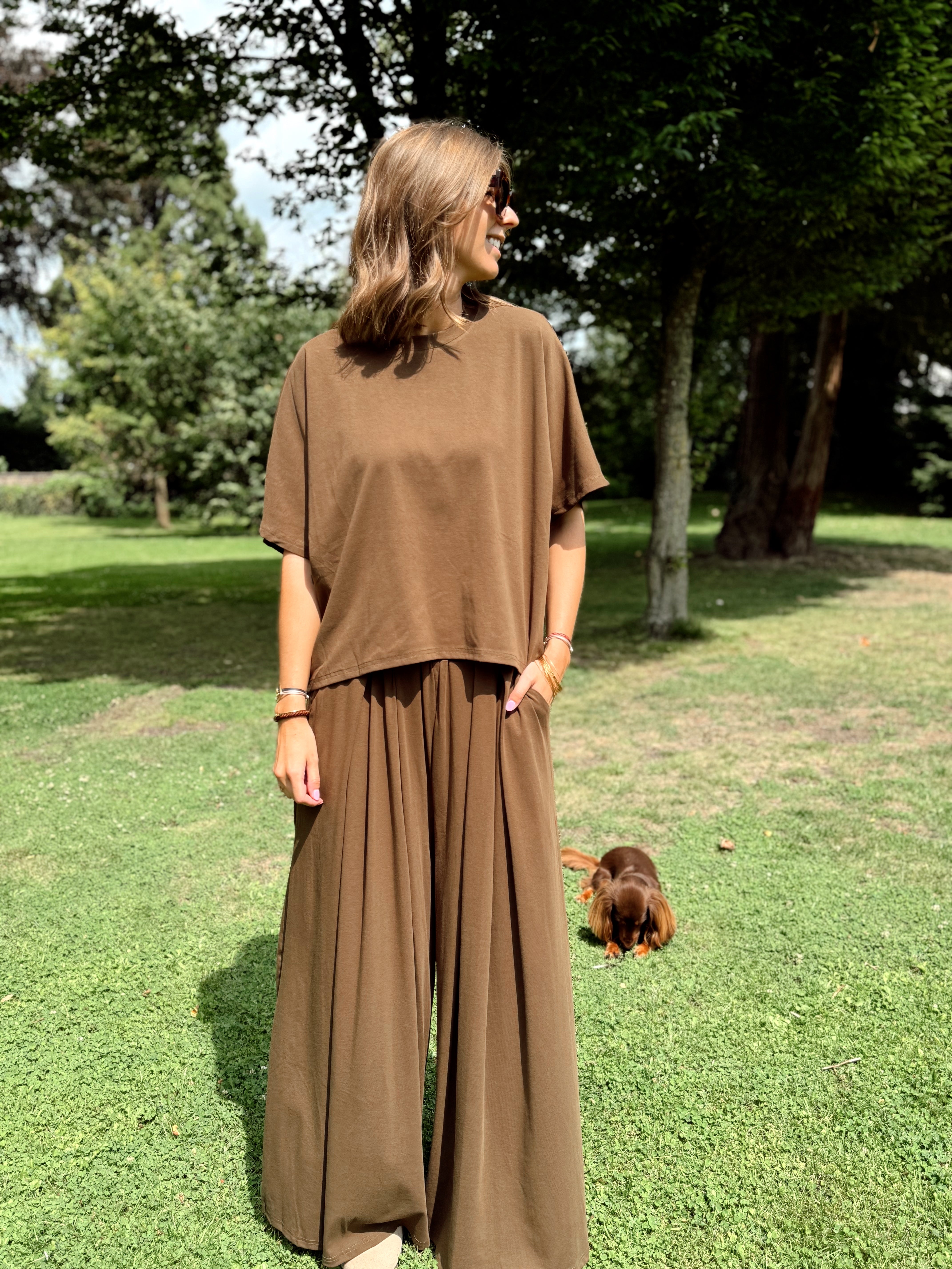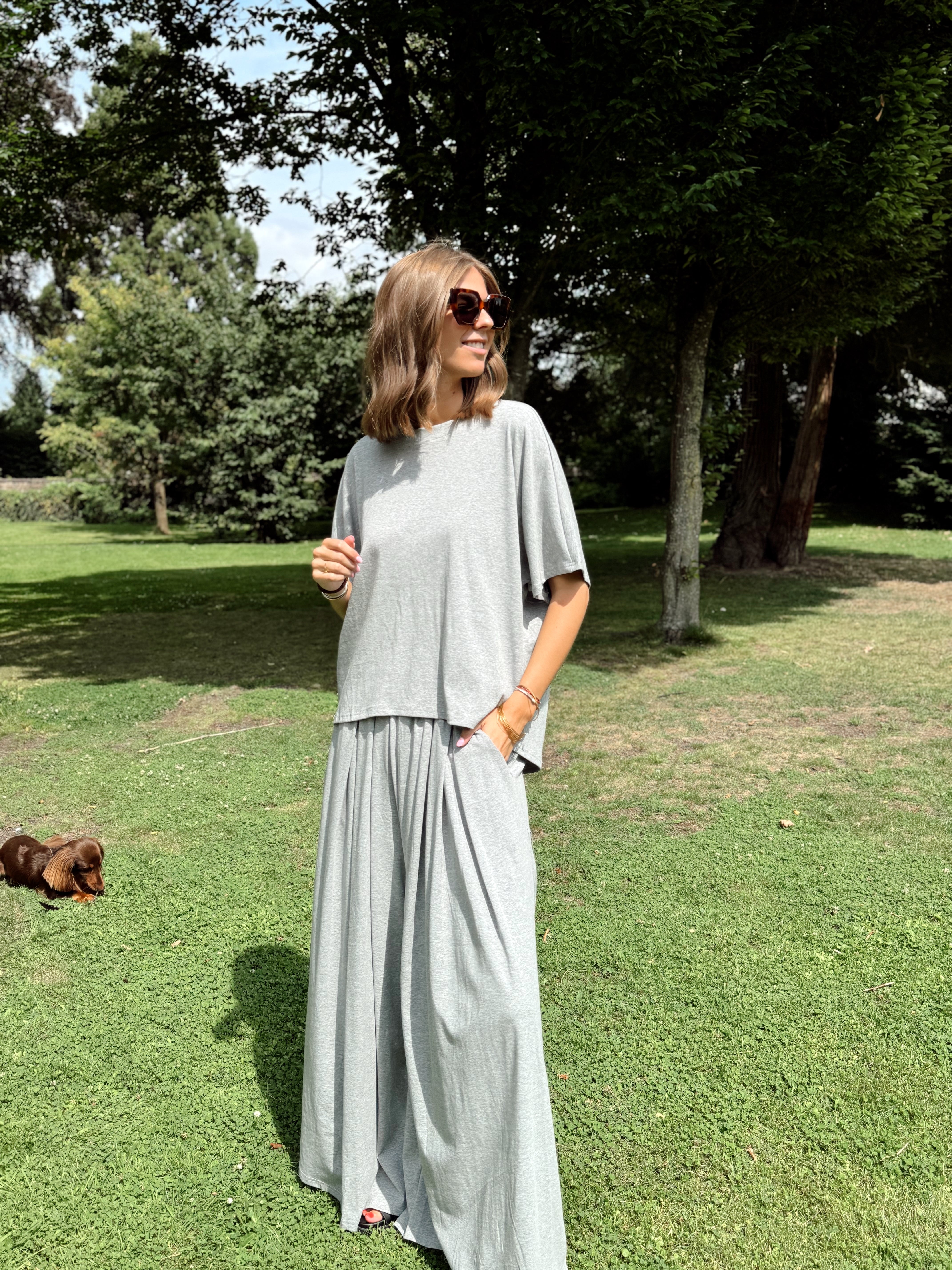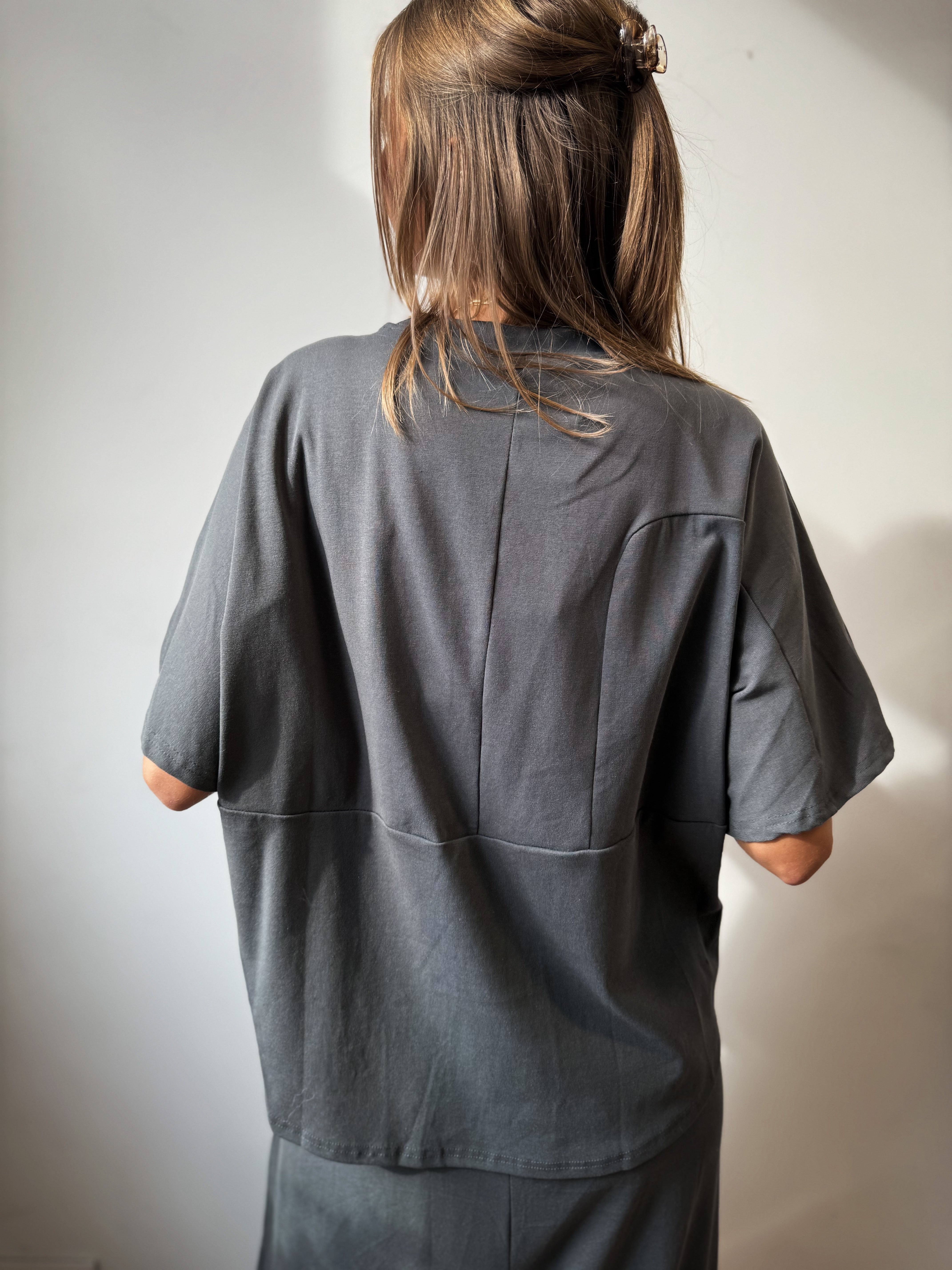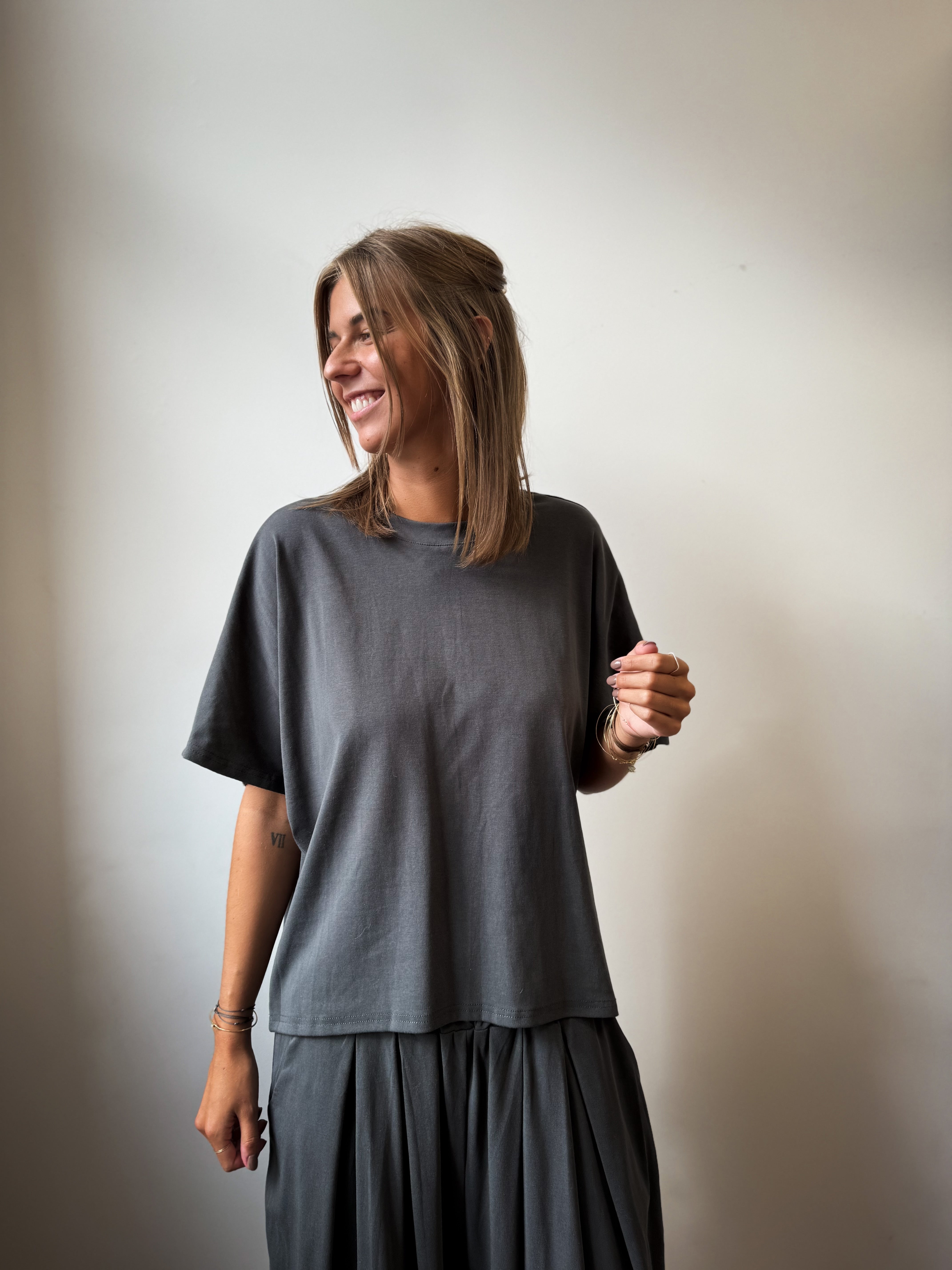 Le T-shirt PAULA oversize présente un col rond et une coupe plus longue à l'arrière qu'à l'avant. Disponible en taille unique, il convient parfaitement à toutes les morphologies pour un confort optimal et un style décontracté.