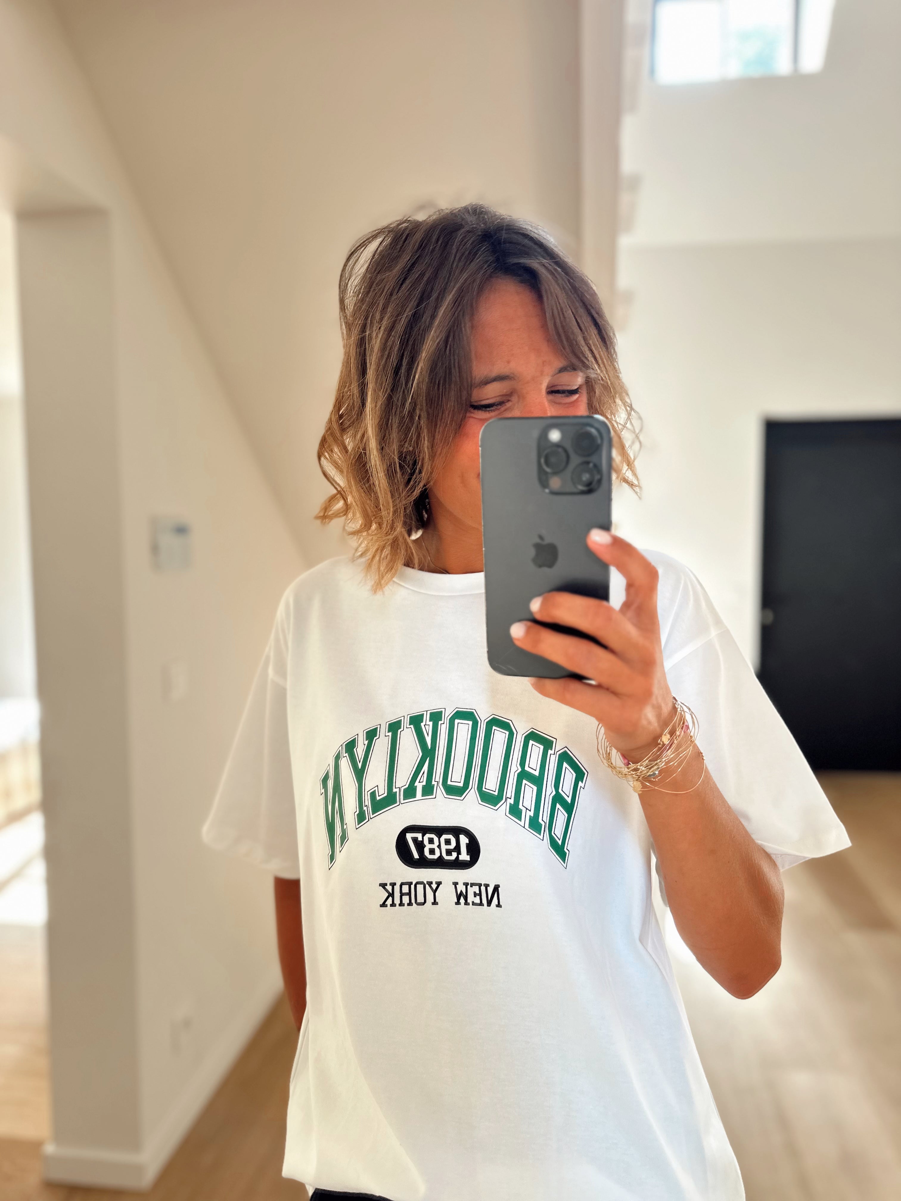 Ce t-shirt blanc arbore des inscriptions en vert et noir, offrant un style unique. Il est proposé en tailles S, M et L pour un ajustement parfait.