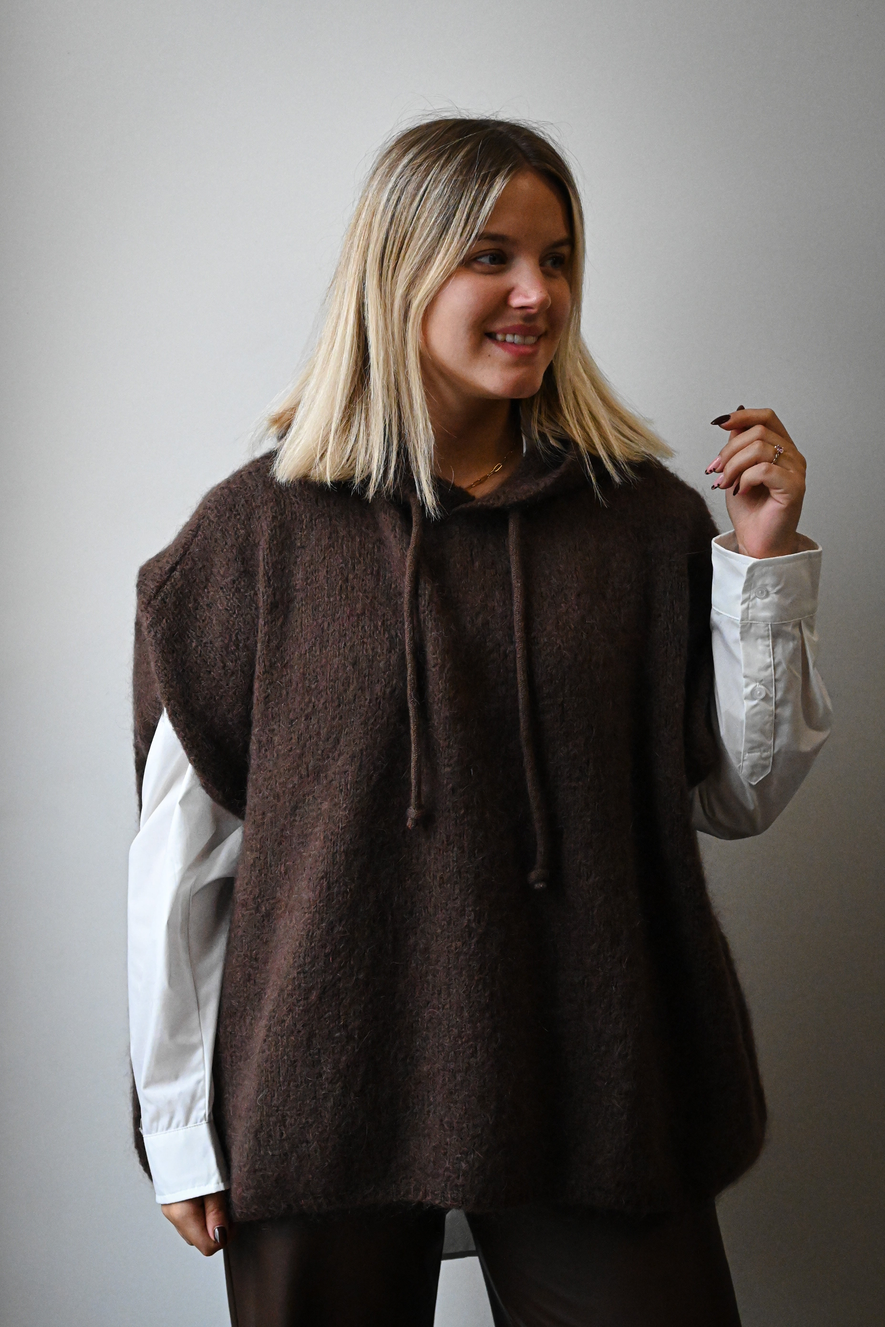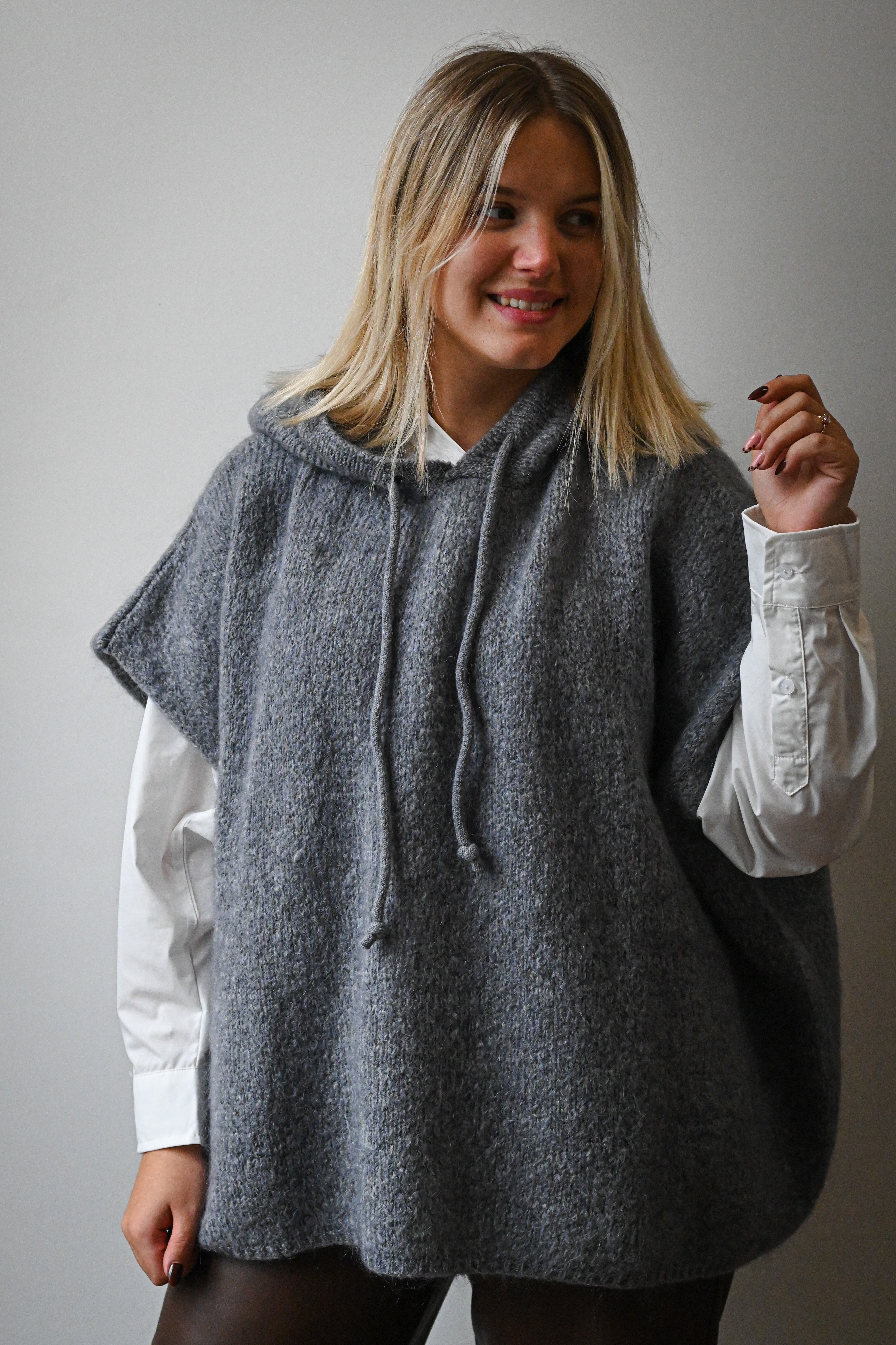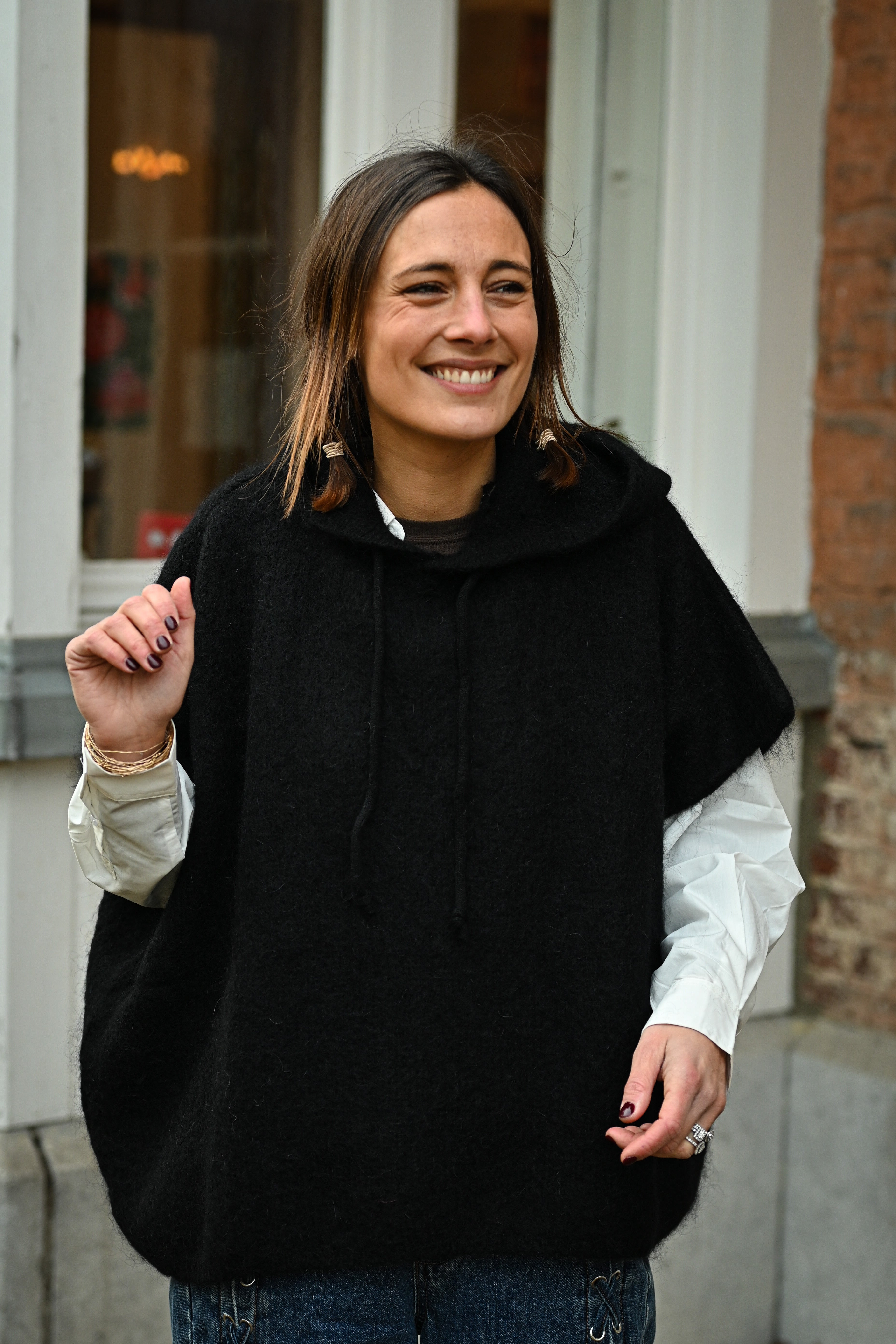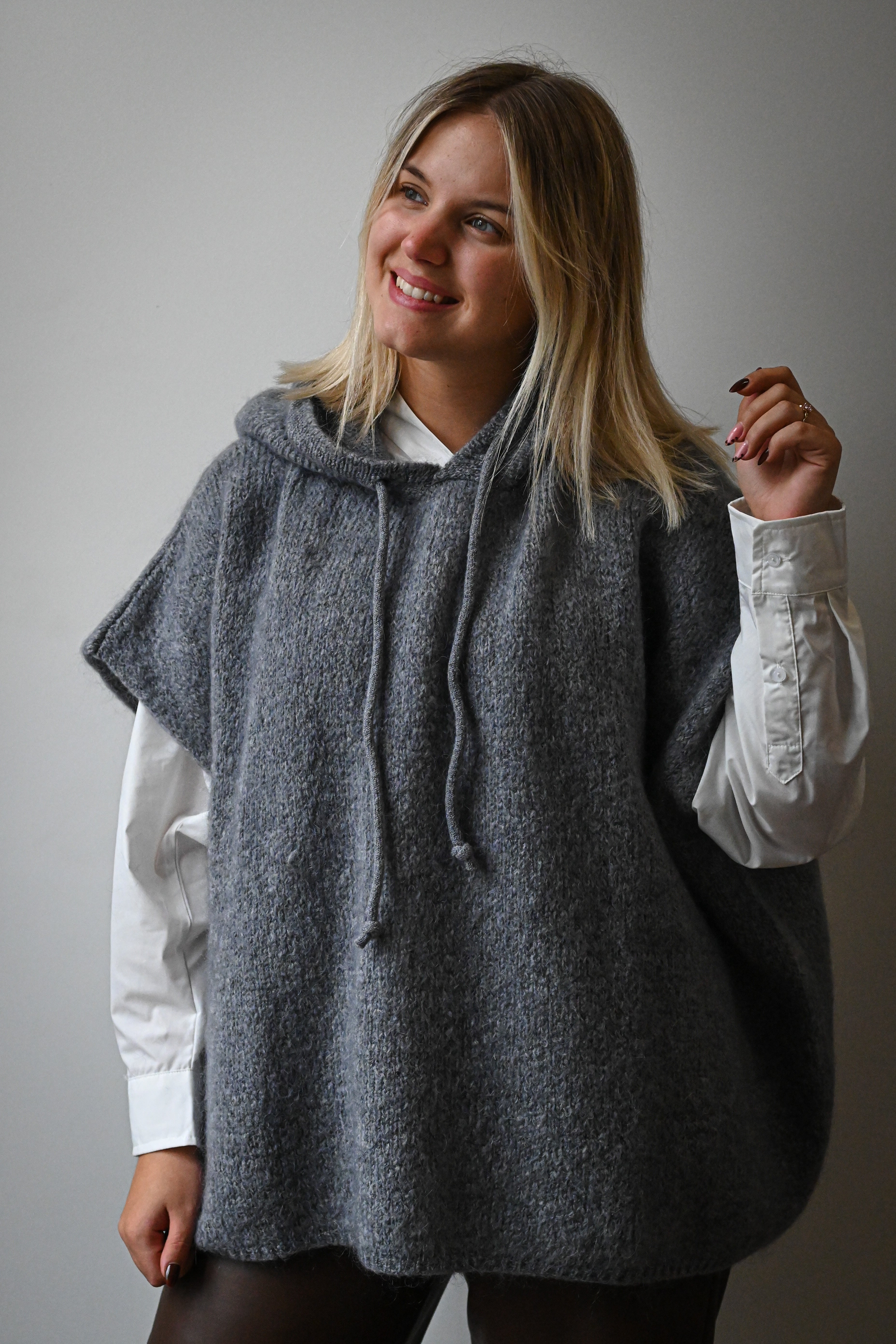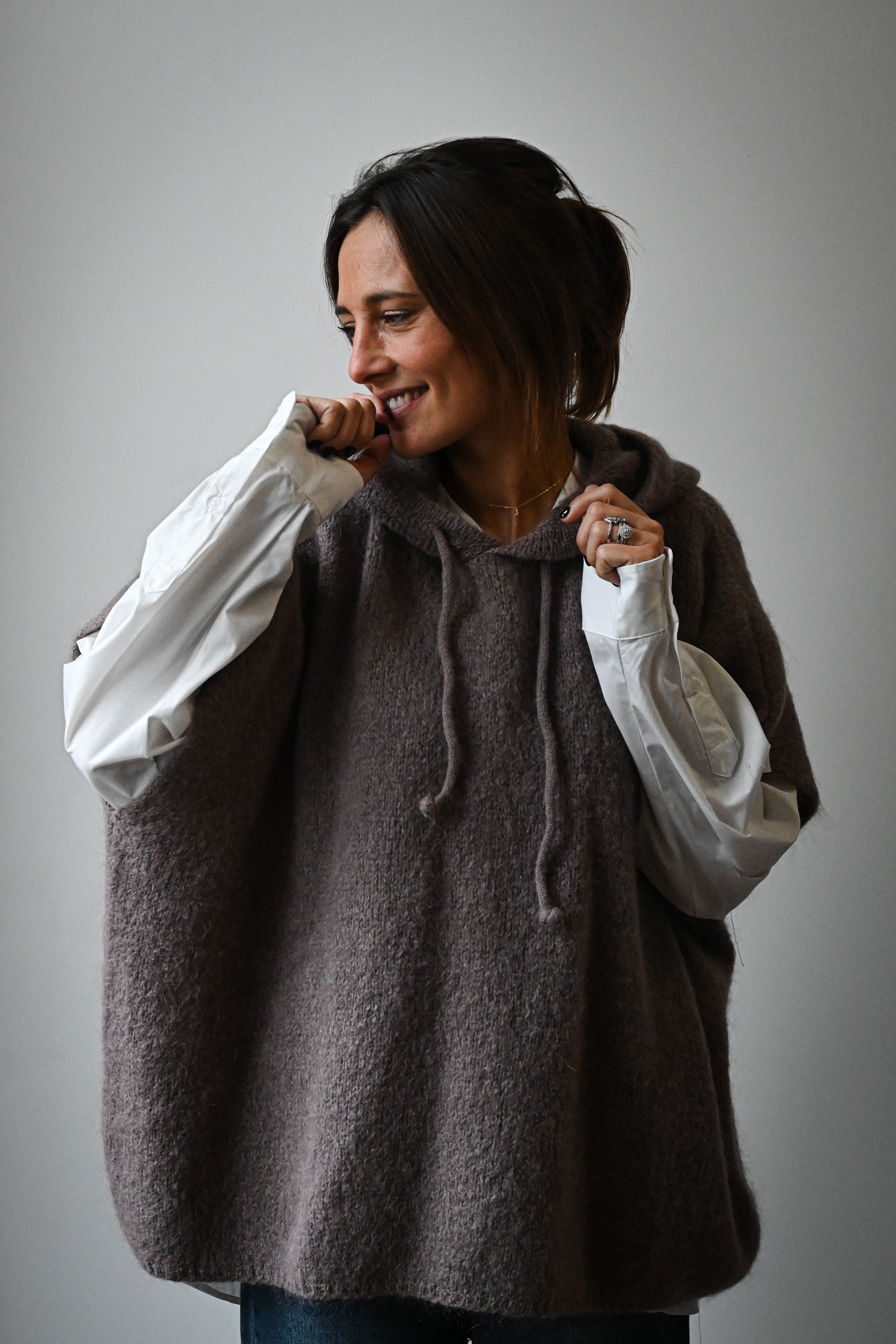 Adoptez ce pull cape chic, équipé d'une capuche et de cordons fonctionnels, créé sans manches pour un look distinctif et agréable à porter. Sa taille unique s’adapte facilement du 34 au 42.