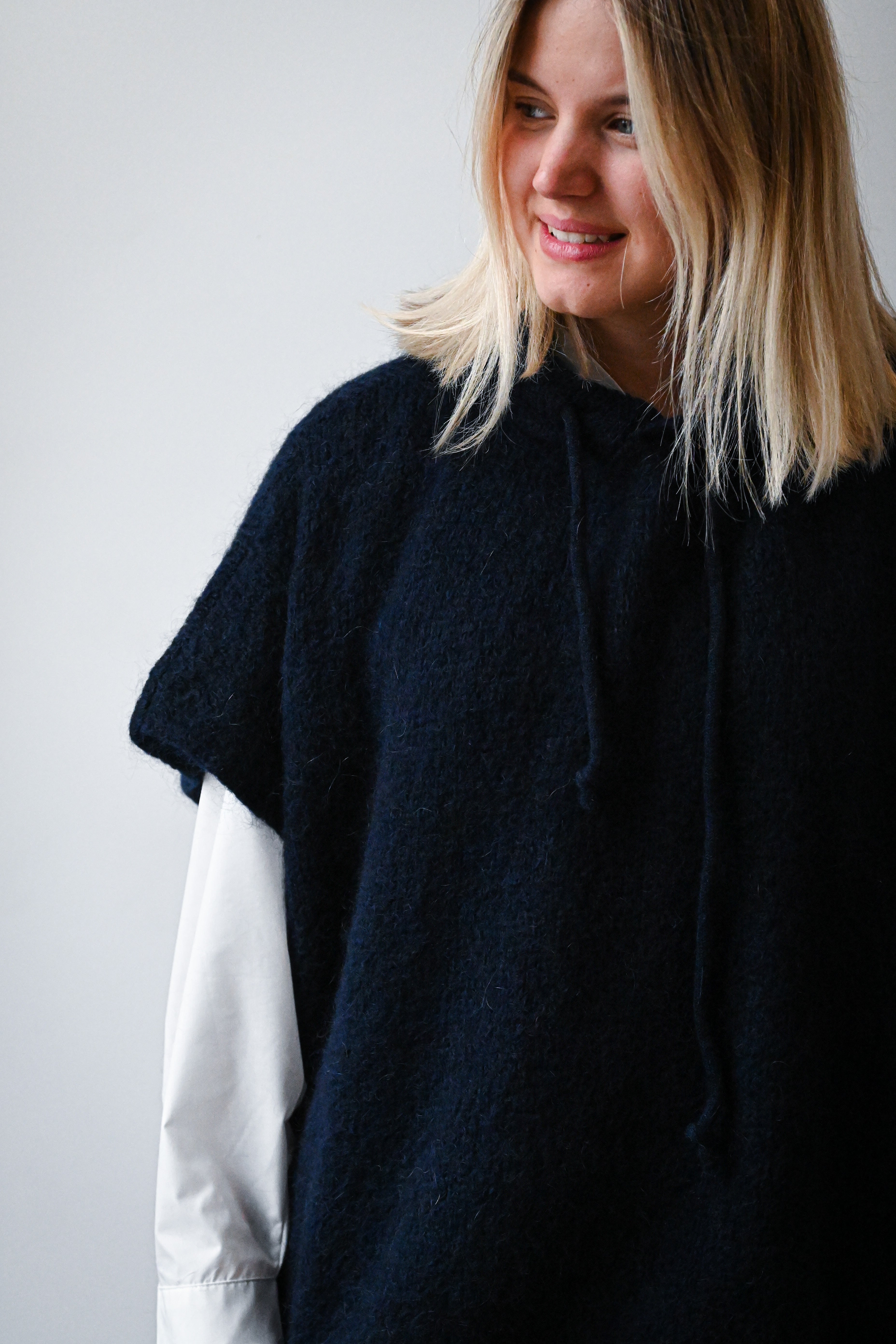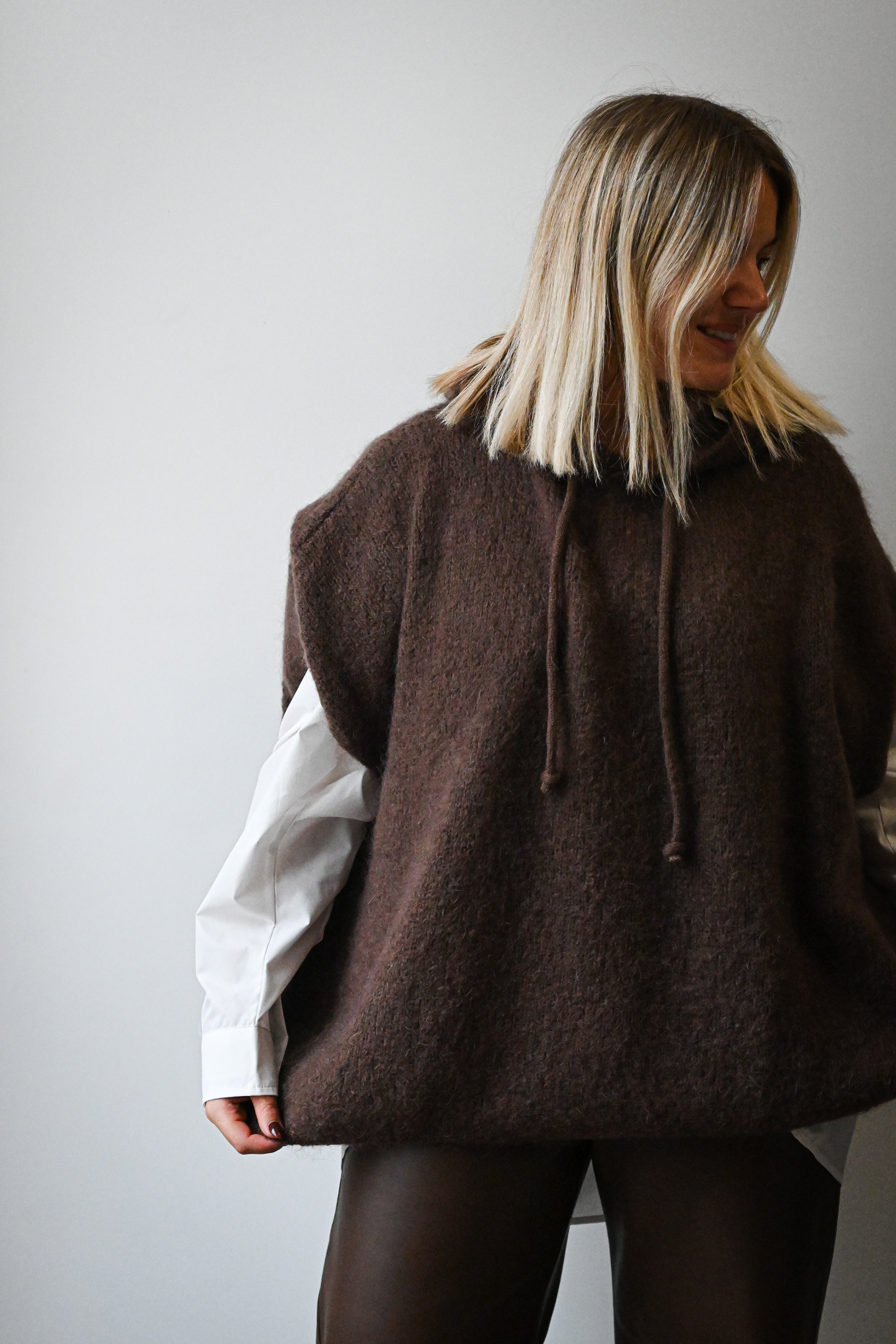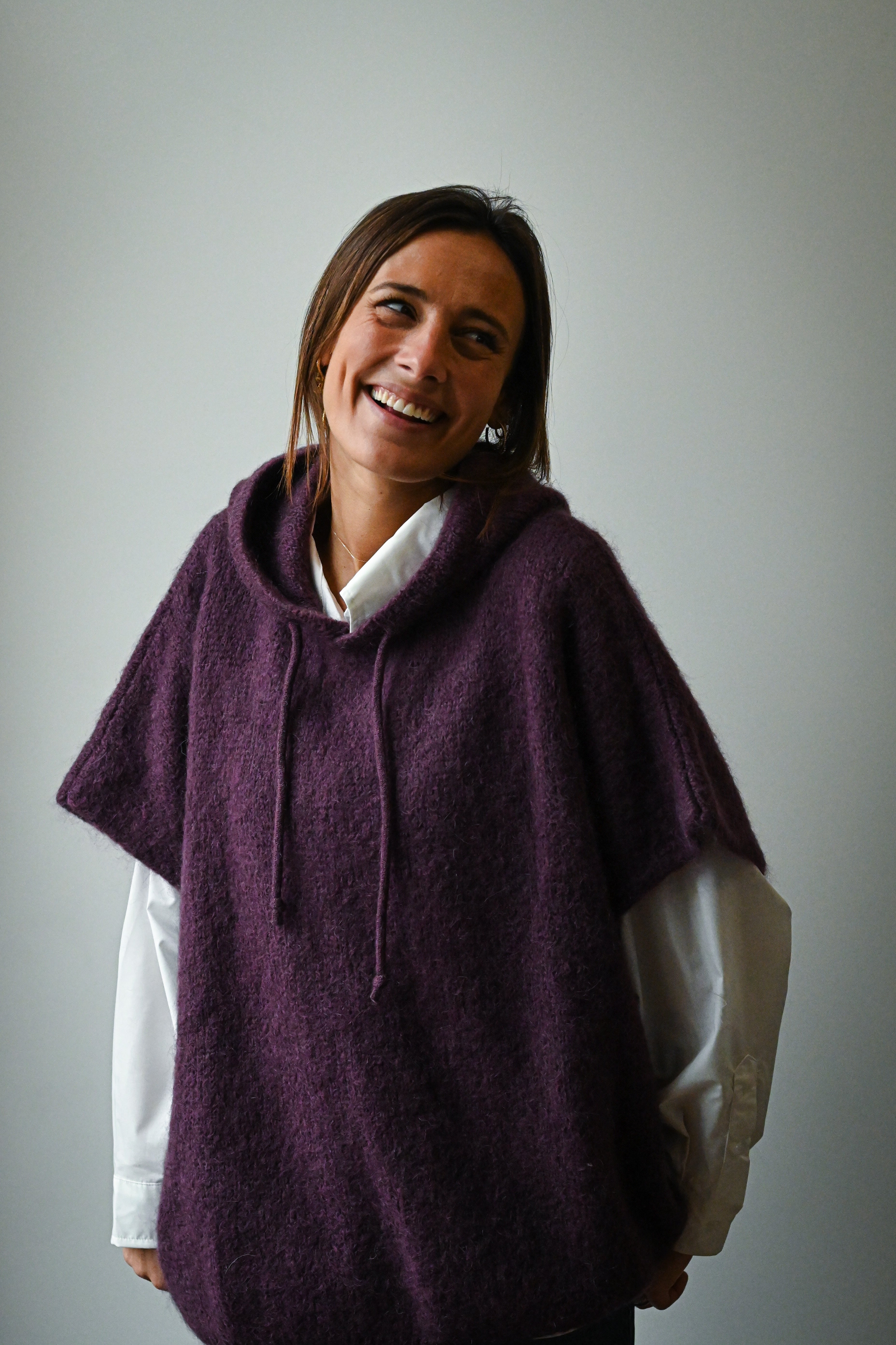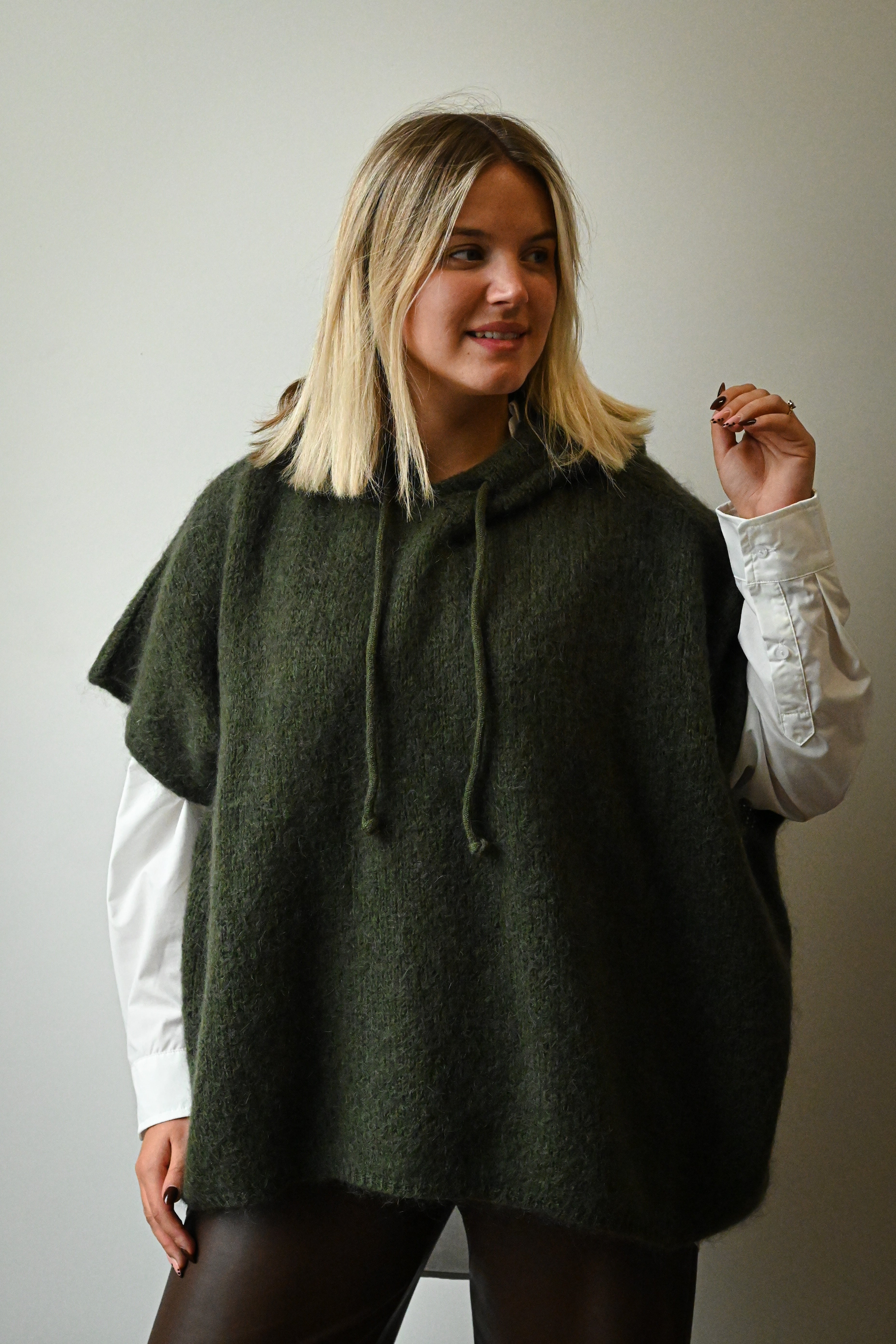 Adoptez ce pull cape chic, équipé d'une capuche et de cordons fonctionnels, créé sans manches pour un look distinctif et agréable à porter. Sa taille unique s’adapte facilement du 34 au 42.