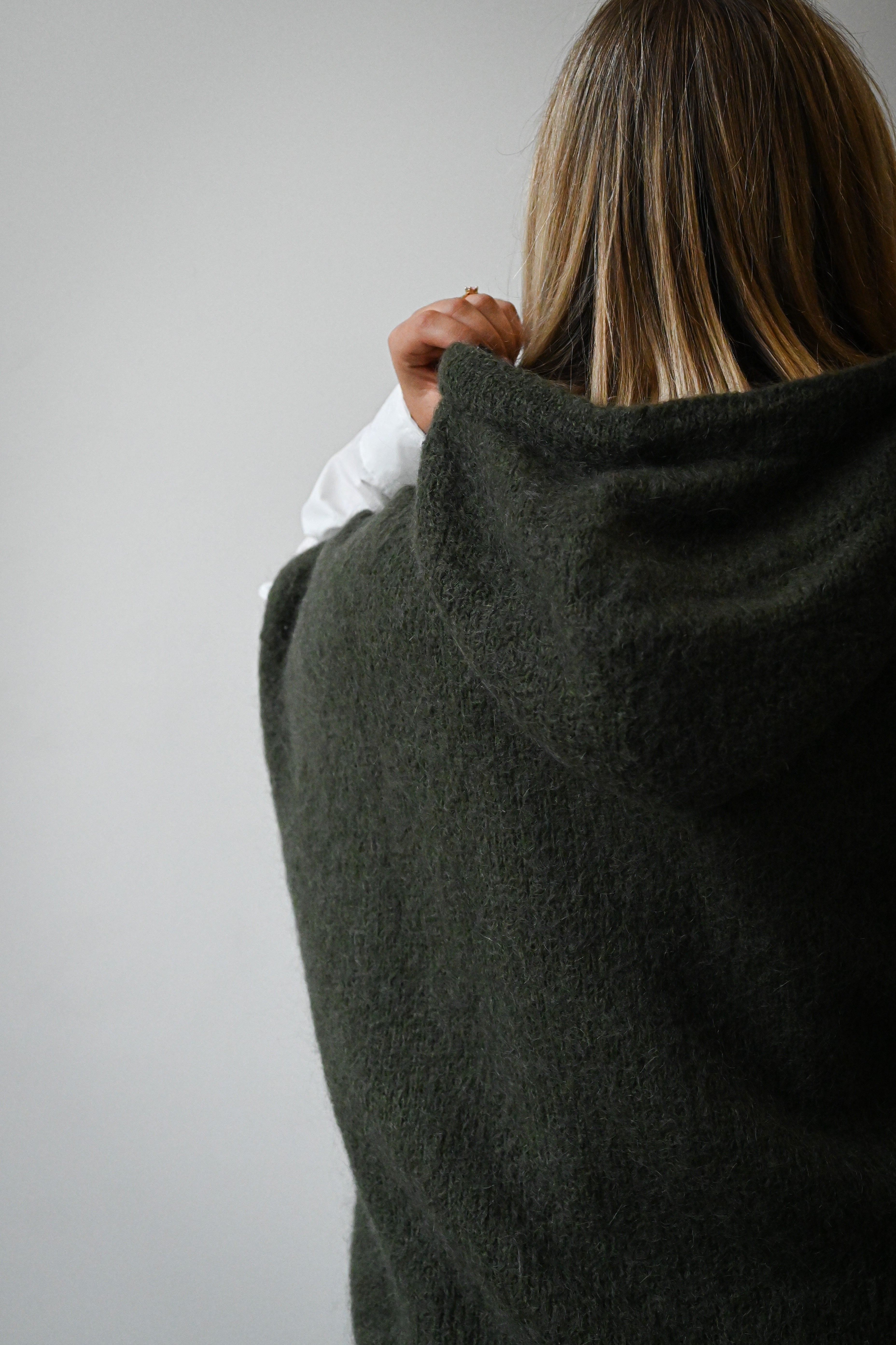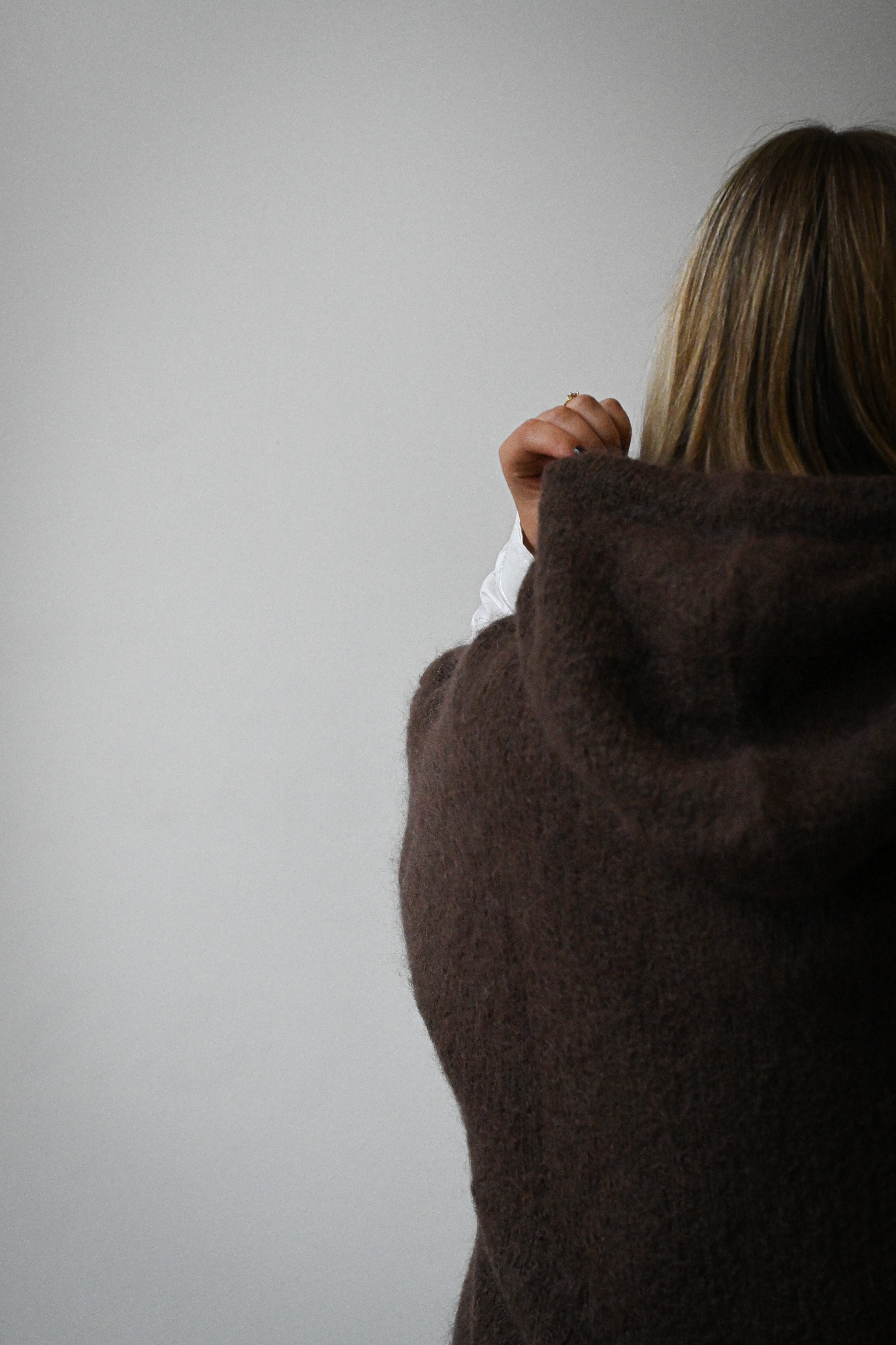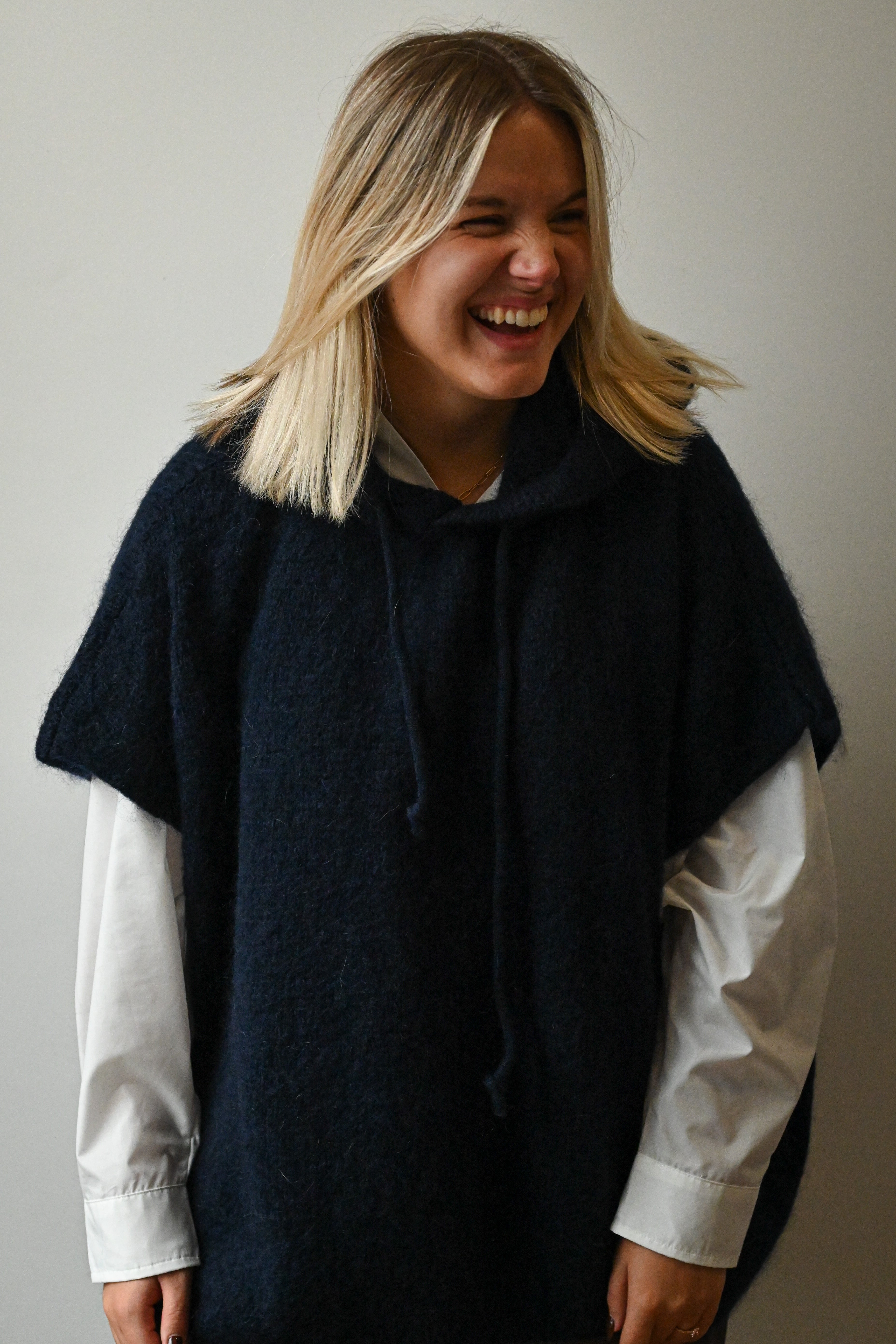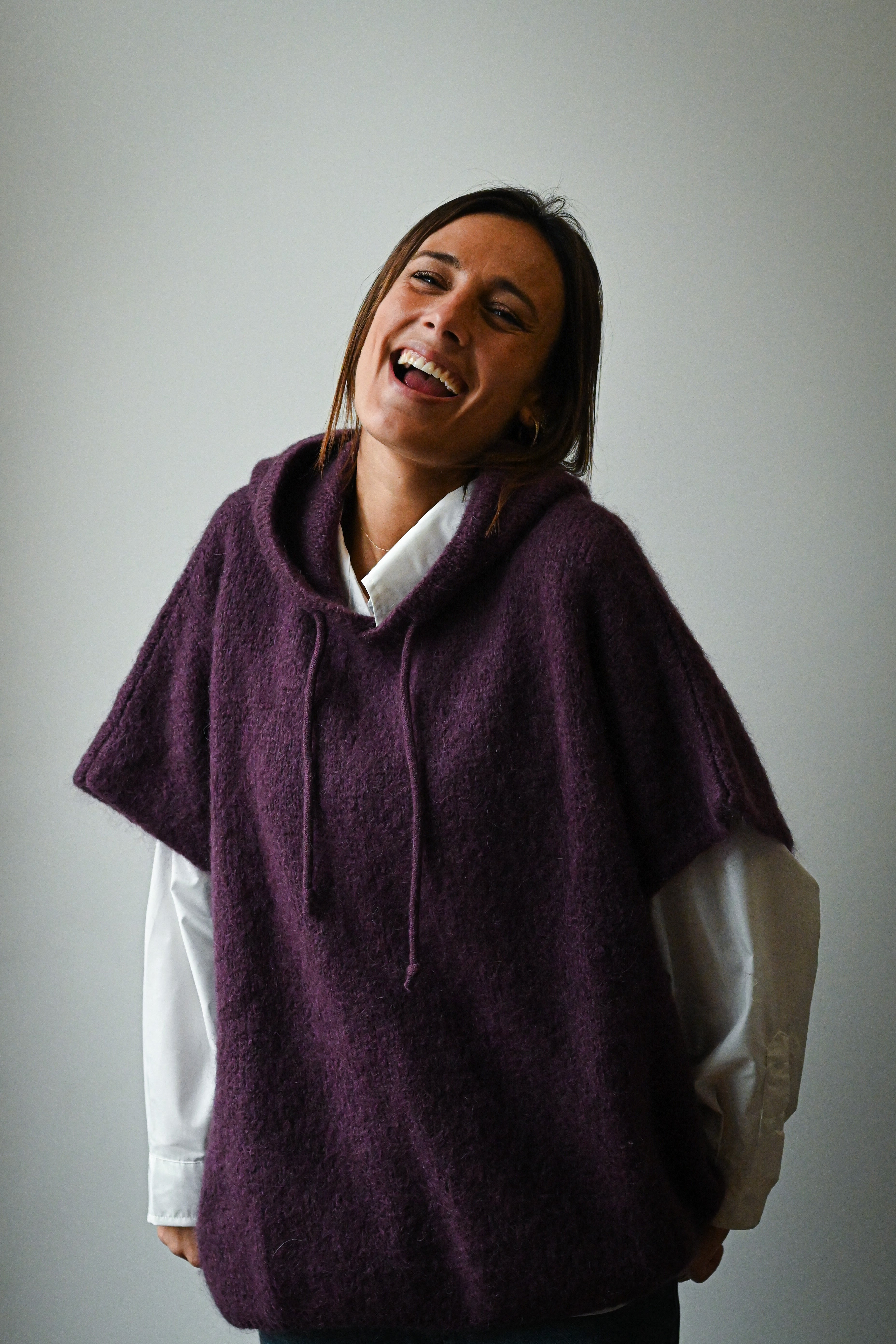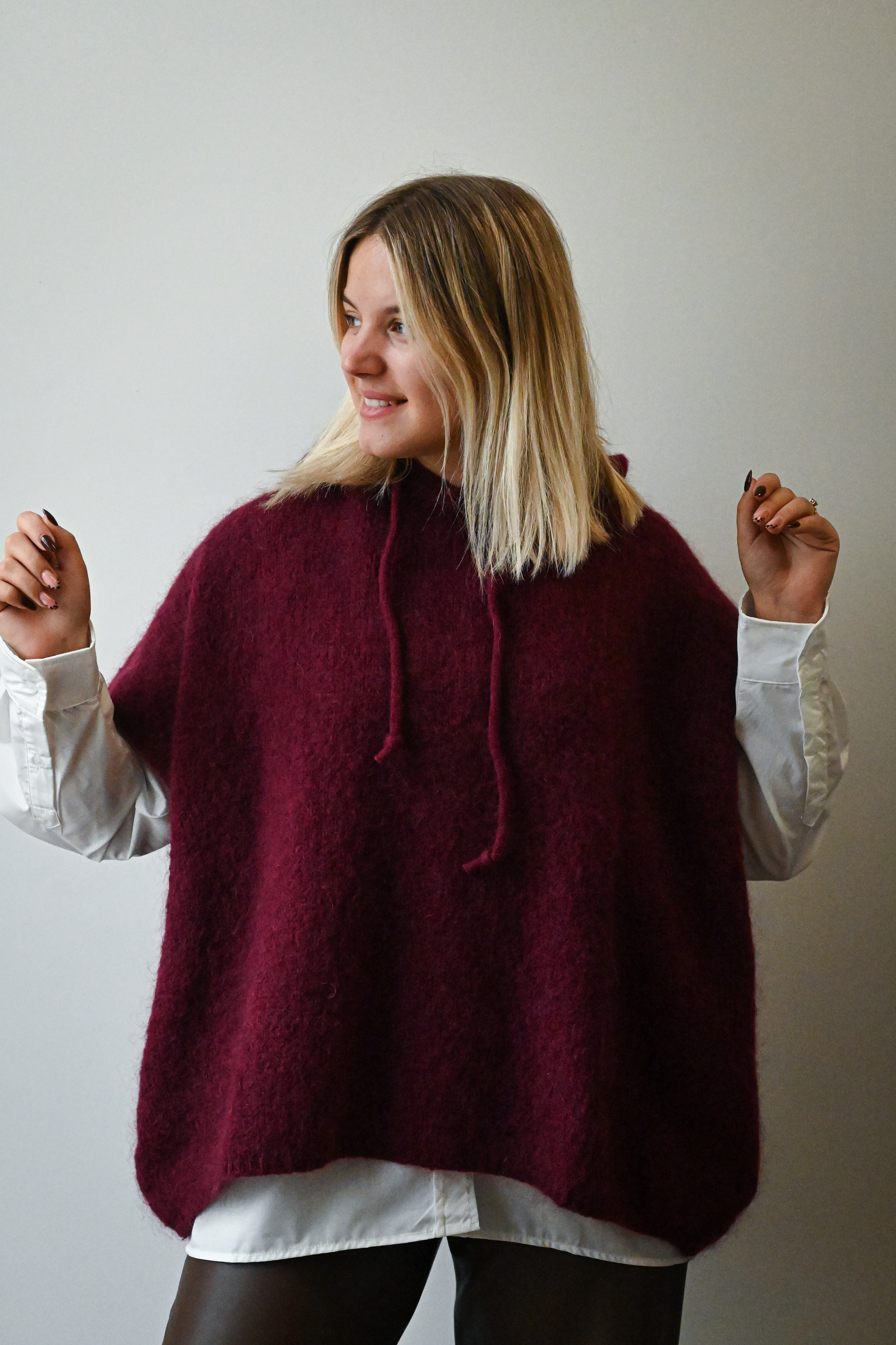 Adoptez ce pull cape chic, équipé d'une capuche et de cordons fonctionnels, créé sans manches pour un look distinctif et agréable à porter. Sa taille unique s’adapte facilement du 34 au 42.