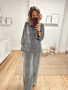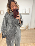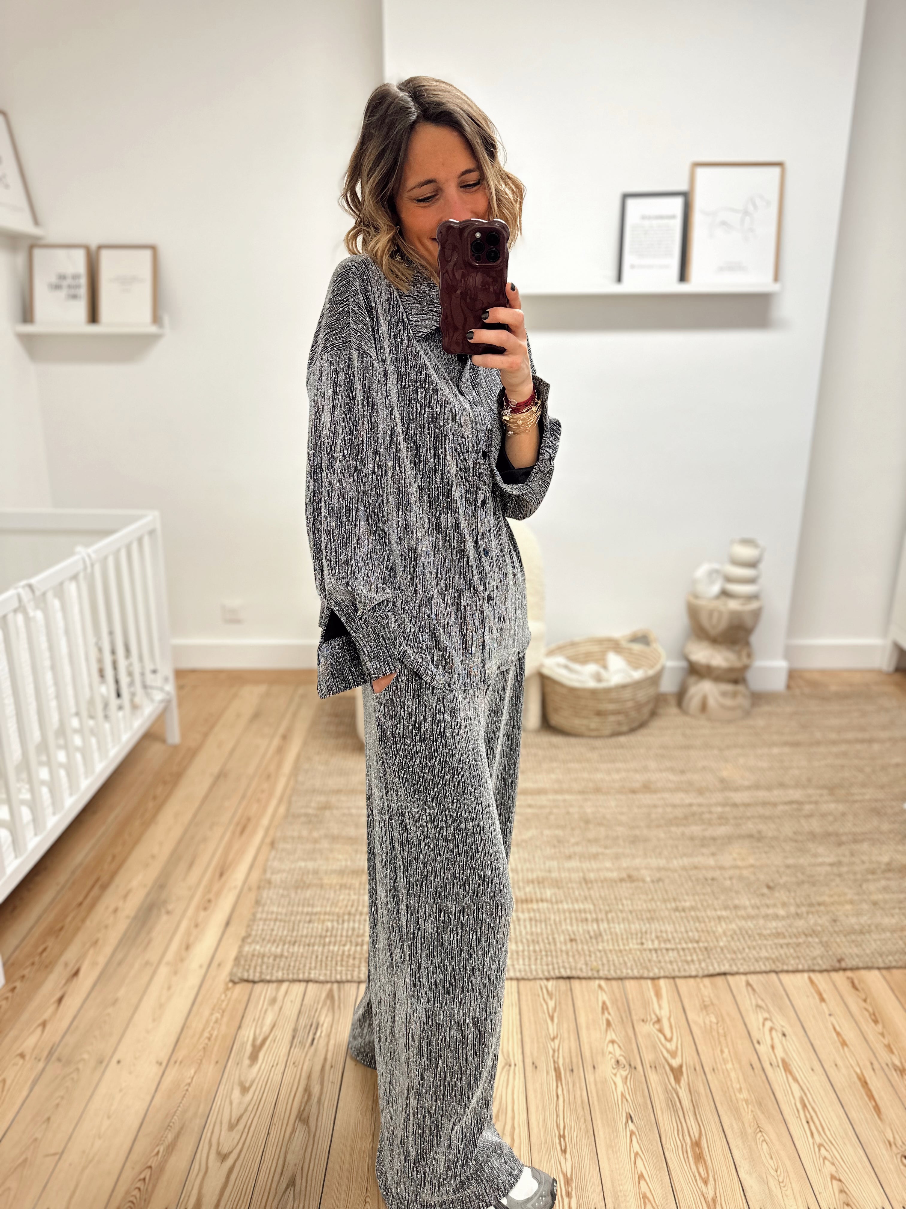 Chemise à paillettes, oversize. Disponible en taille S, M et L. Le mannequin mesure 1m75 et porte la taille S.