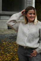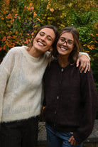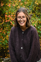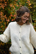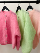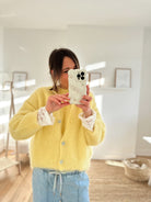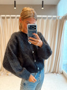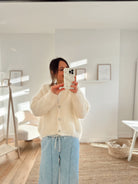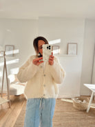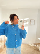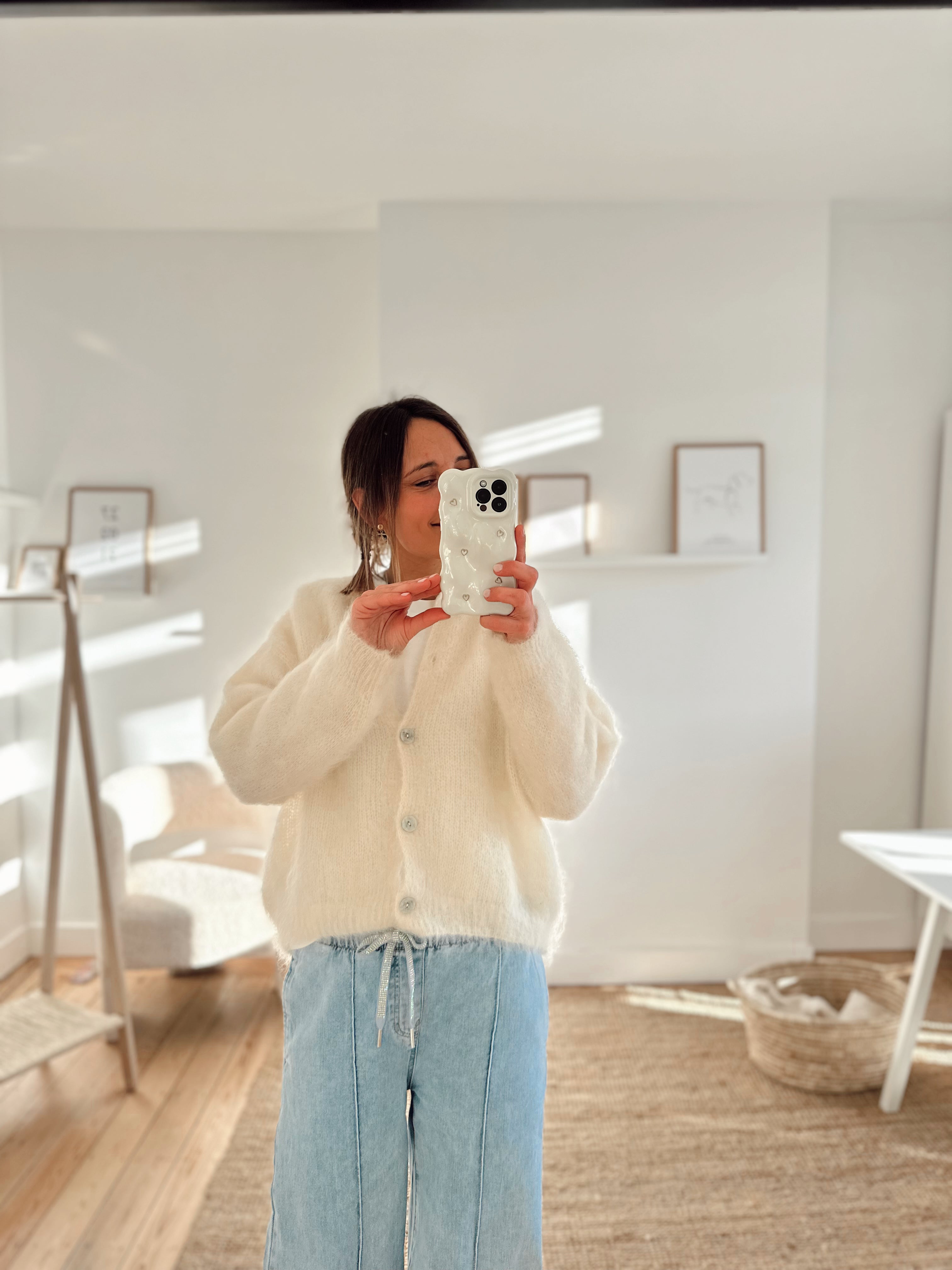 Gilet col rond manches longues avec boutons nacrés. Il ne pique pas et est hyper chaud.