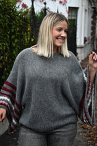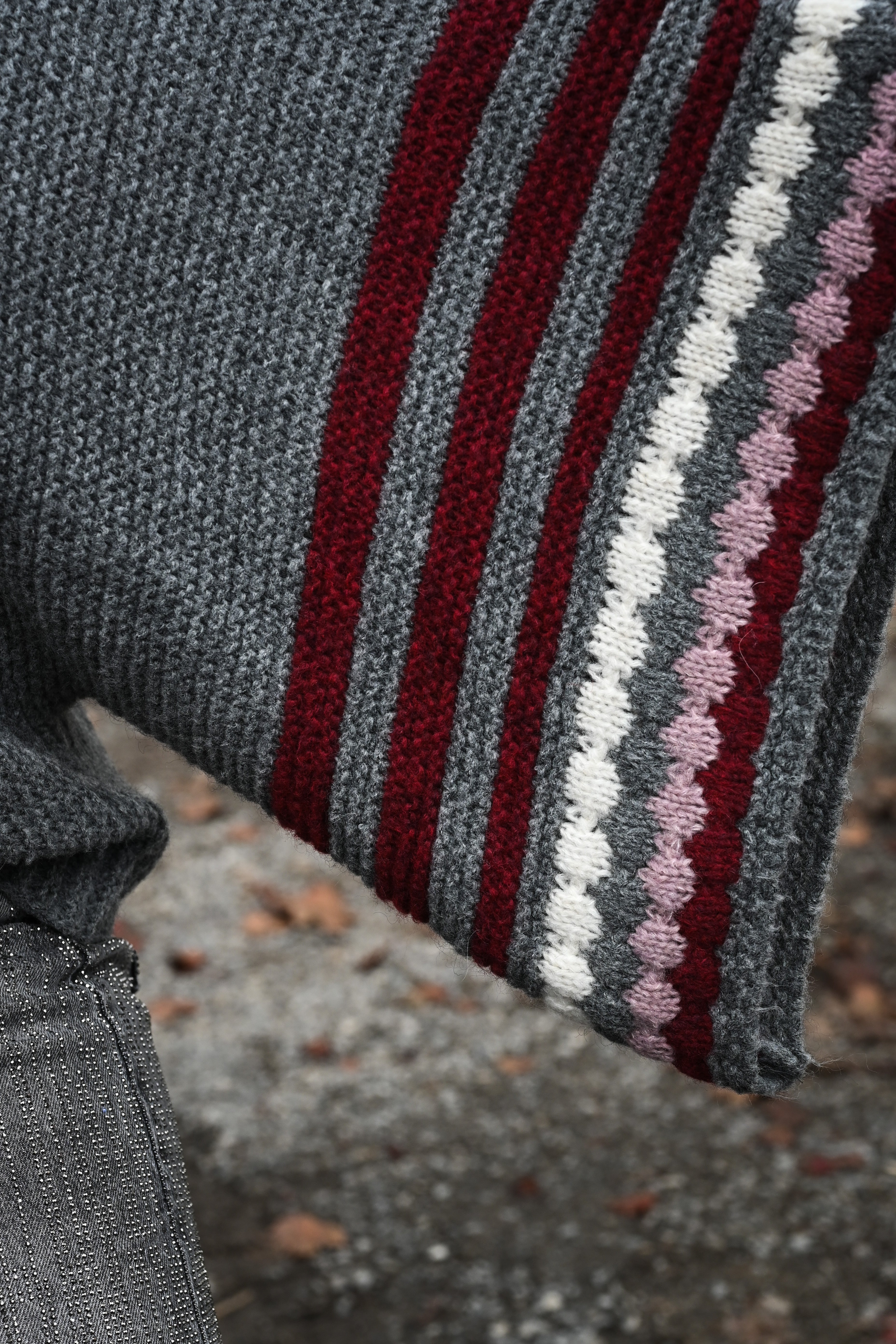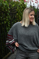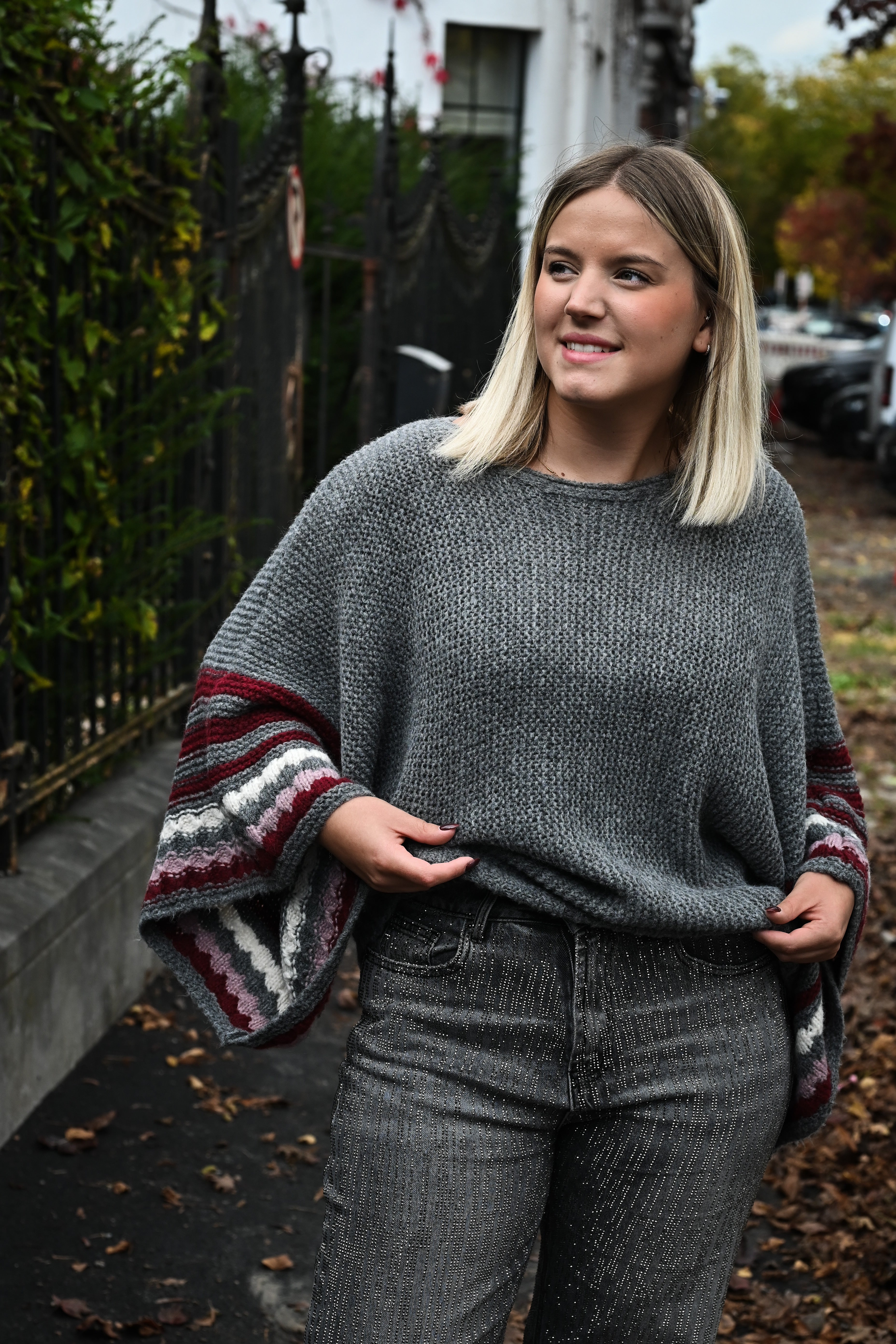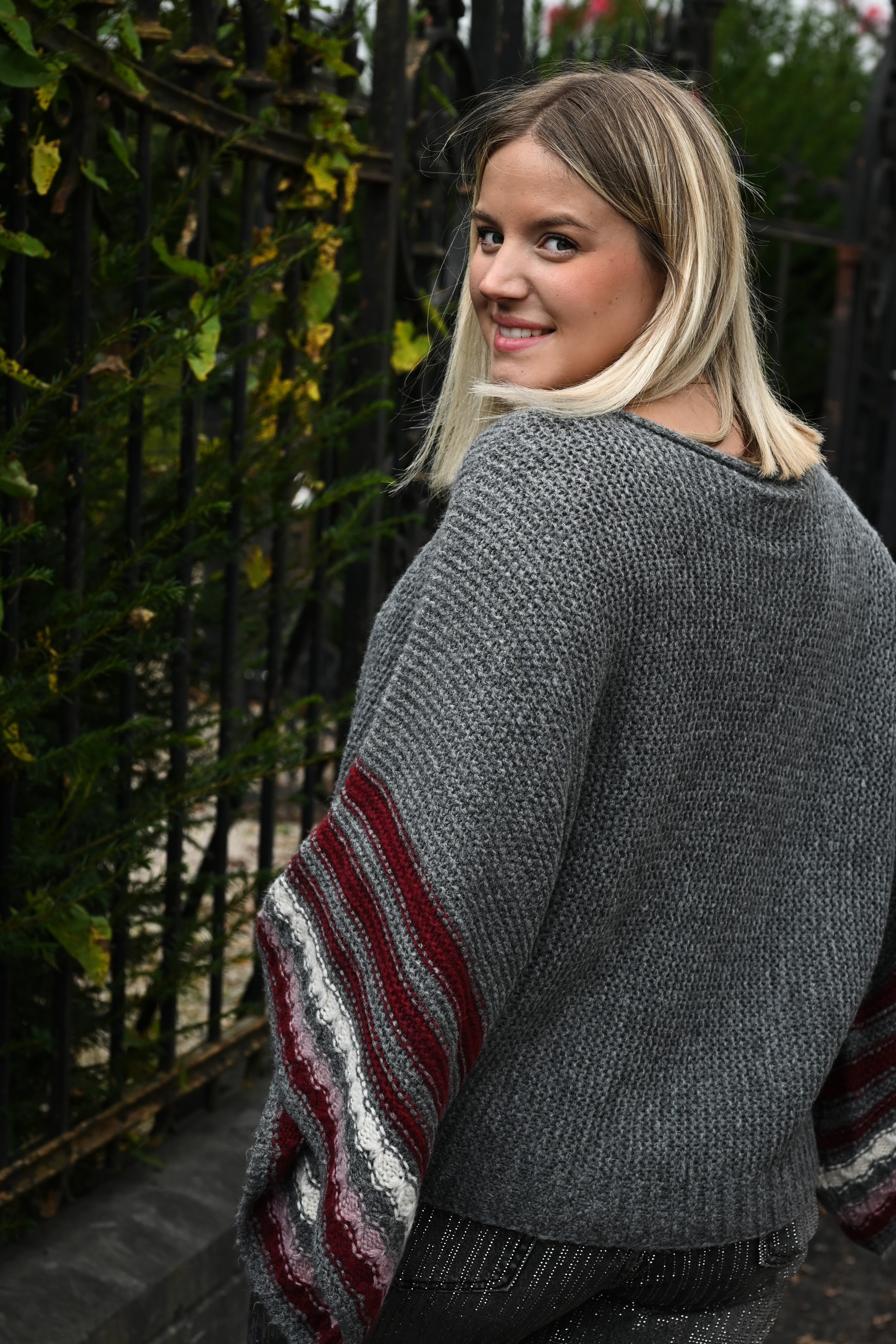 Ce pull à maille large présente des rayures bordeaux, rose et blanc cassé. Disponible uniquement en taille unique, il offre une coupe très ample avec des manches évasées pour un style à la fois confortable et tendance.