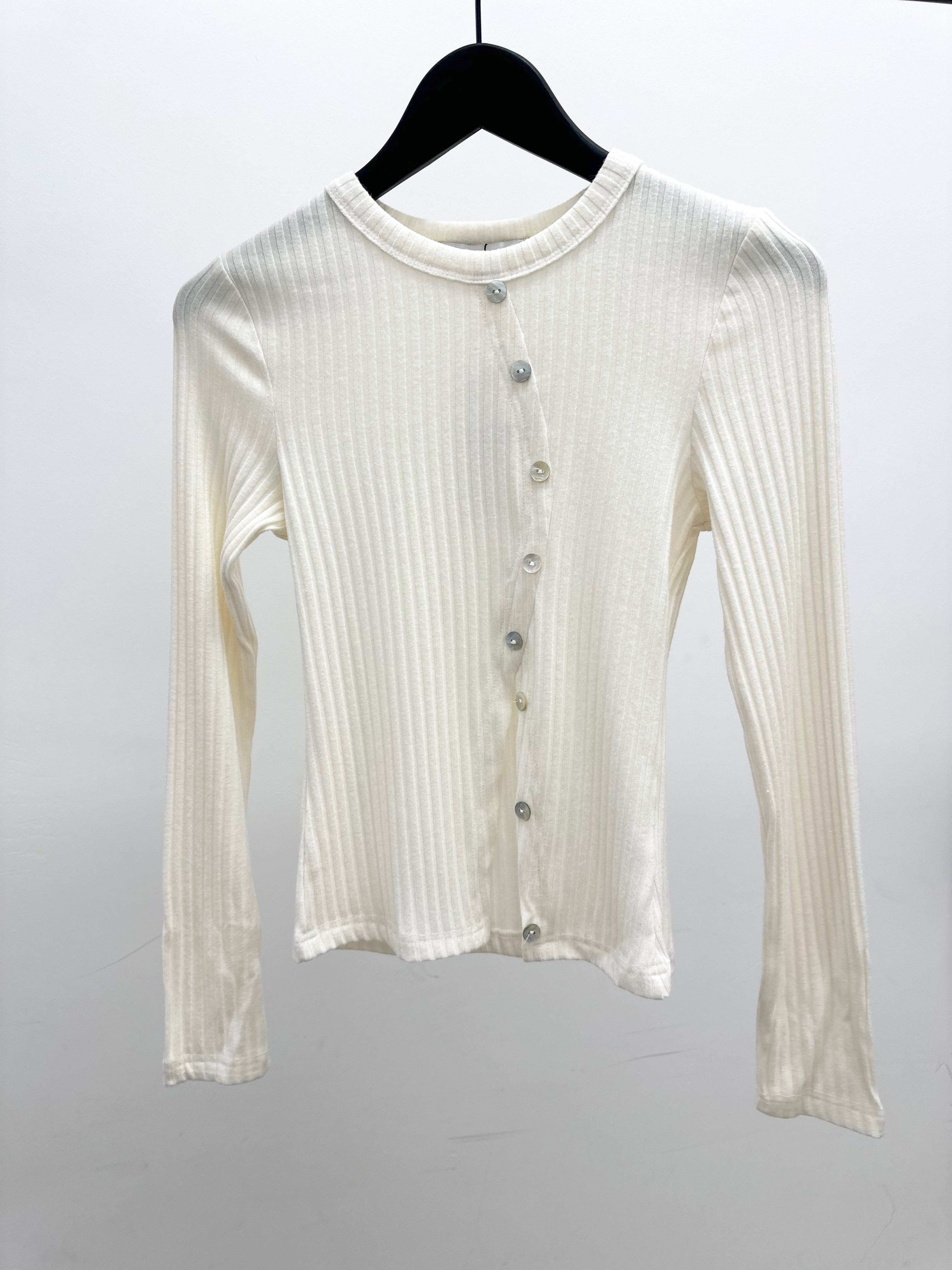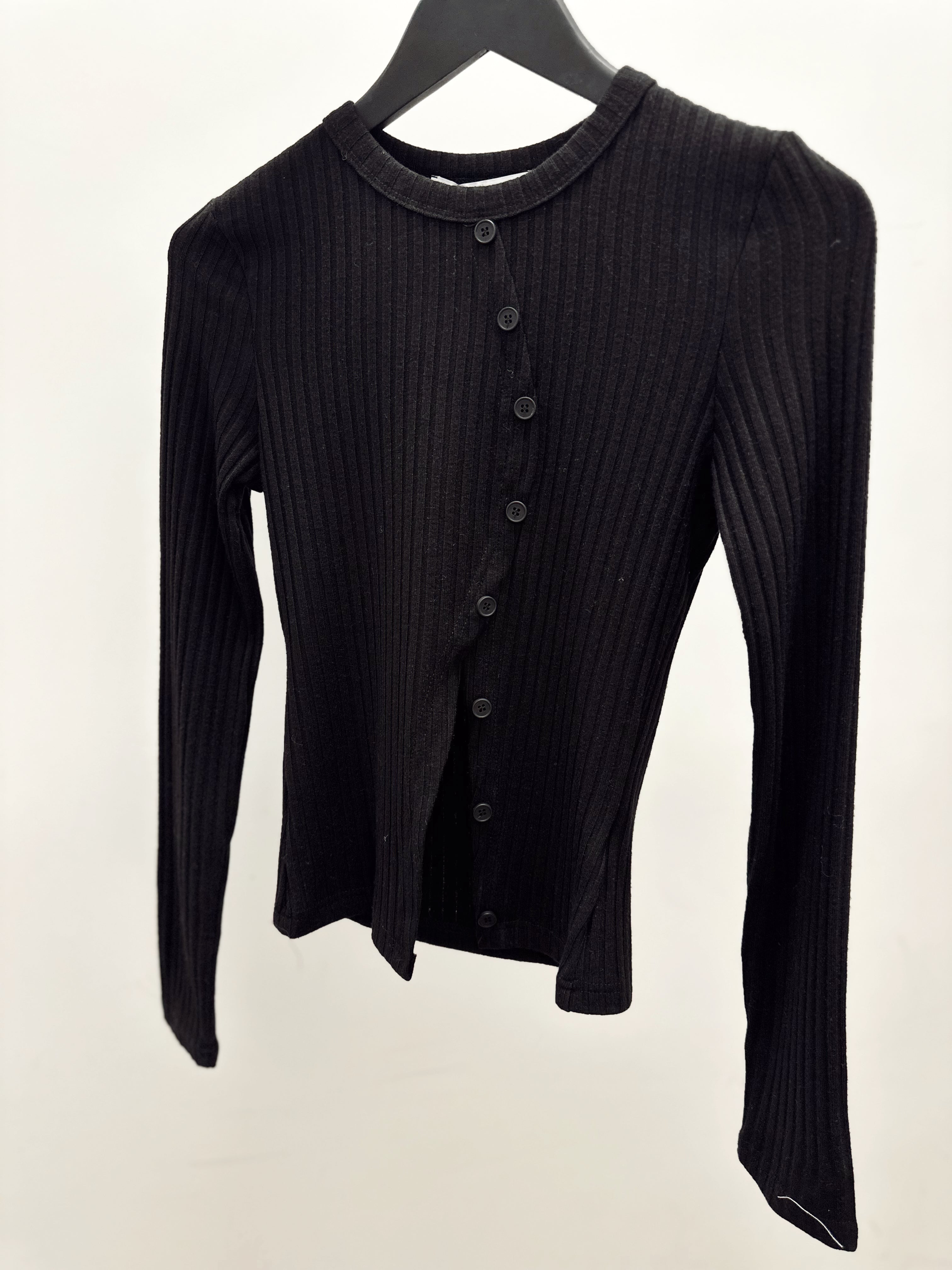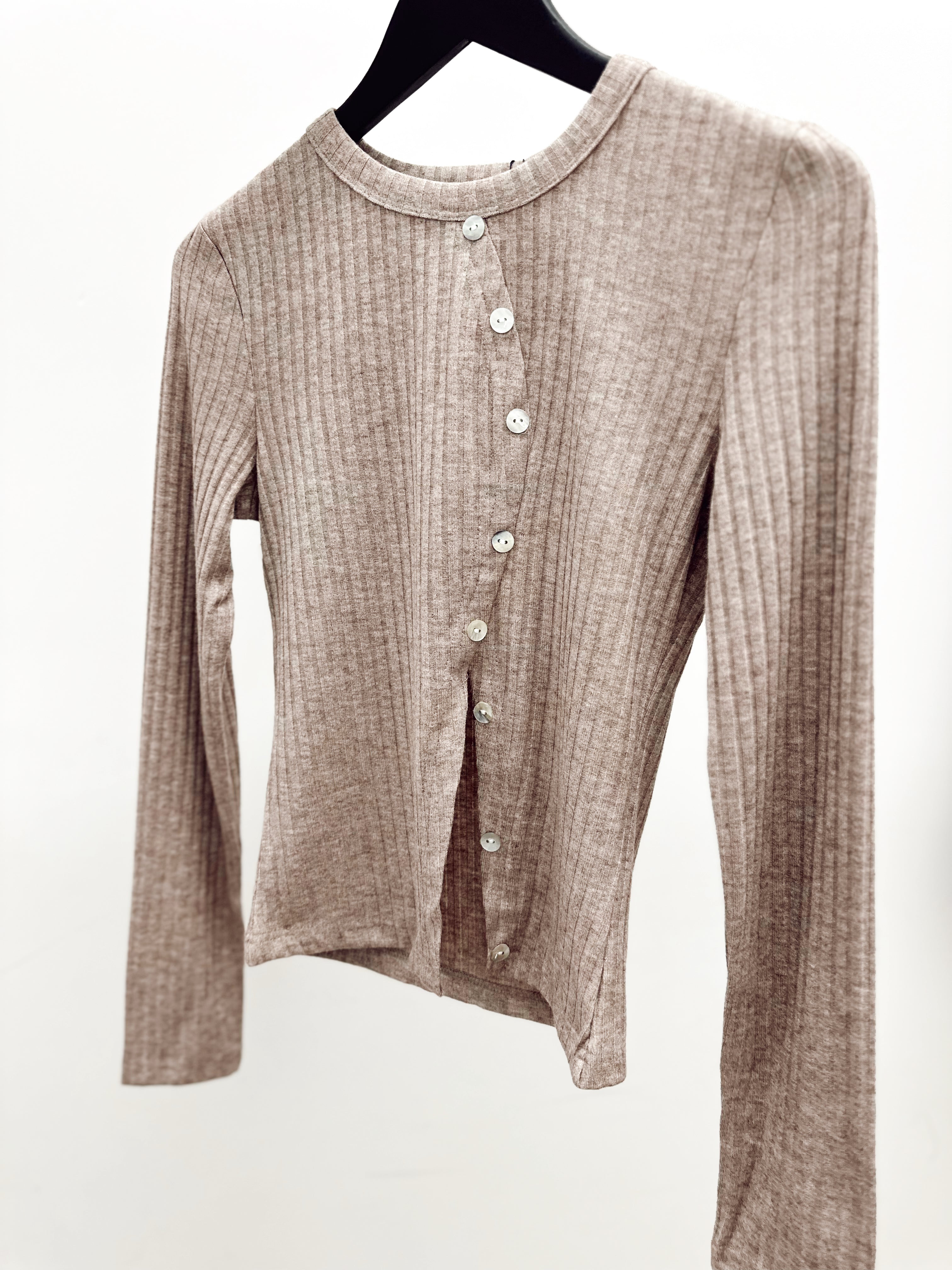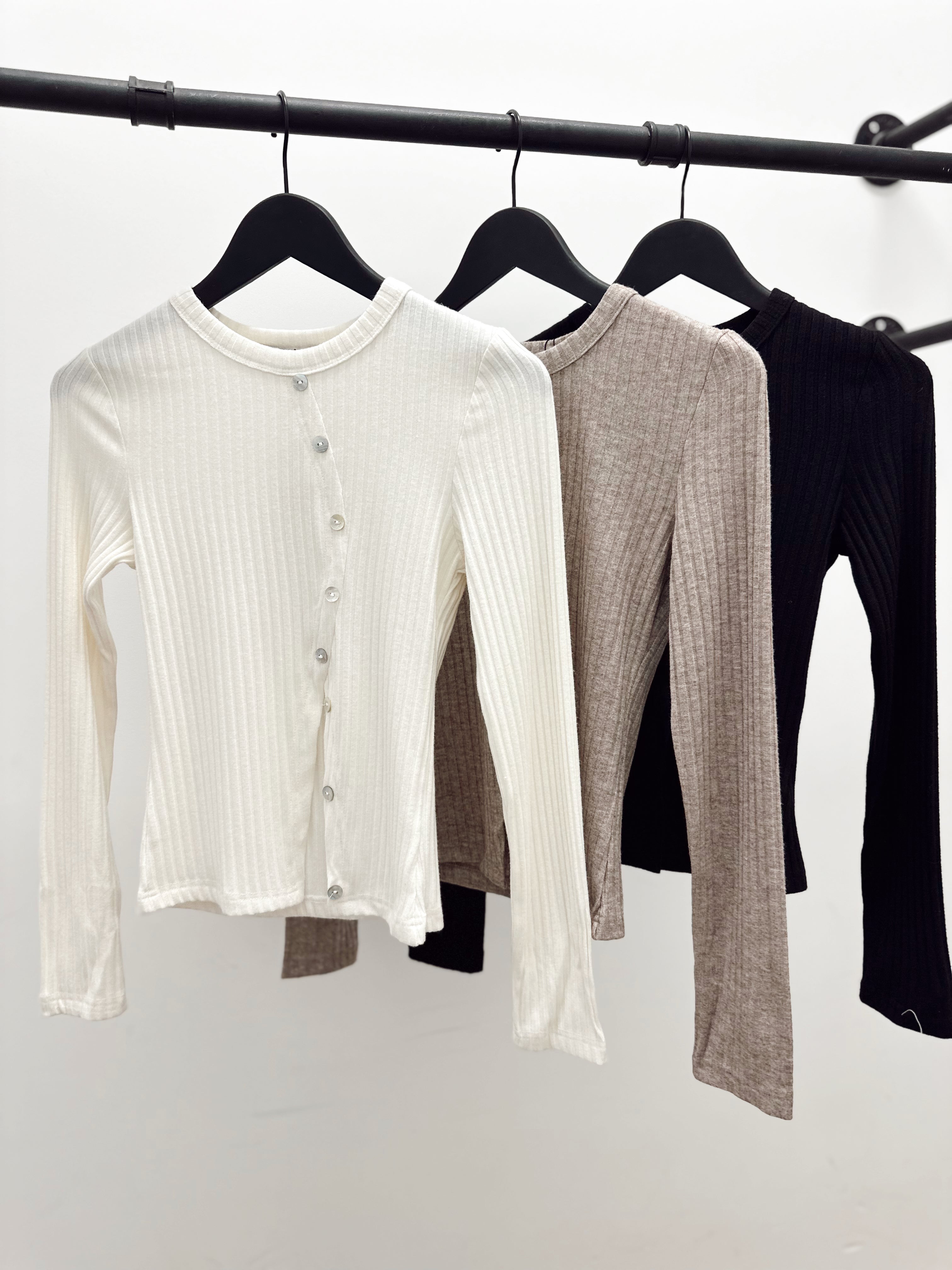 Pull tout fin, longues manches, boutonné et ouvert dans le bas. Il est disponible en écru, taupe et noir. Il existe en taille S, M et L.