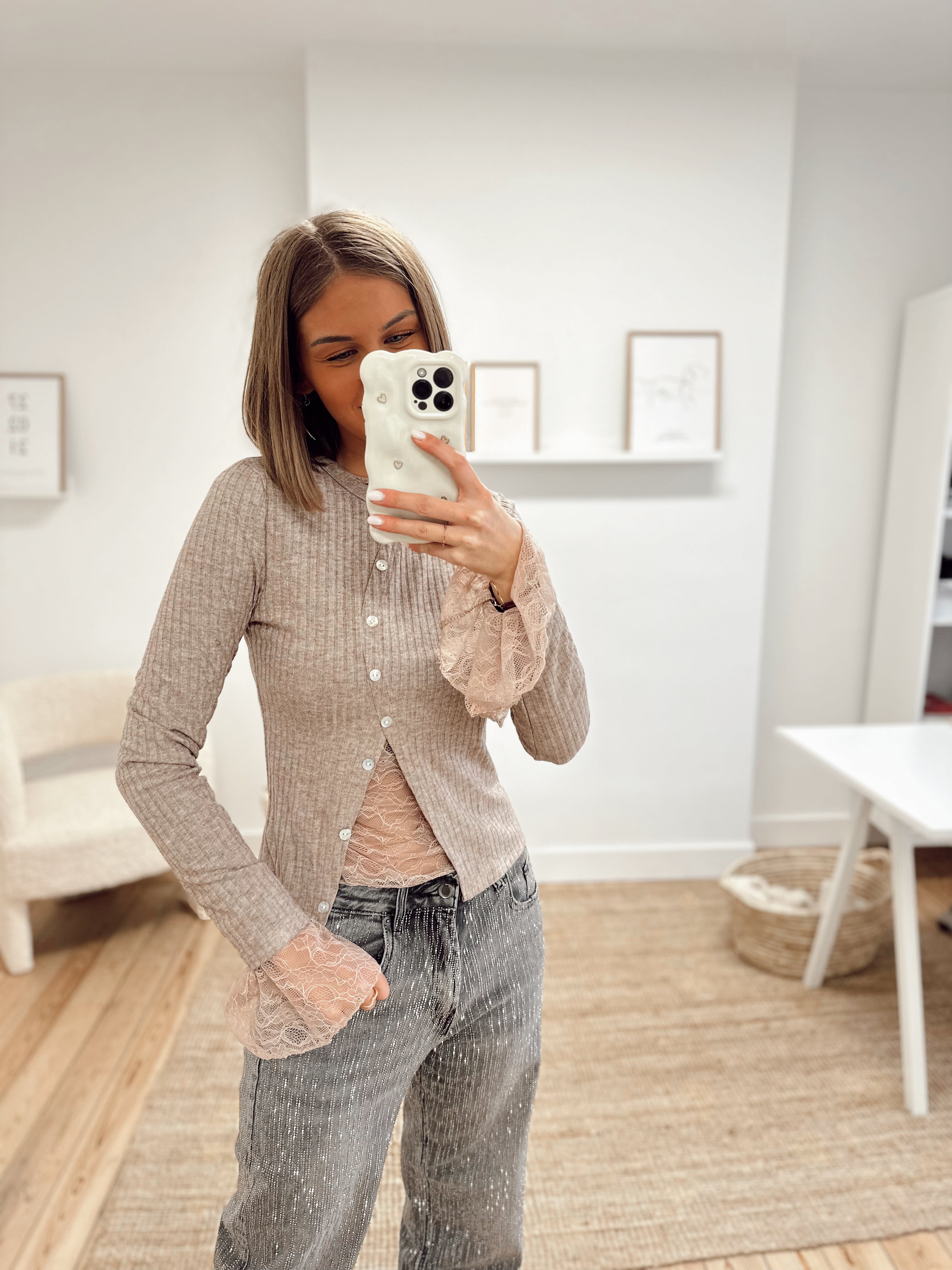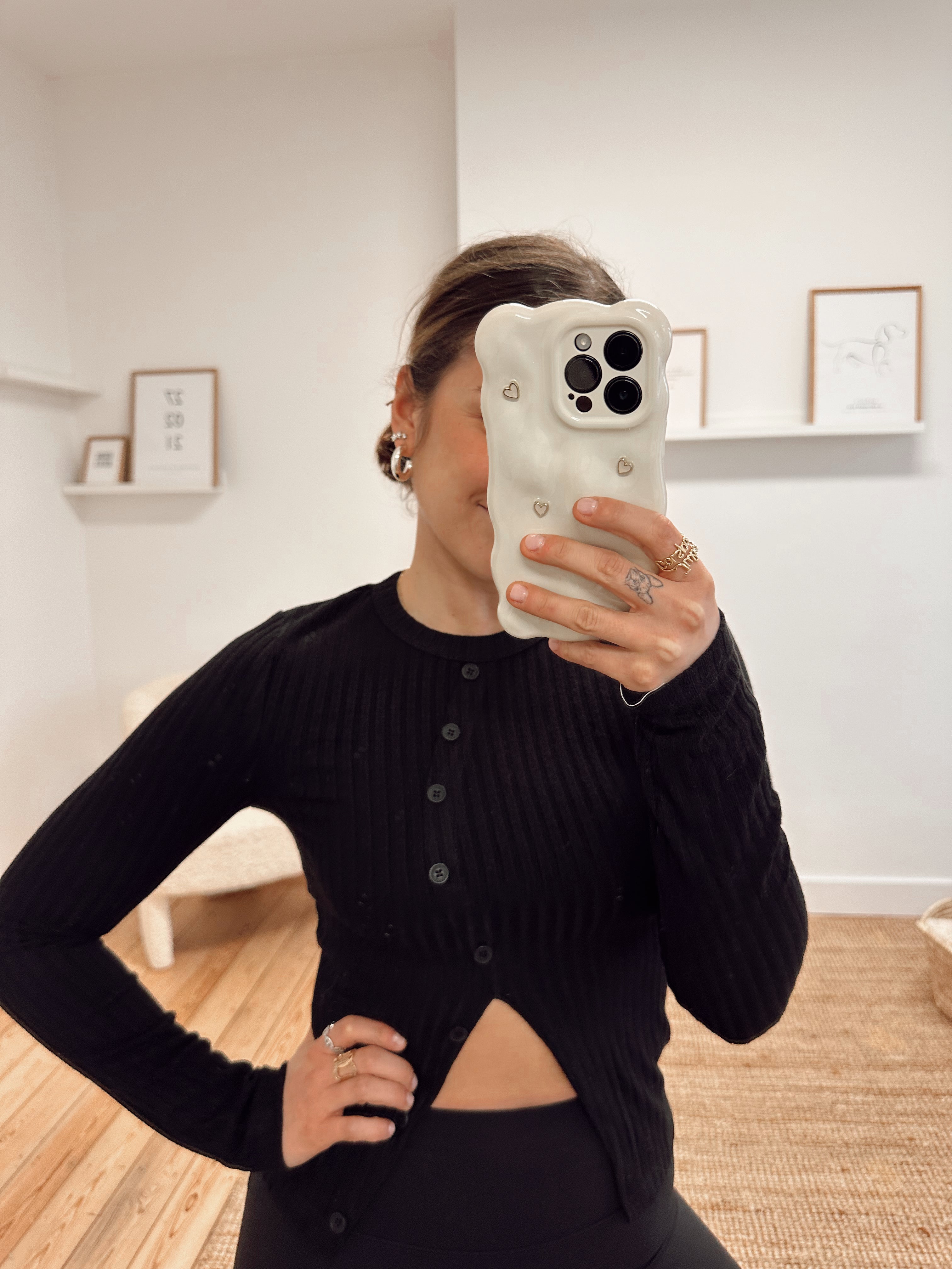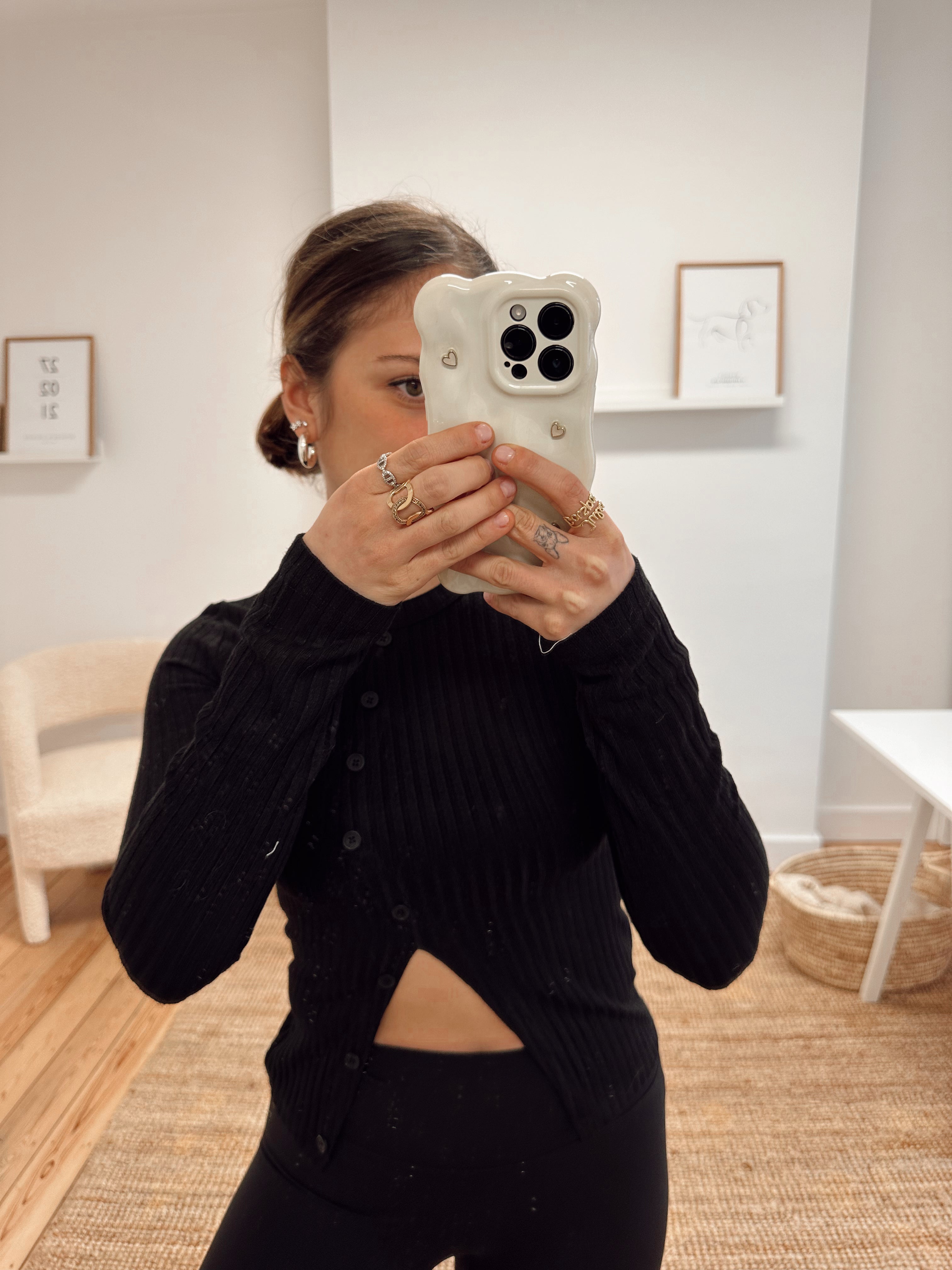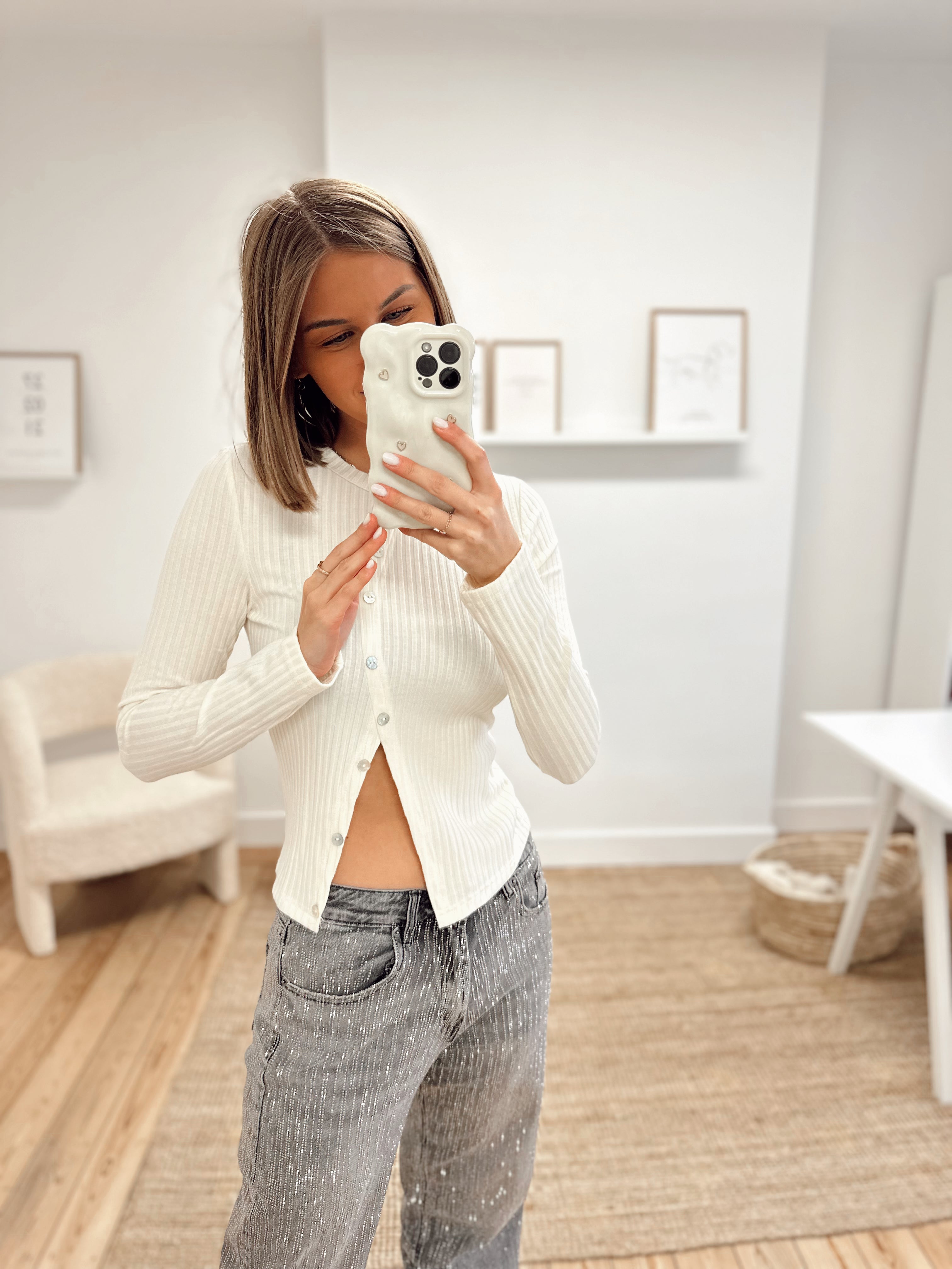 Pull tout fin, longues manches, boutonné et ouvert dans le bas. Il est disponible en écru, taupe et noir. Il existe en taille S, M et L.