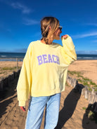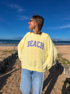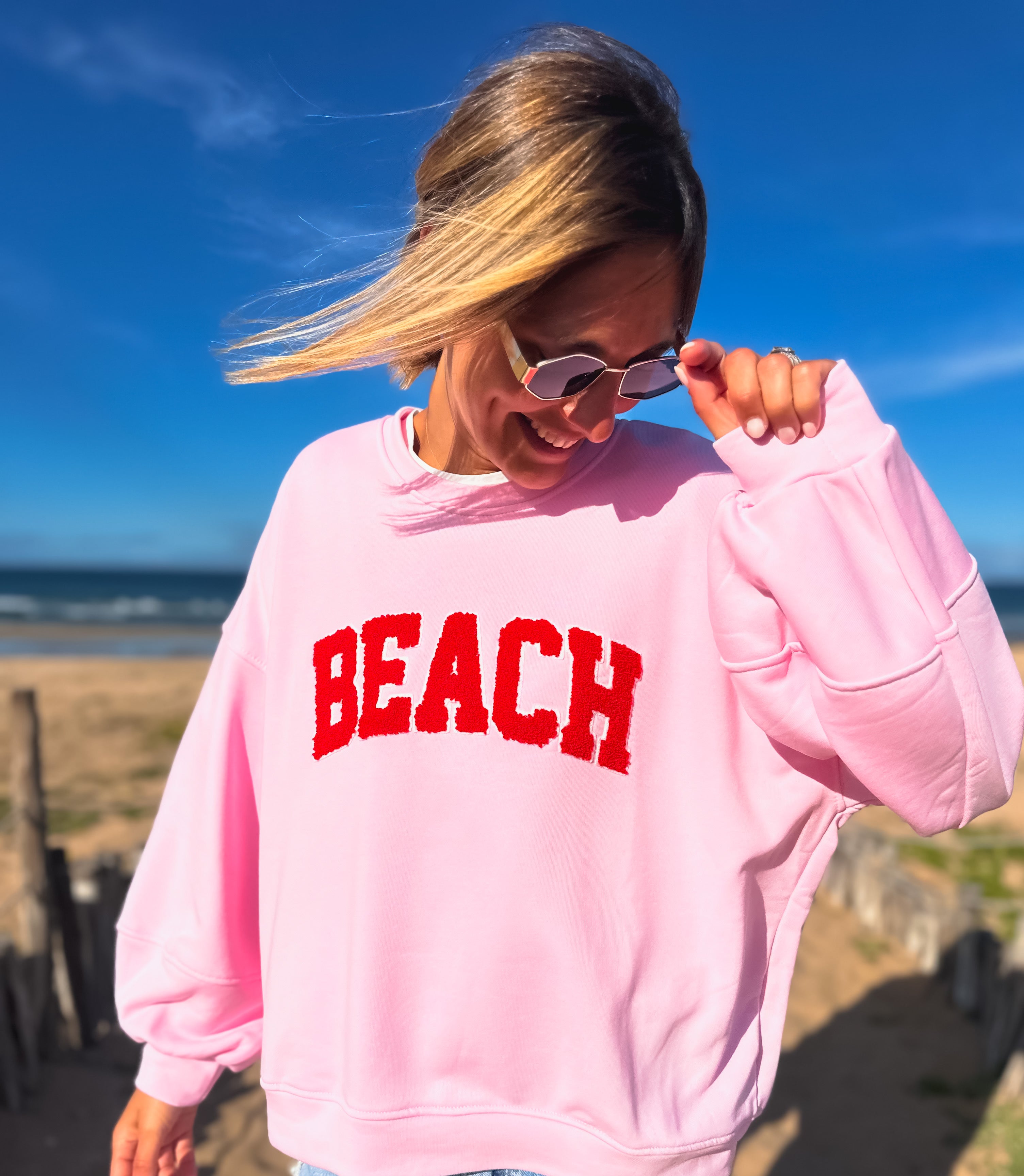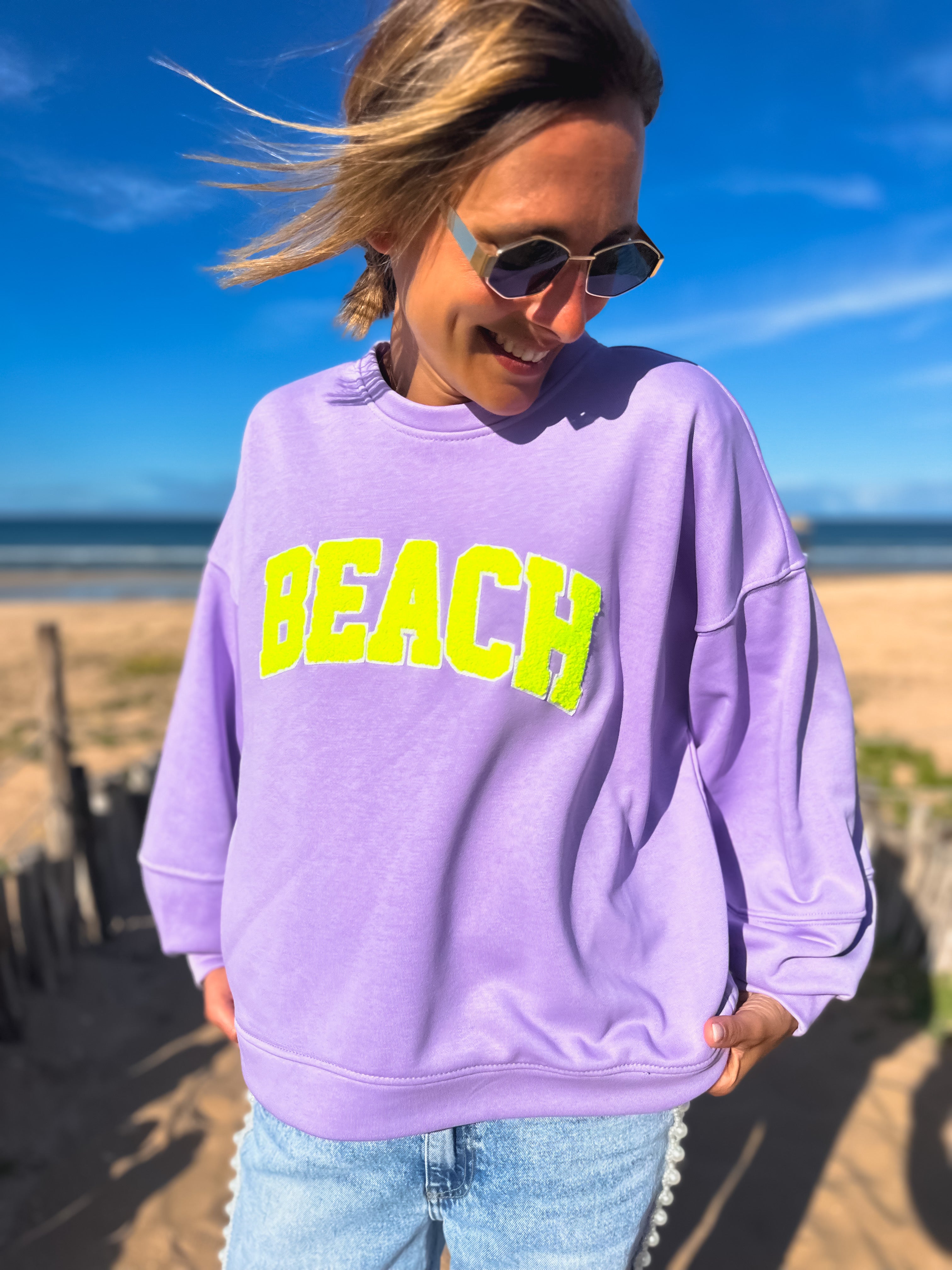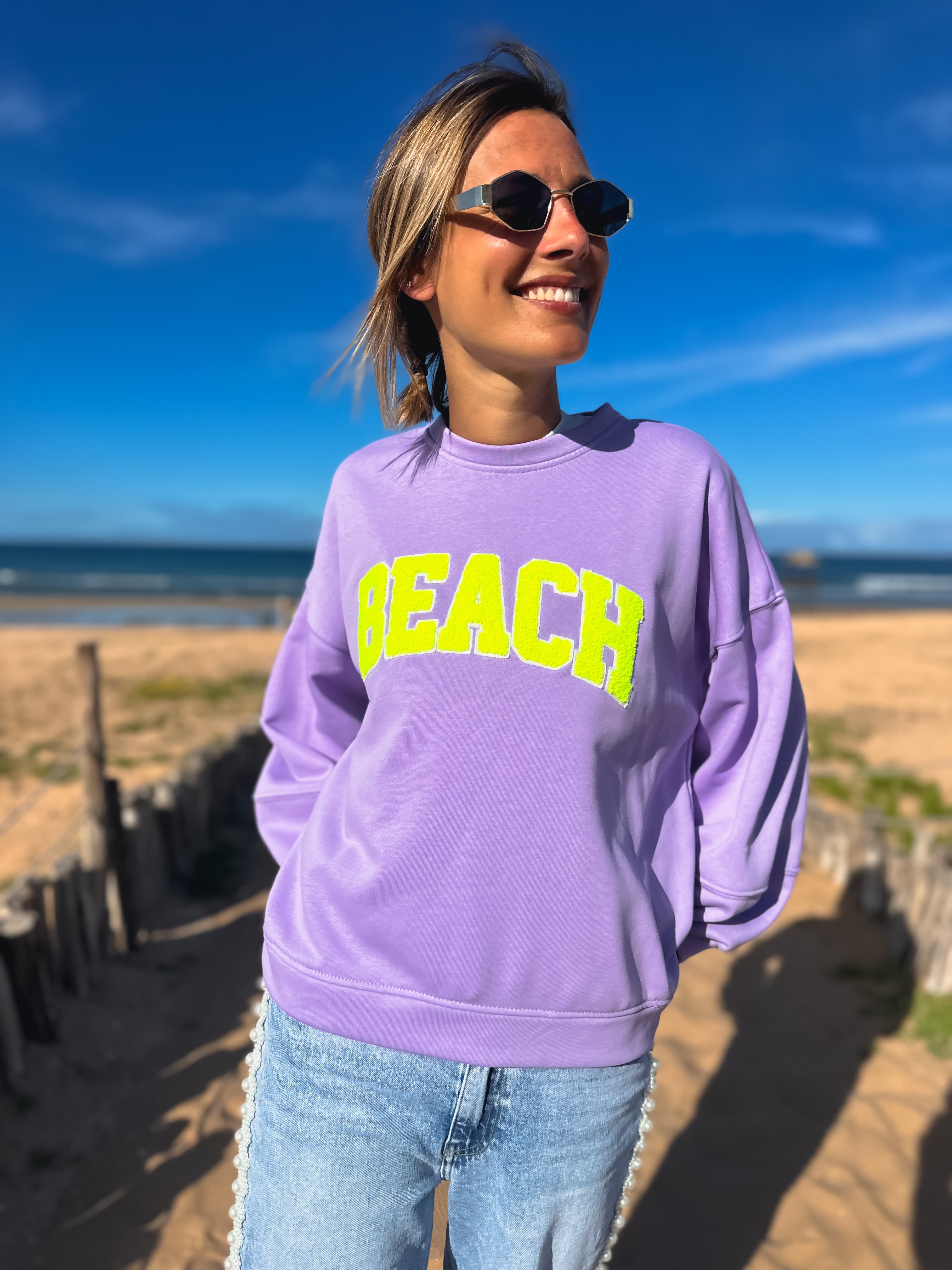 Sweat oversize et coloré avec inscription "Beach". Il est disponible seulement en taille unique mais s'adapte facilement à toutes les tailles et morphologies.
