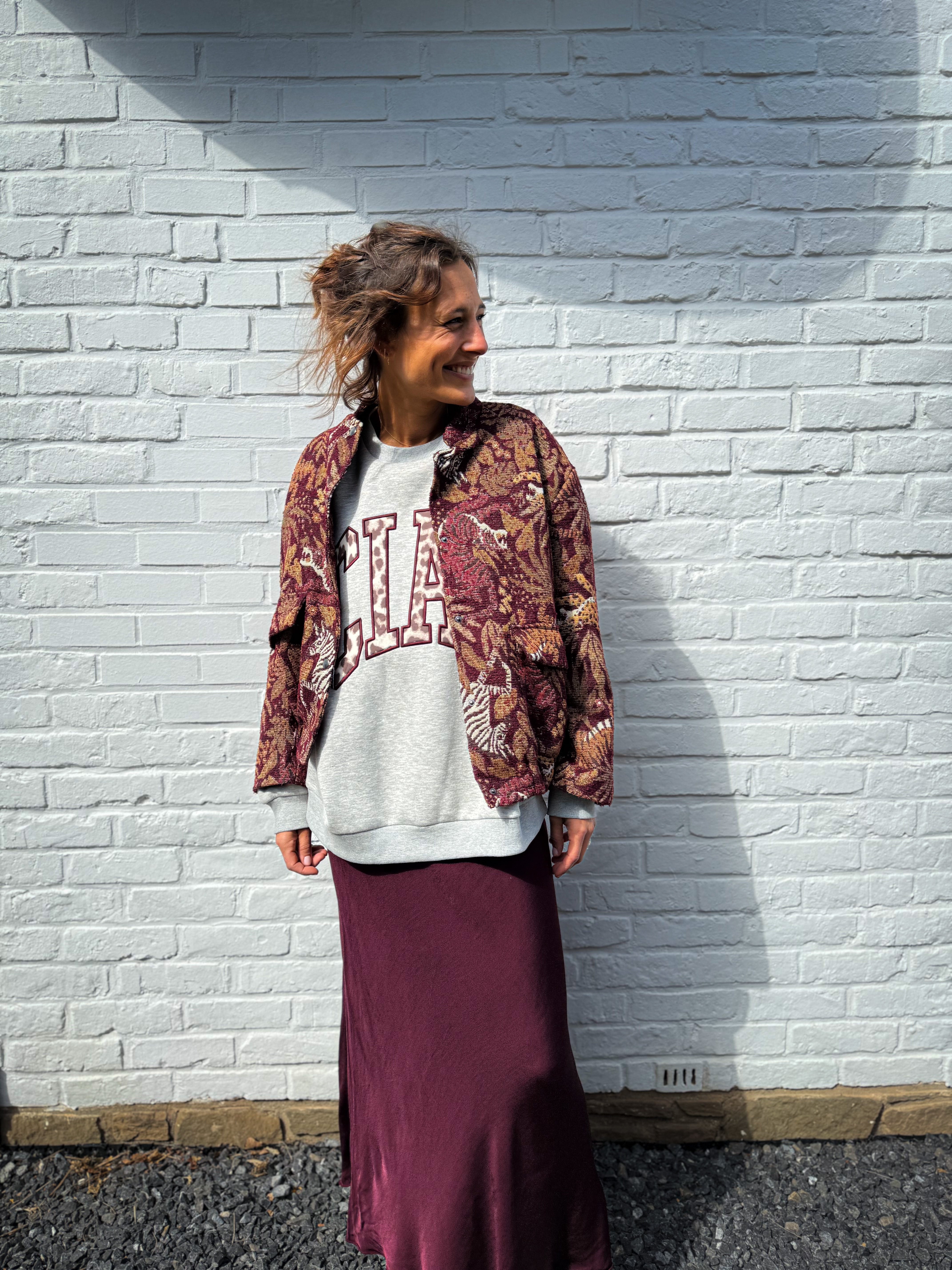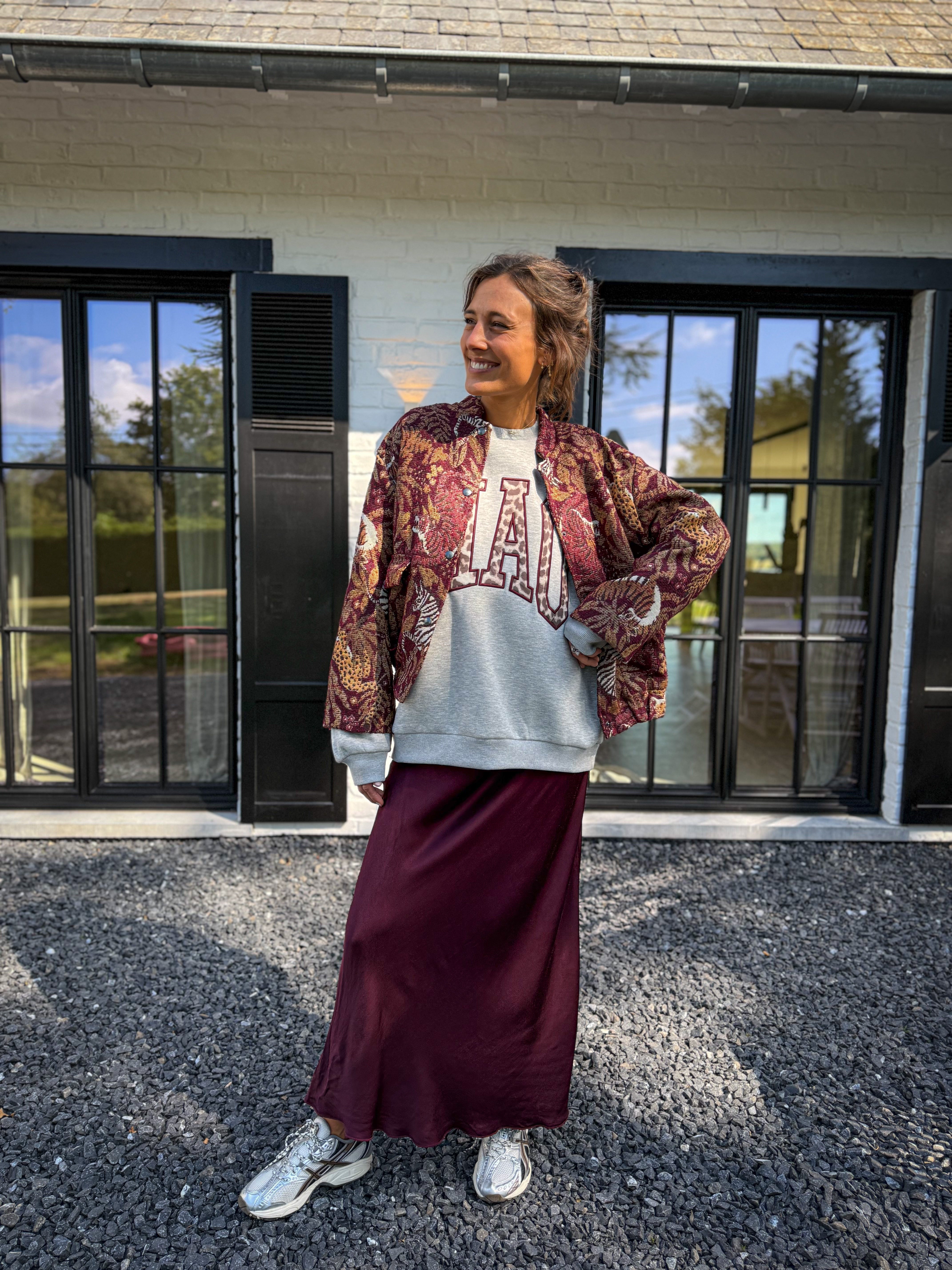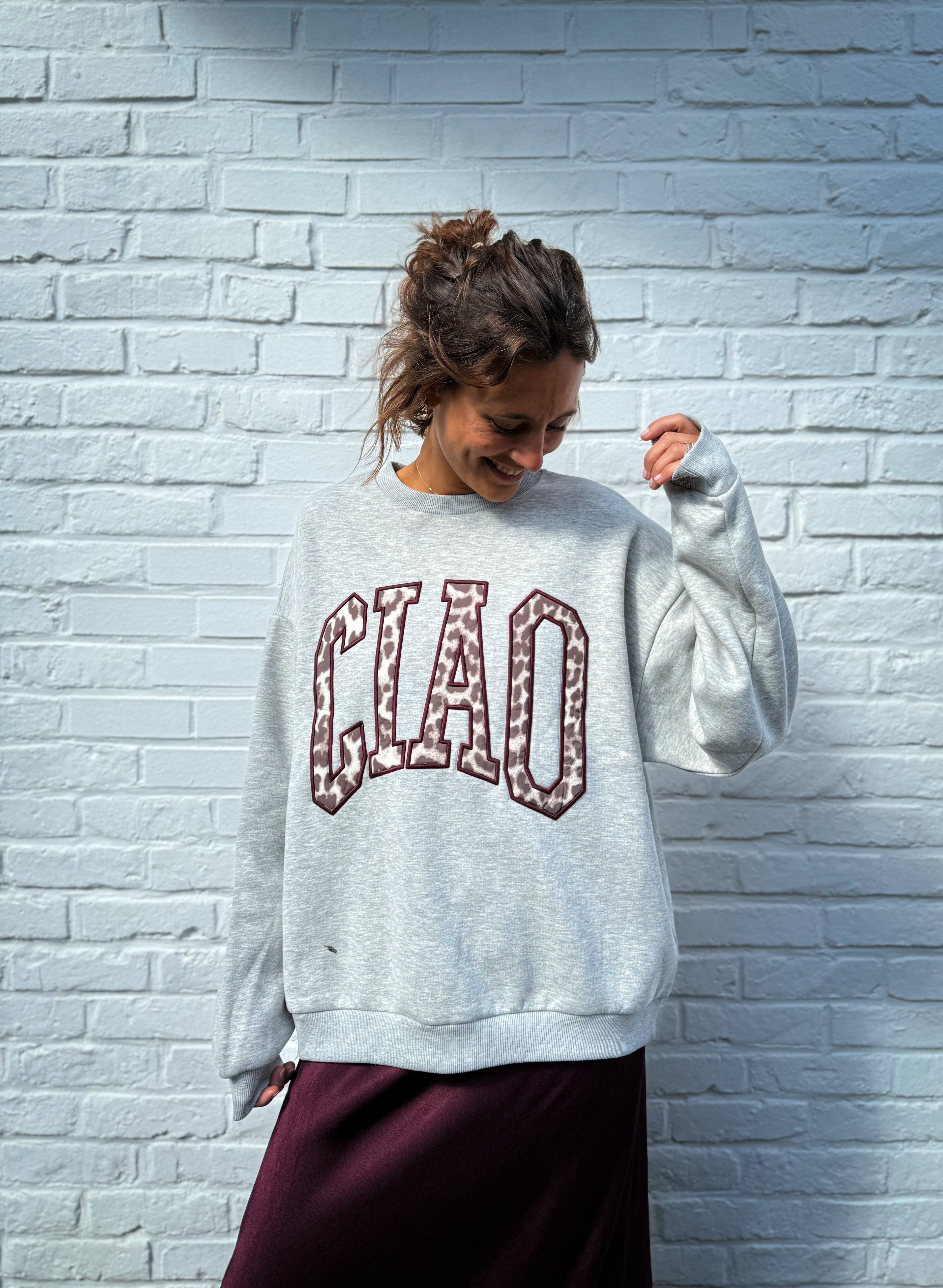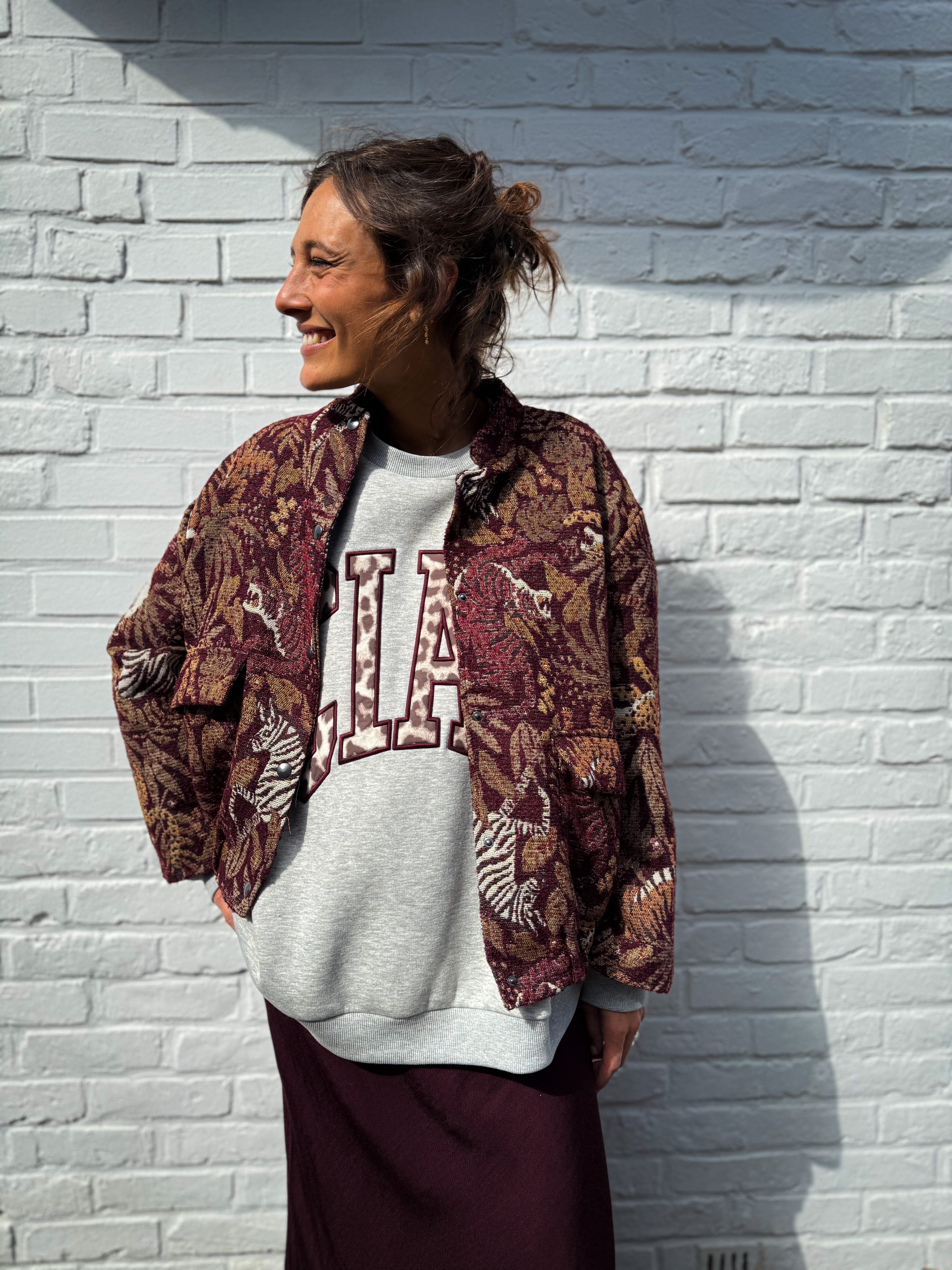 Ce sweat gris extra-large arbore un imprimé léopard bordeaux sur le devant. Disponible en taille S, M et L il convient à toutes les silhouettes grâce à sa coupe généreuse et confortable.