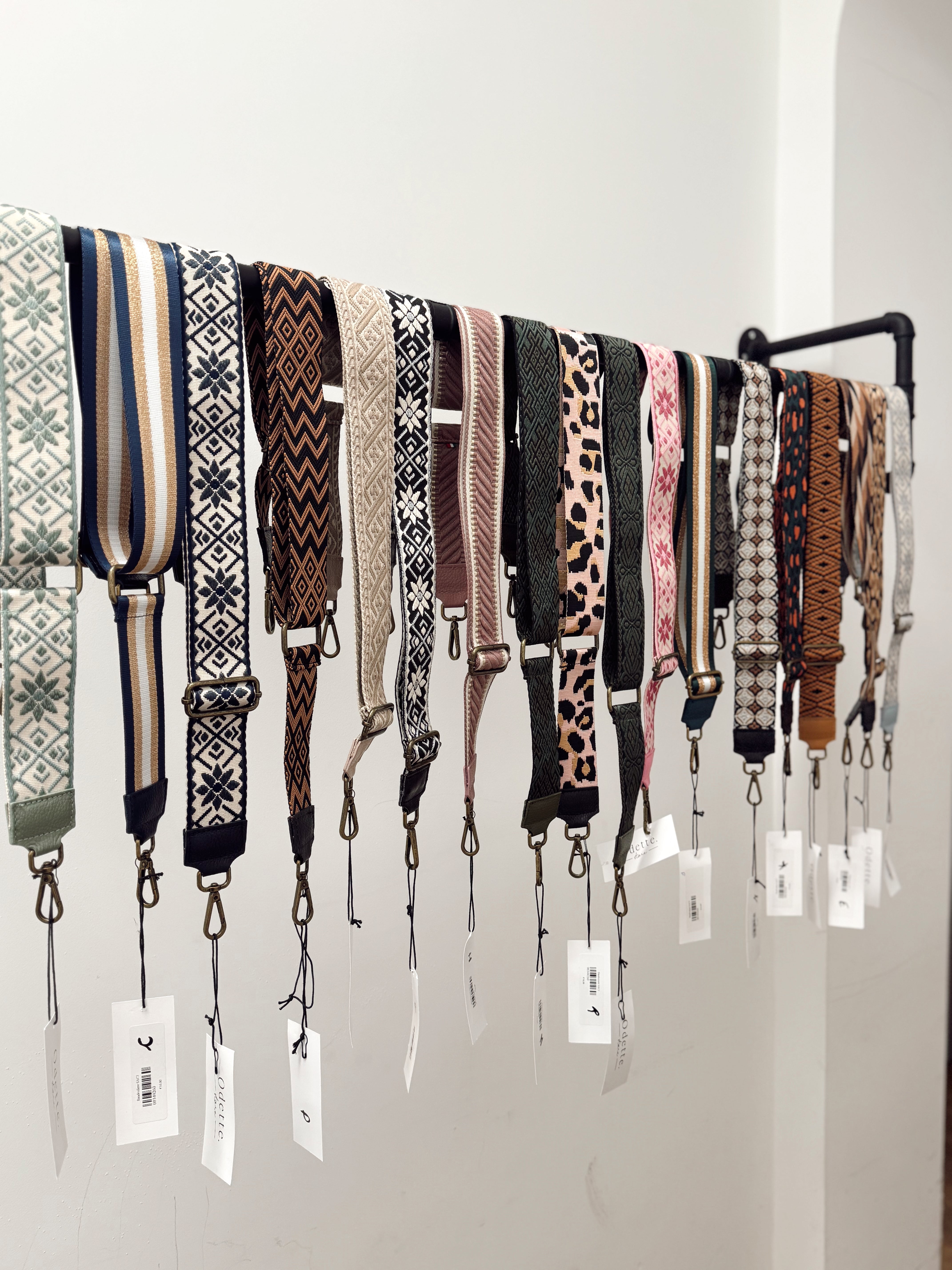 Bandouiléres pour sac disponibles en plusieurs coloris. Elles sont réglables et se terminent par deux crochets.