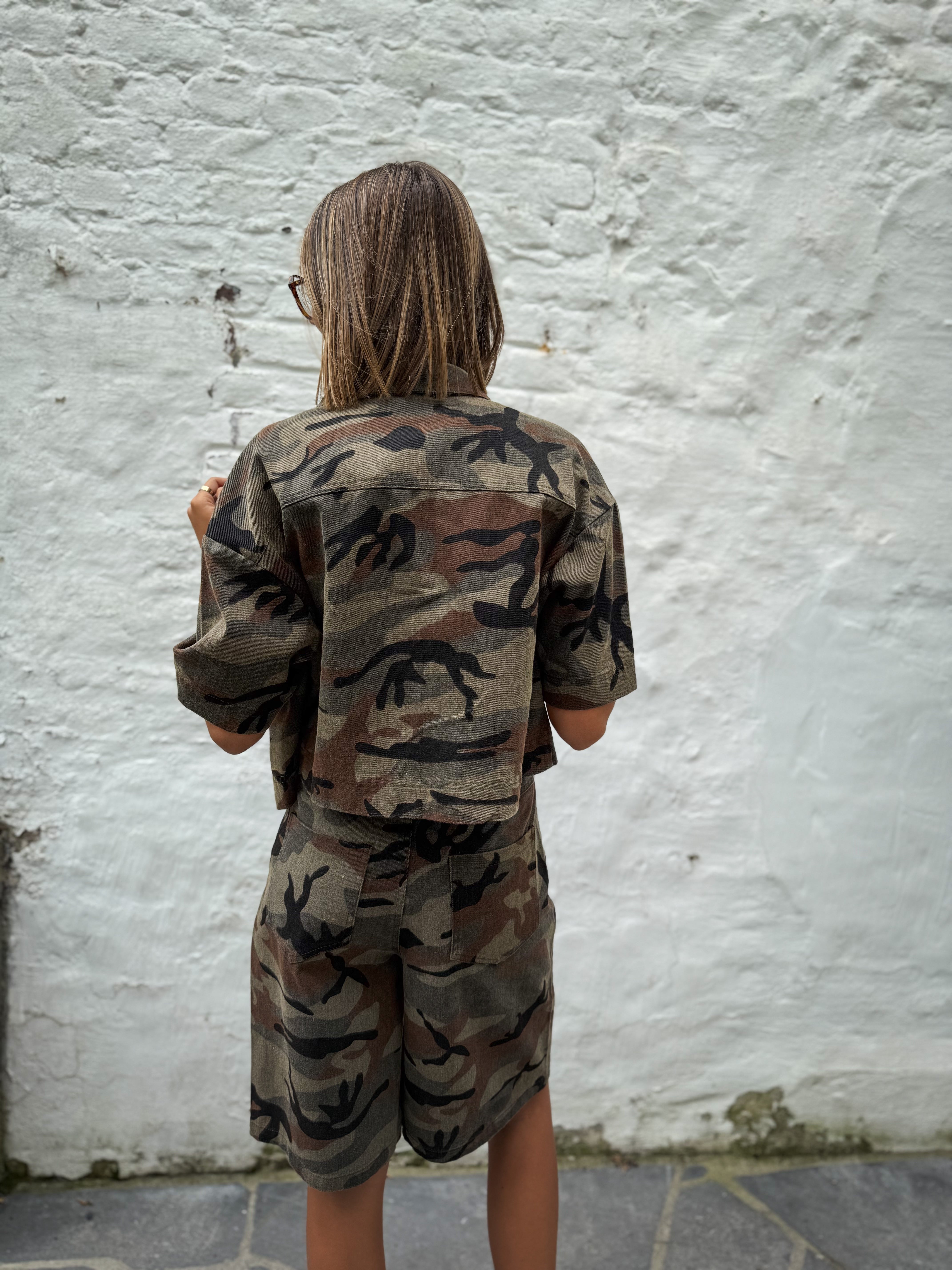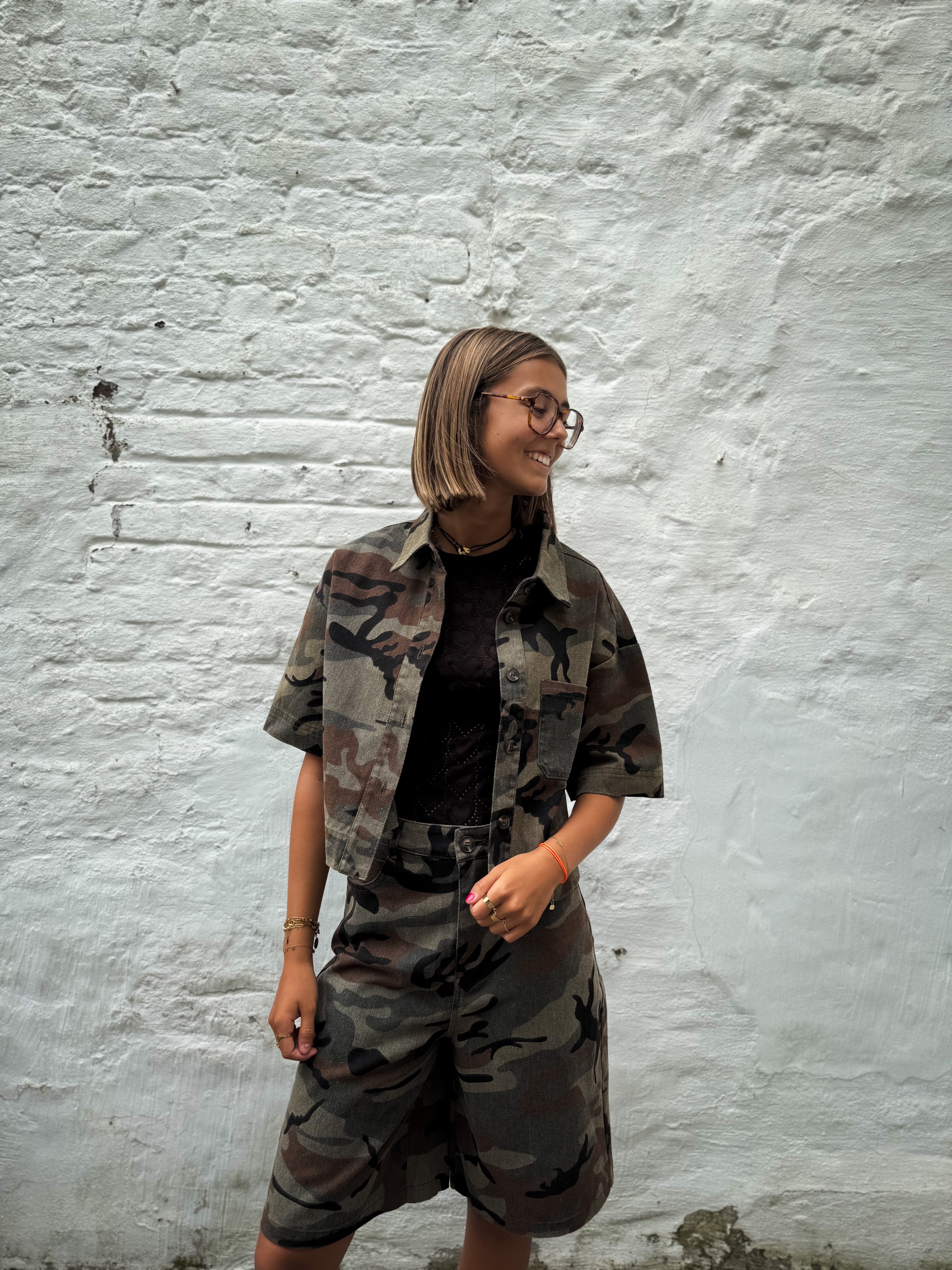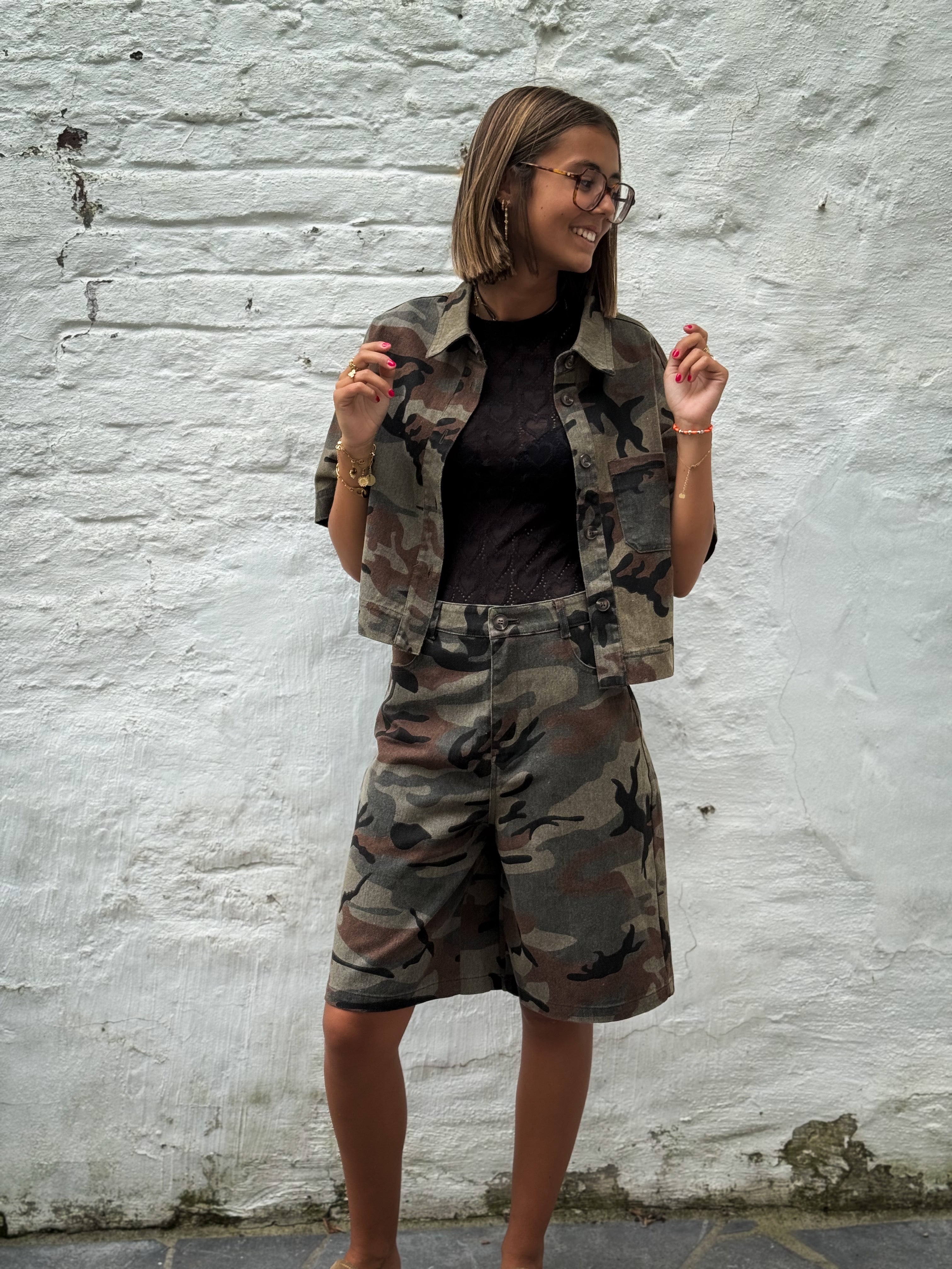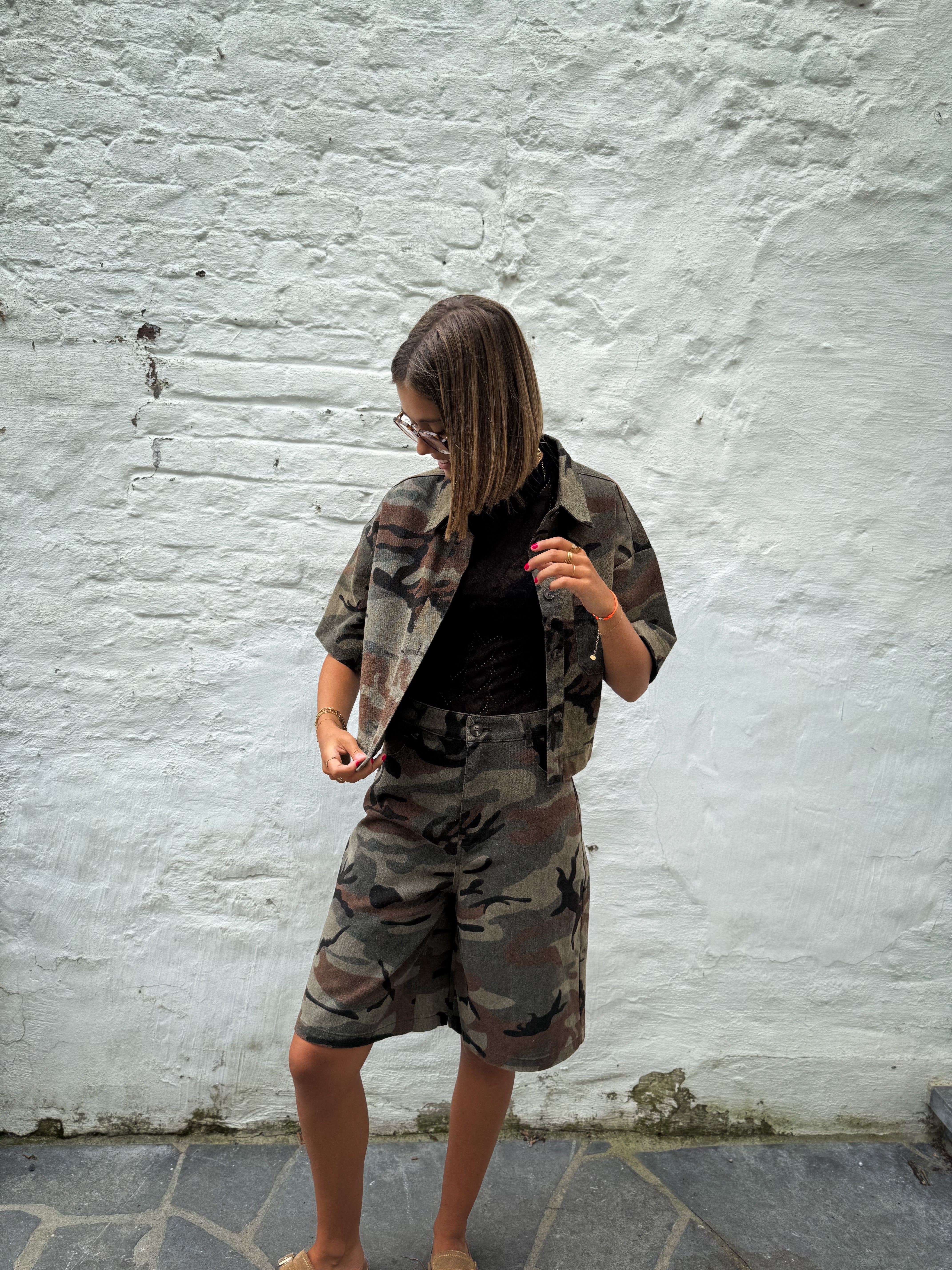 Découvrez notre Bermuda INA en jean à motif camouflage, proposé en tailles S,M ou L pour un ajustement parfait. Adoptez un style audacieux et confortable cet été.