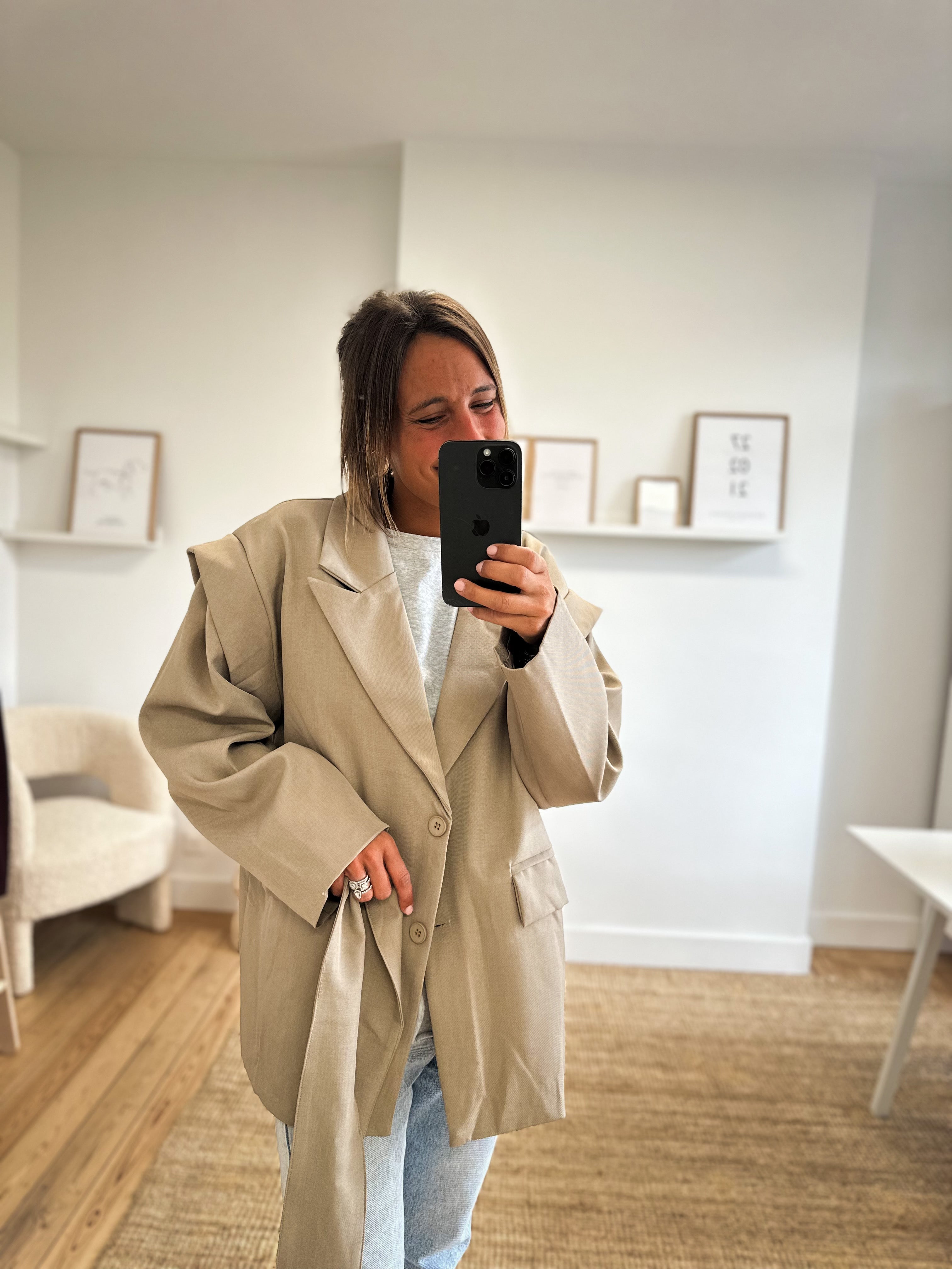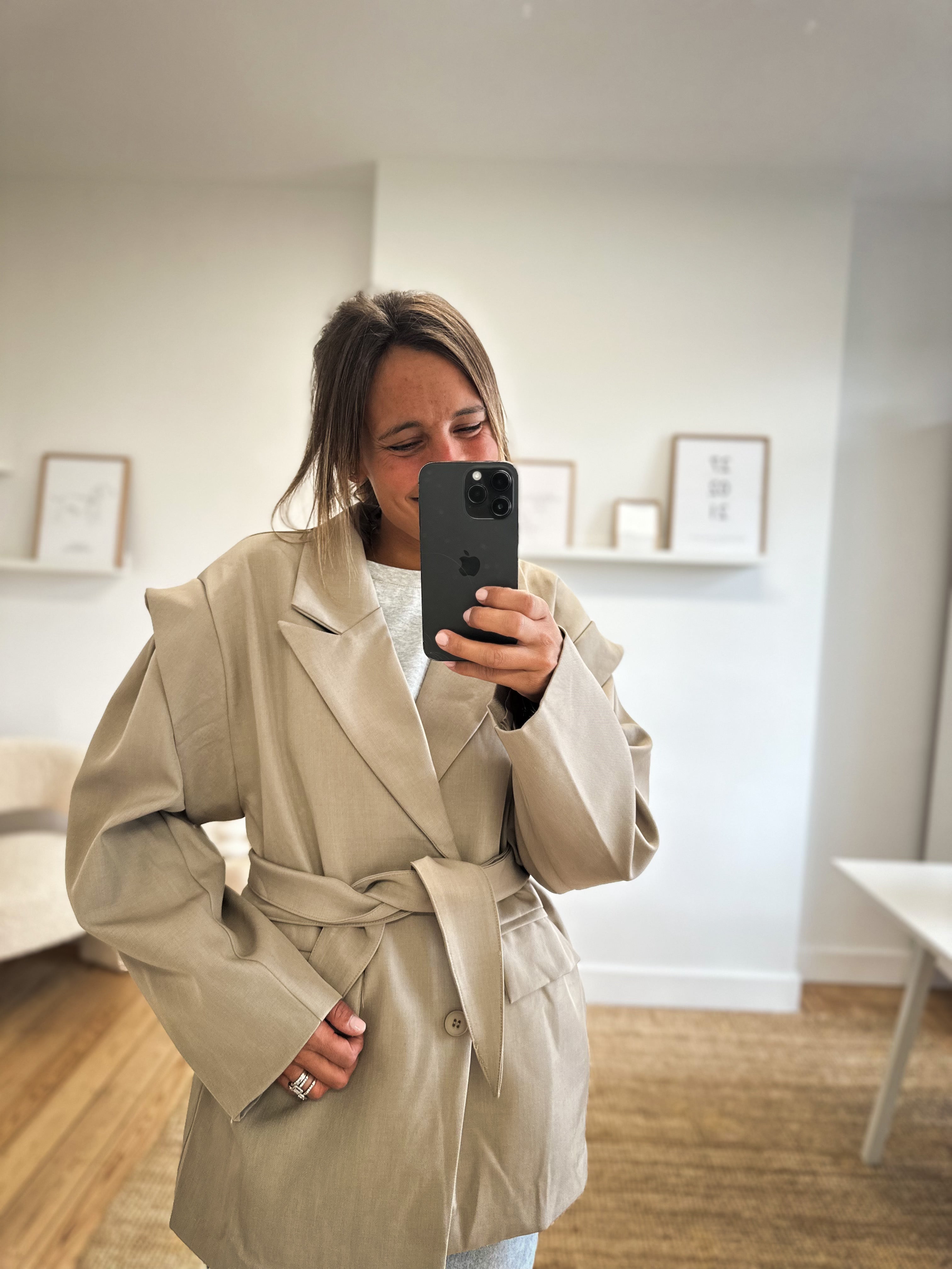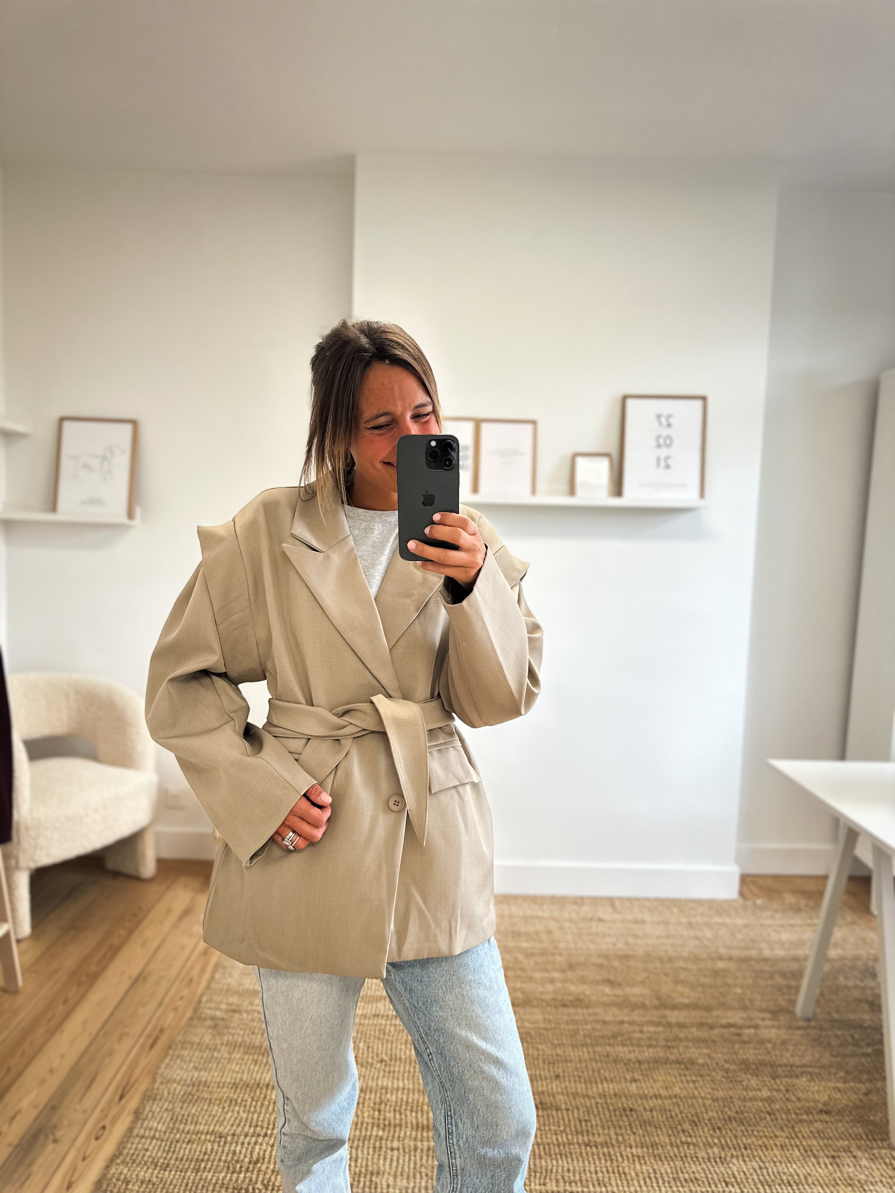 Ce blazer très ample, équipé d'une ceinture sans passant pour que vous puissiez choisir de l’attacher ou non, est disponible en bordeaux, taupe, beige et noir. Disponible en taille 1 ou 2, il s'adapte à toutes les morphologies, garantissant un look élégant et polyvalent qui rehausse n’importe quelle silhouette.