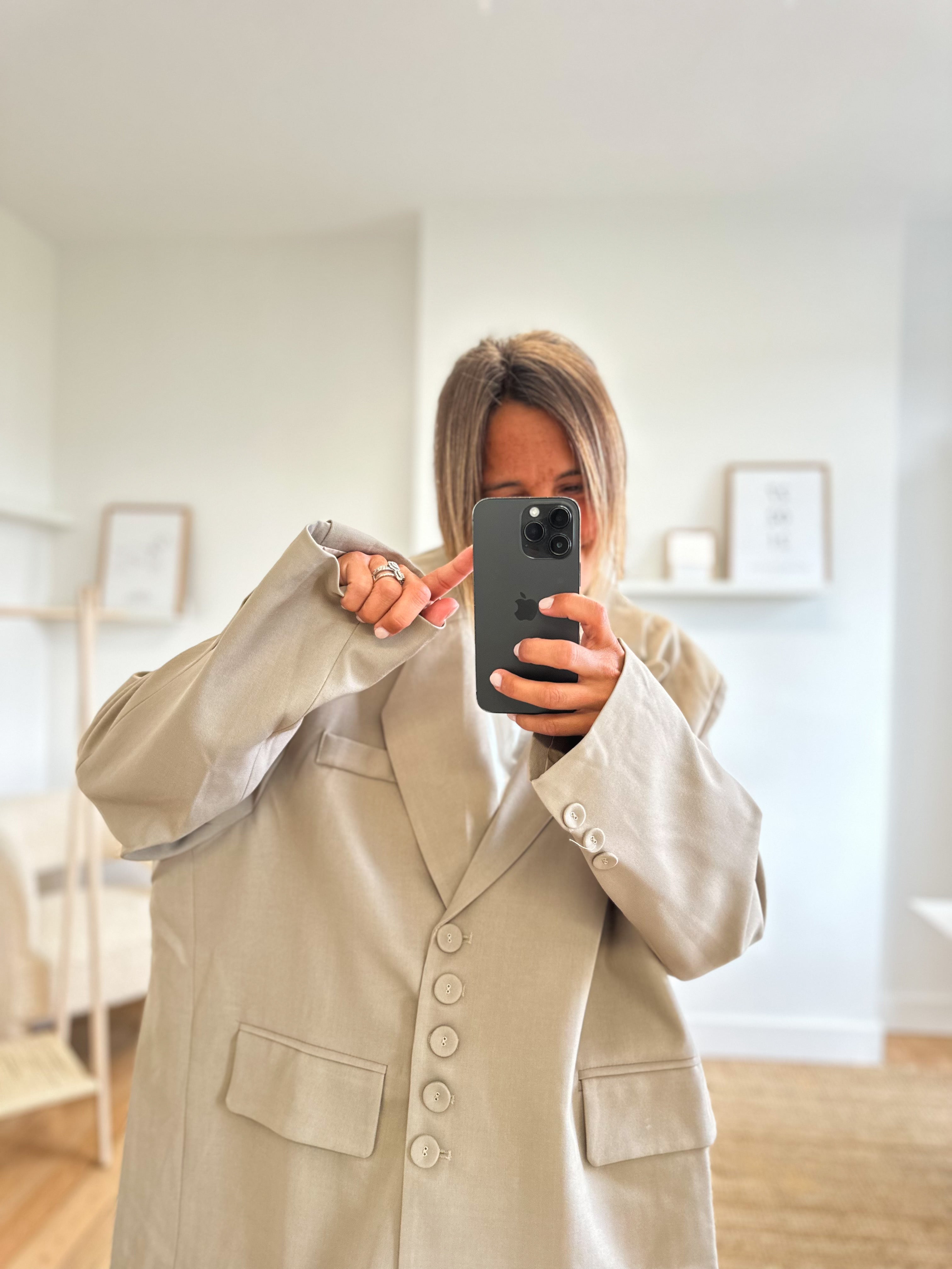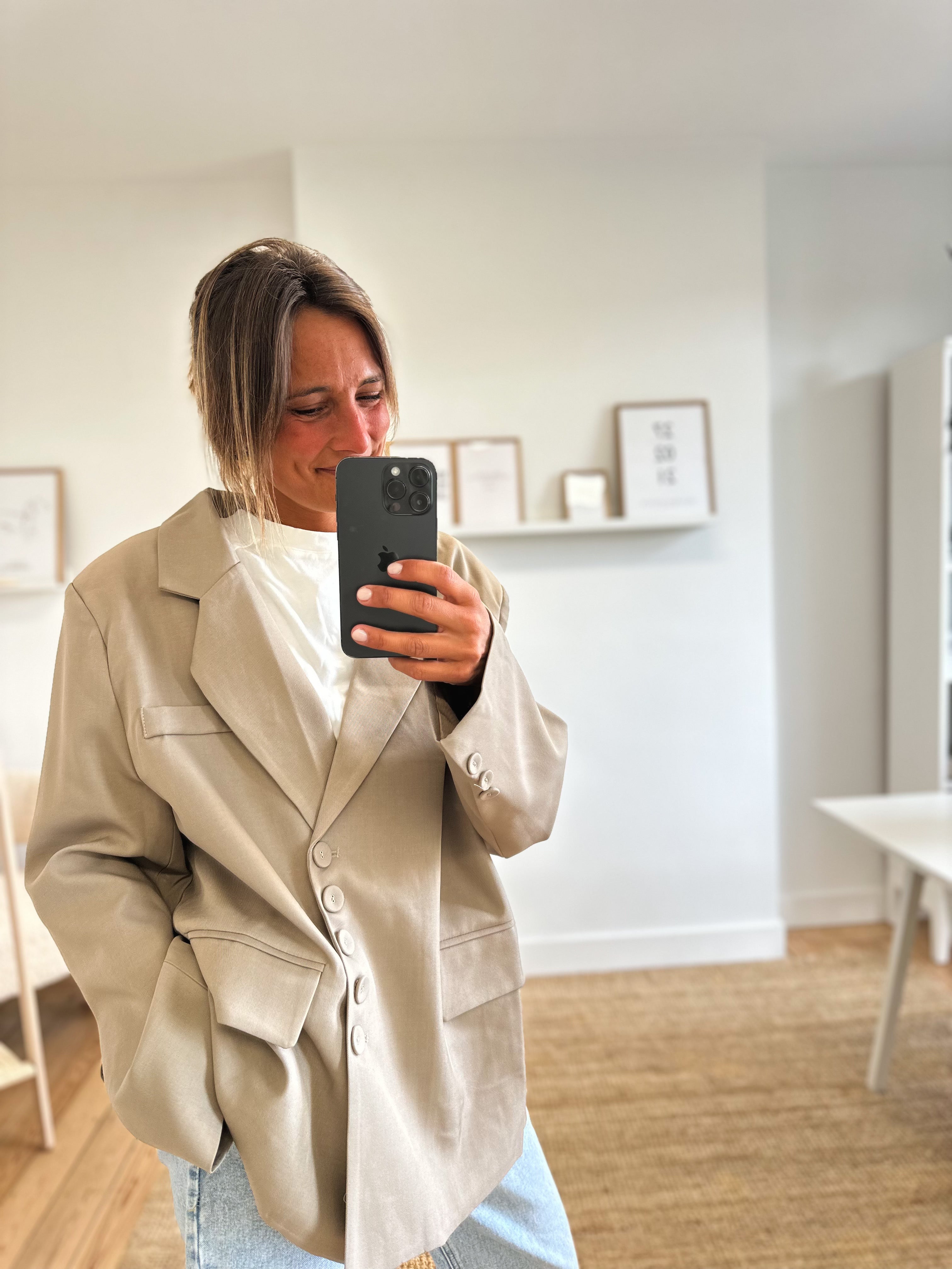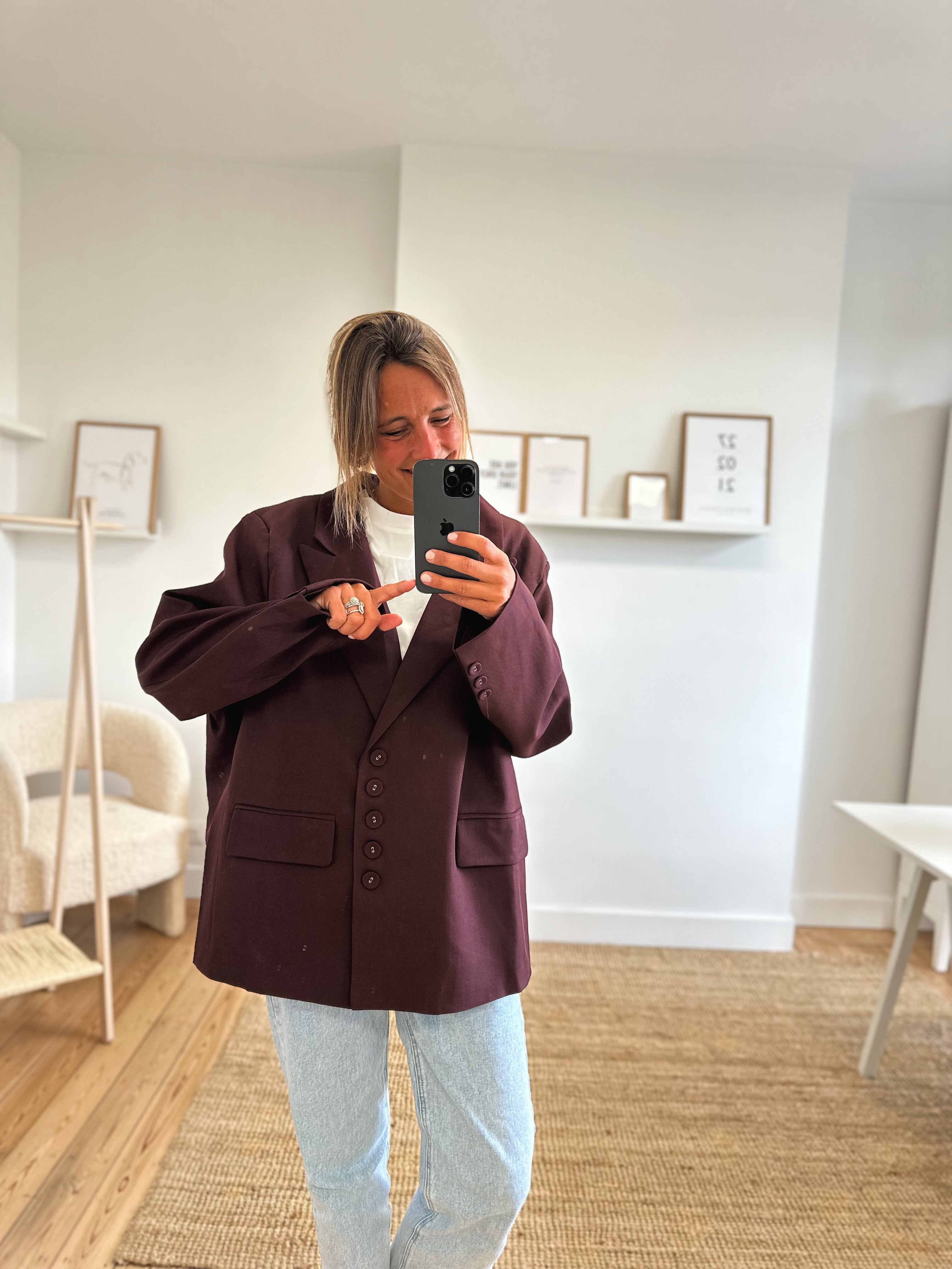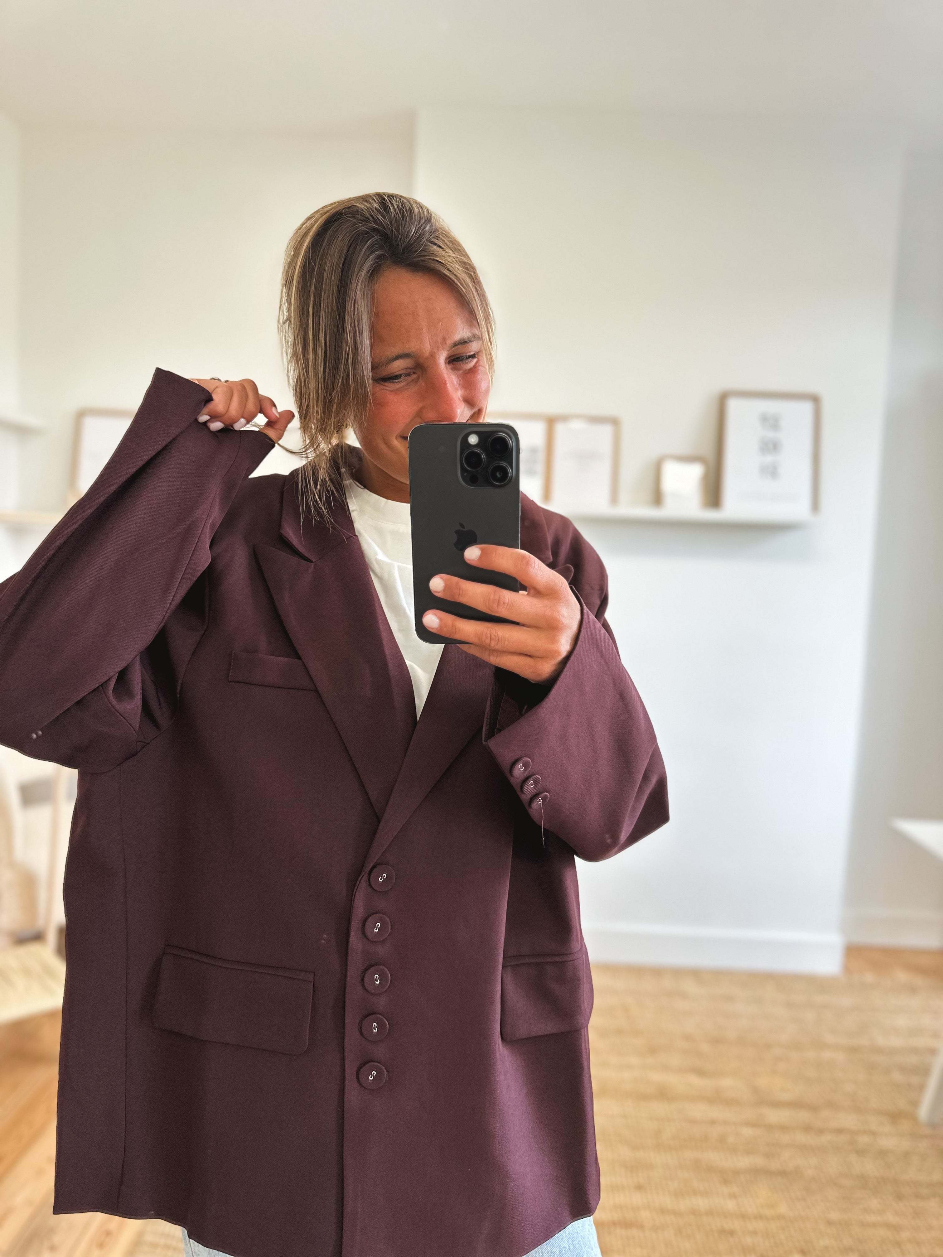 Ce blazer très oversize, orné de cinq boutons sur le devant, se décline en bordeaux, taupe, beige et noir. Conçu en taille unique, il convient parfaitement à toutes les silhouettes, offrant un style impeccable et adaptable à chaque morphologie.