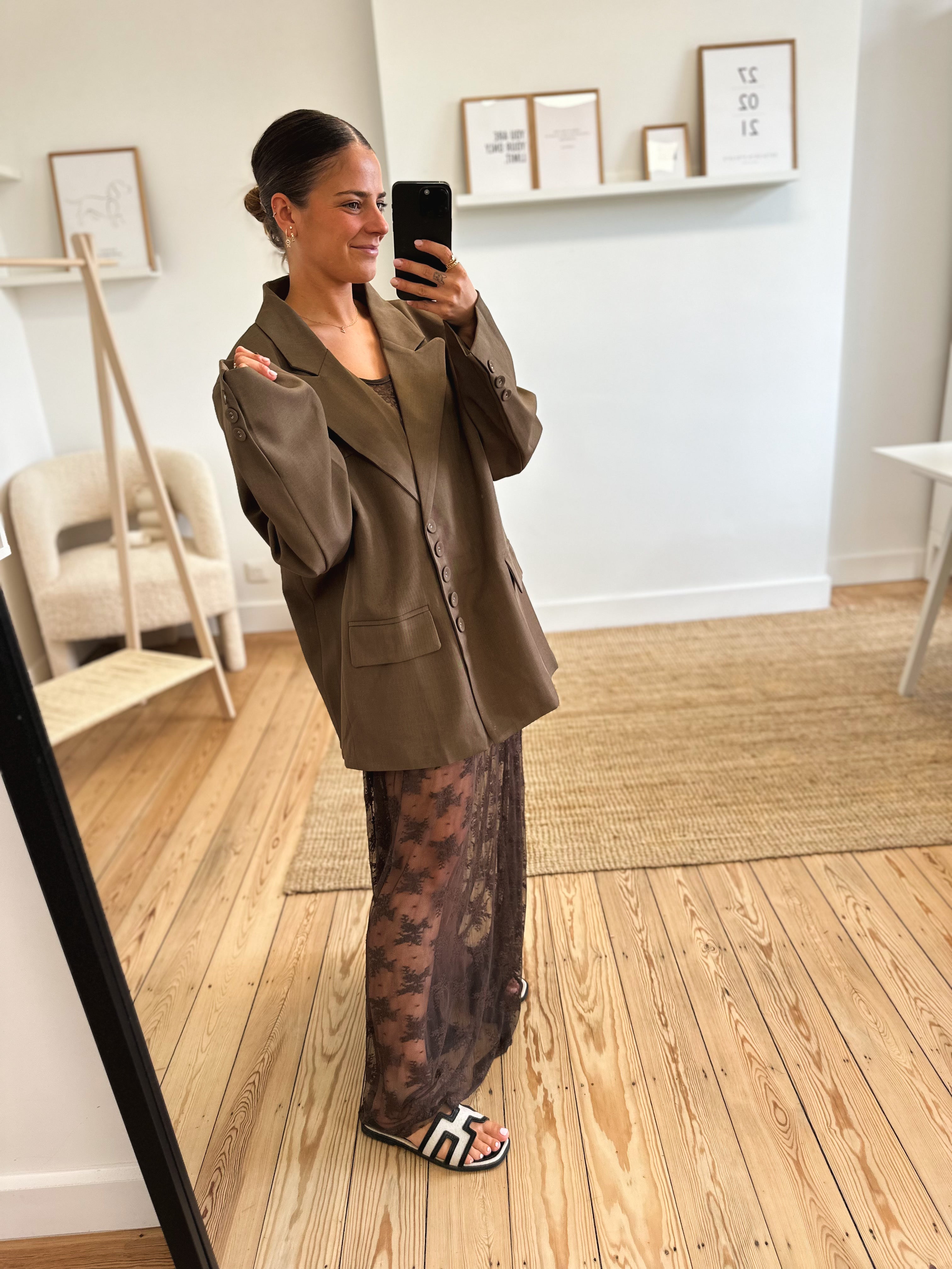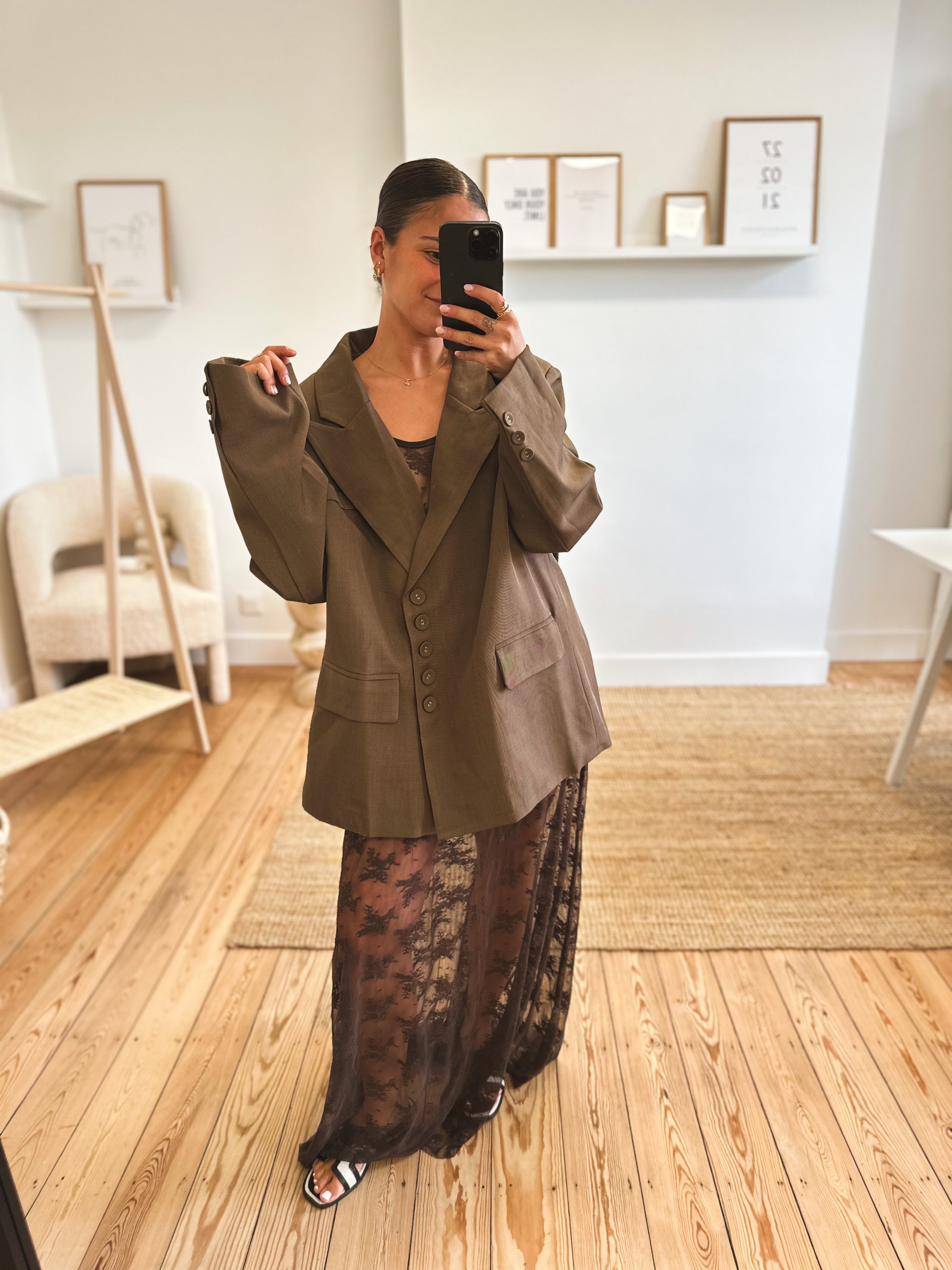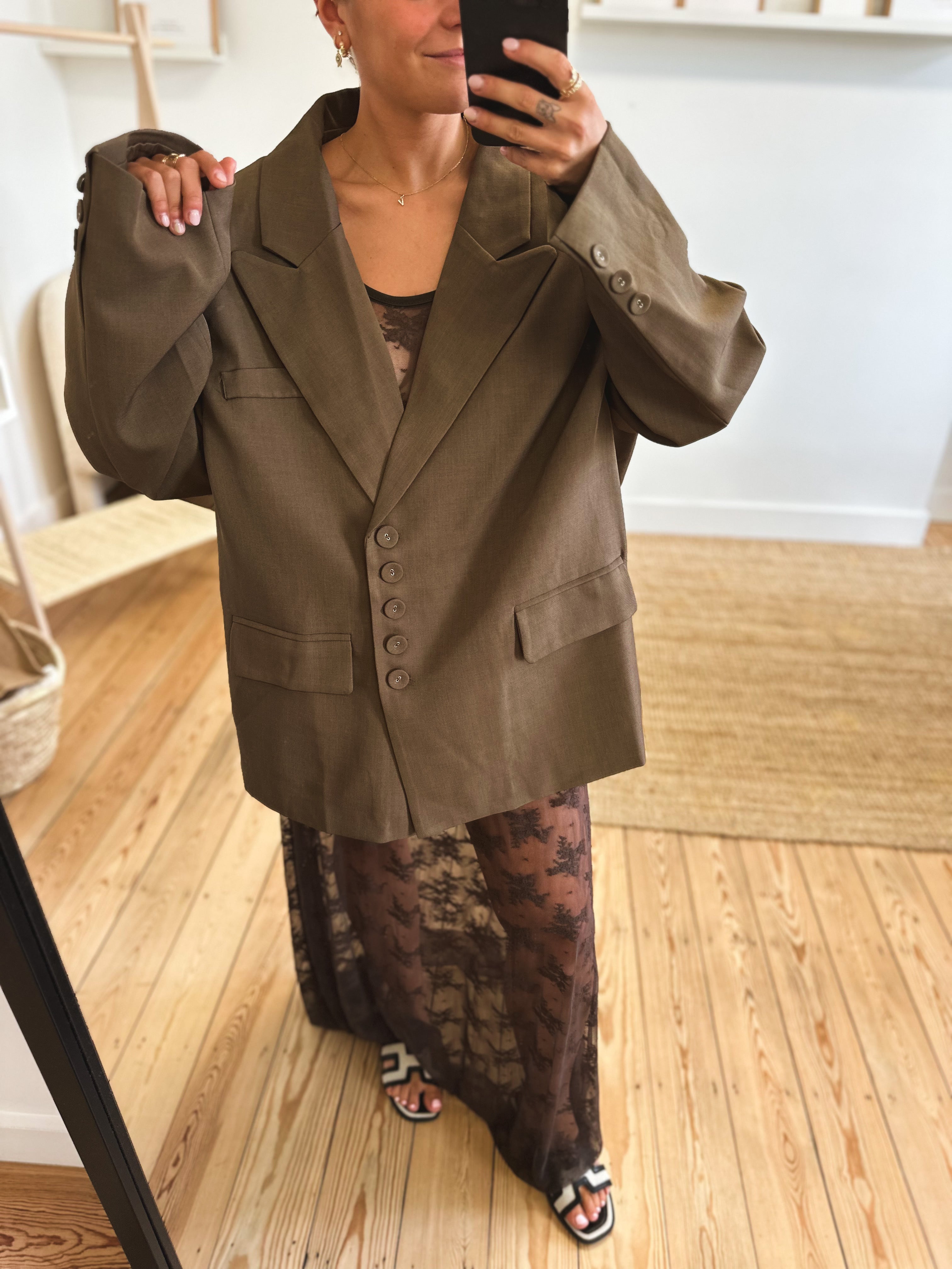 Ce blazer très oversize, orné de cinq boutons sur le devant, se décline en bordeaux, taupe, beige et noir. Conçu en taille unique, il convient parfaitement à toutes les silhouettes, offrant un style impeccable et adaptable à chaque morphologie.