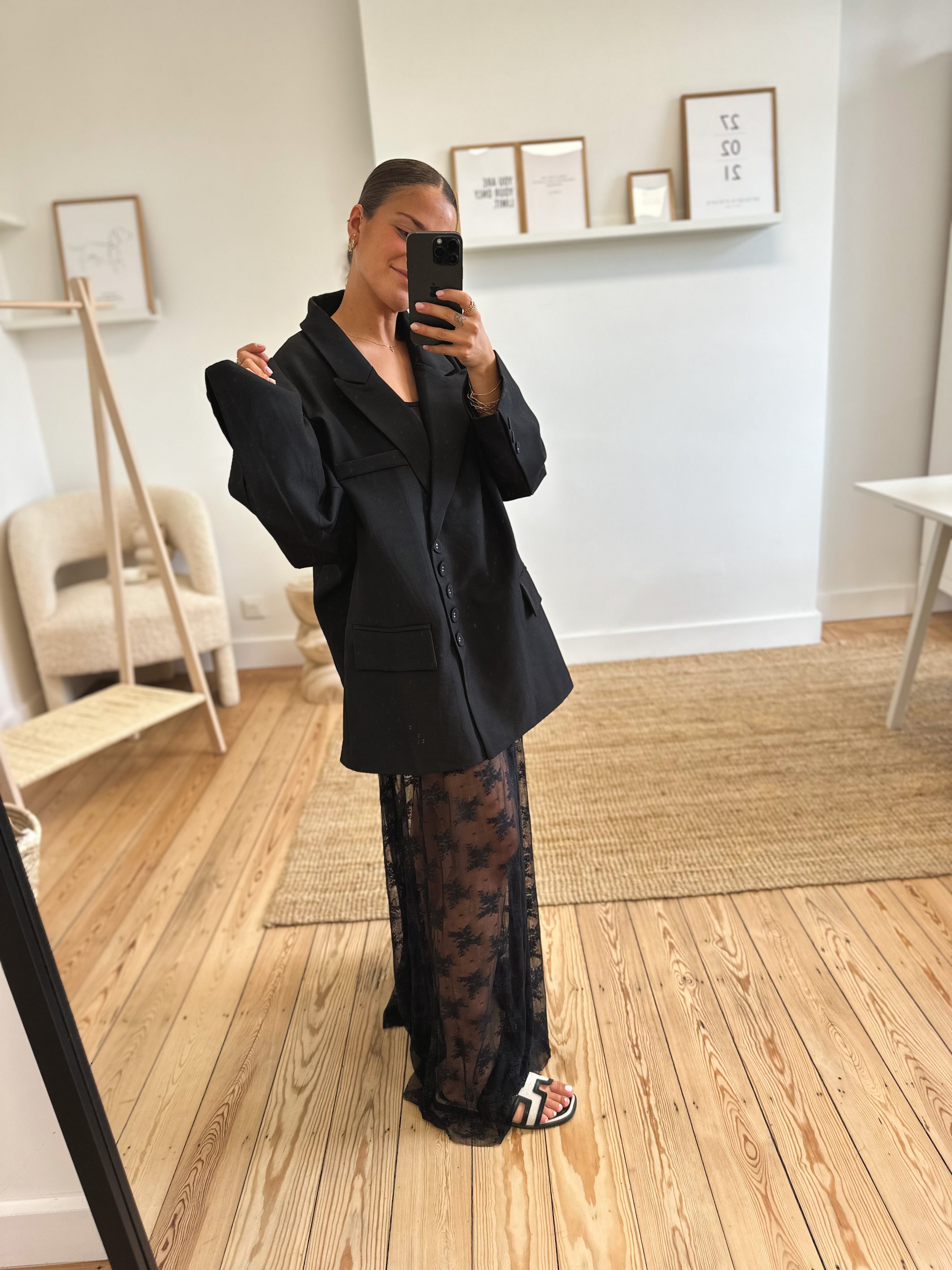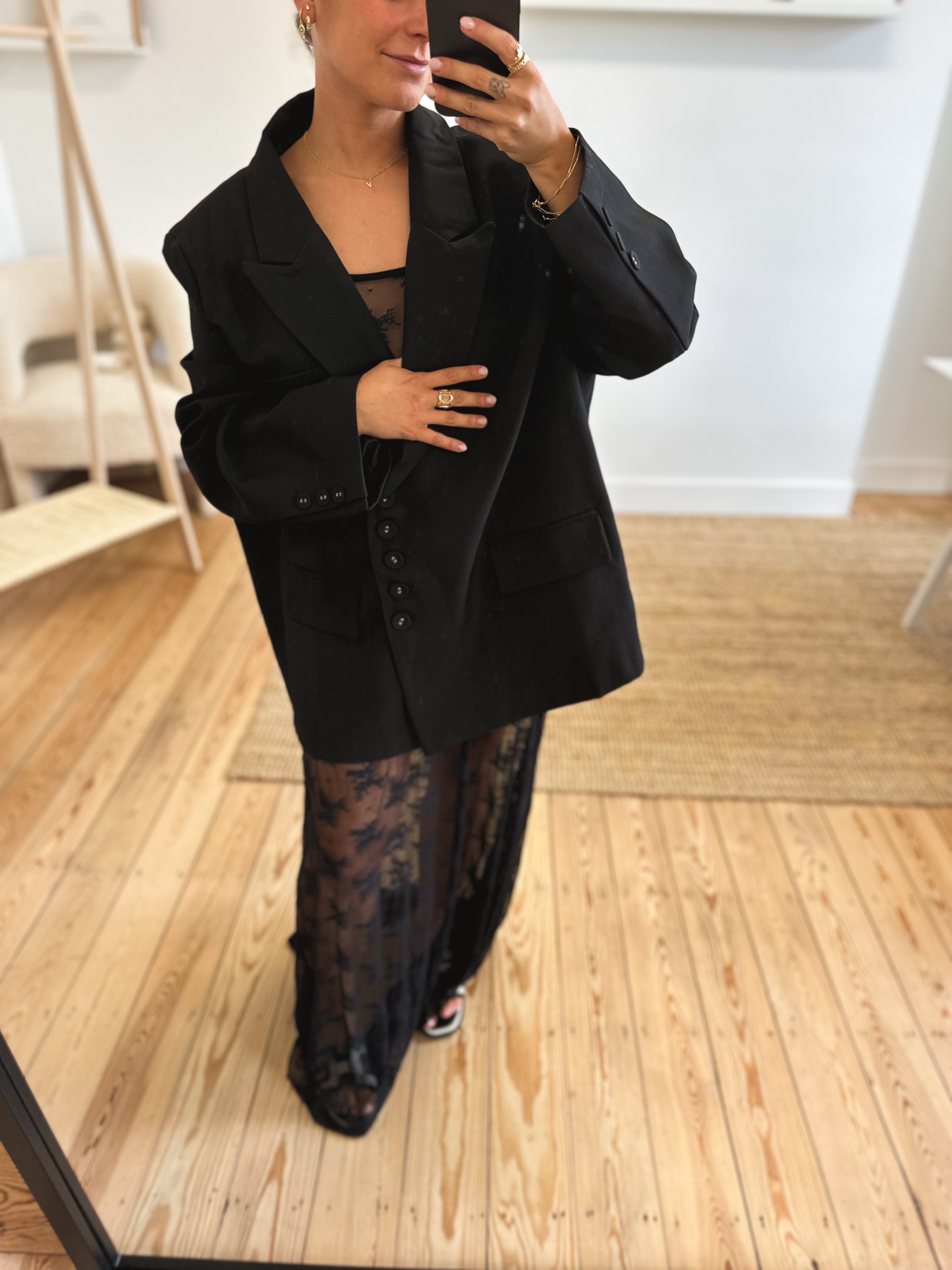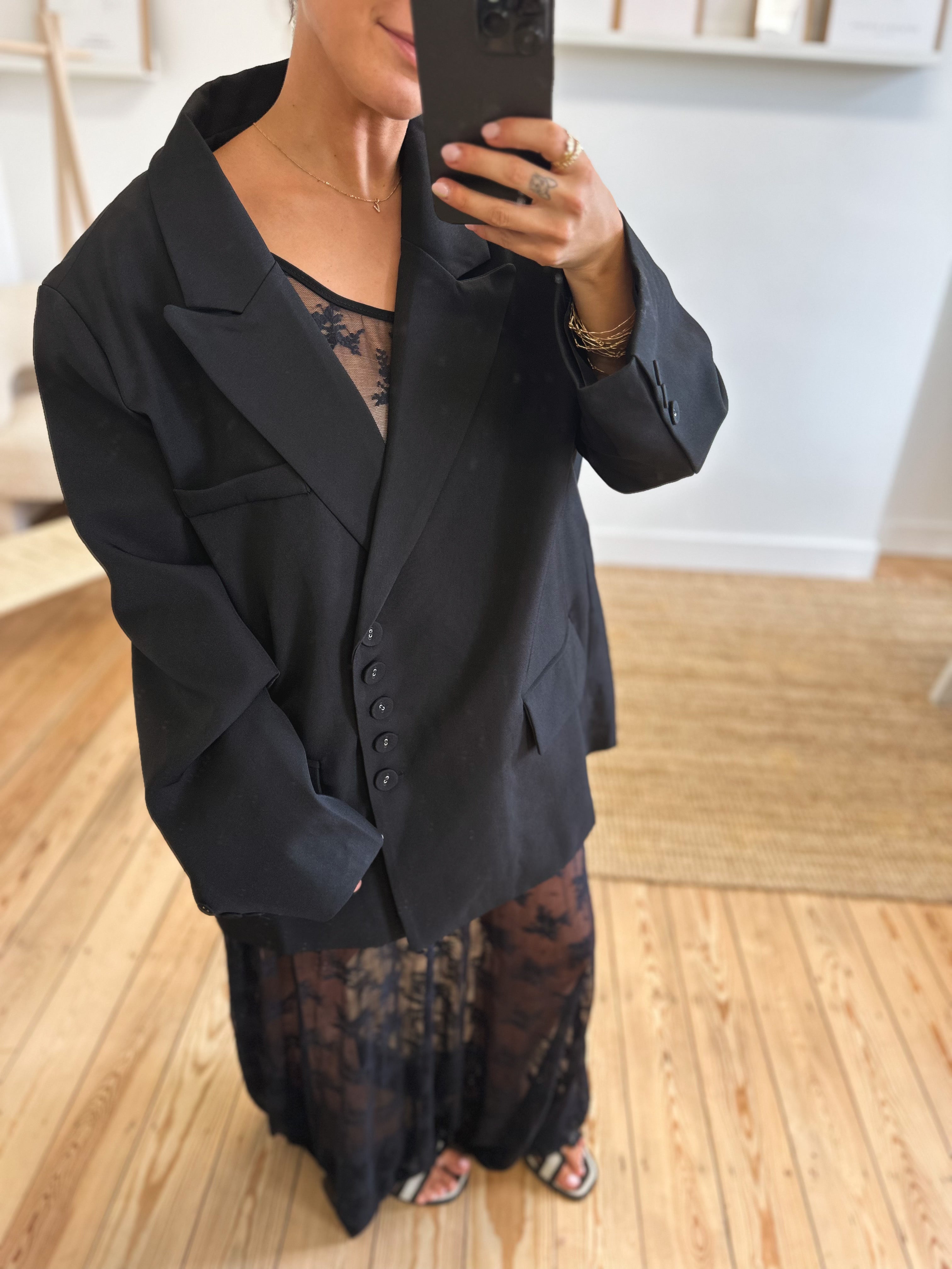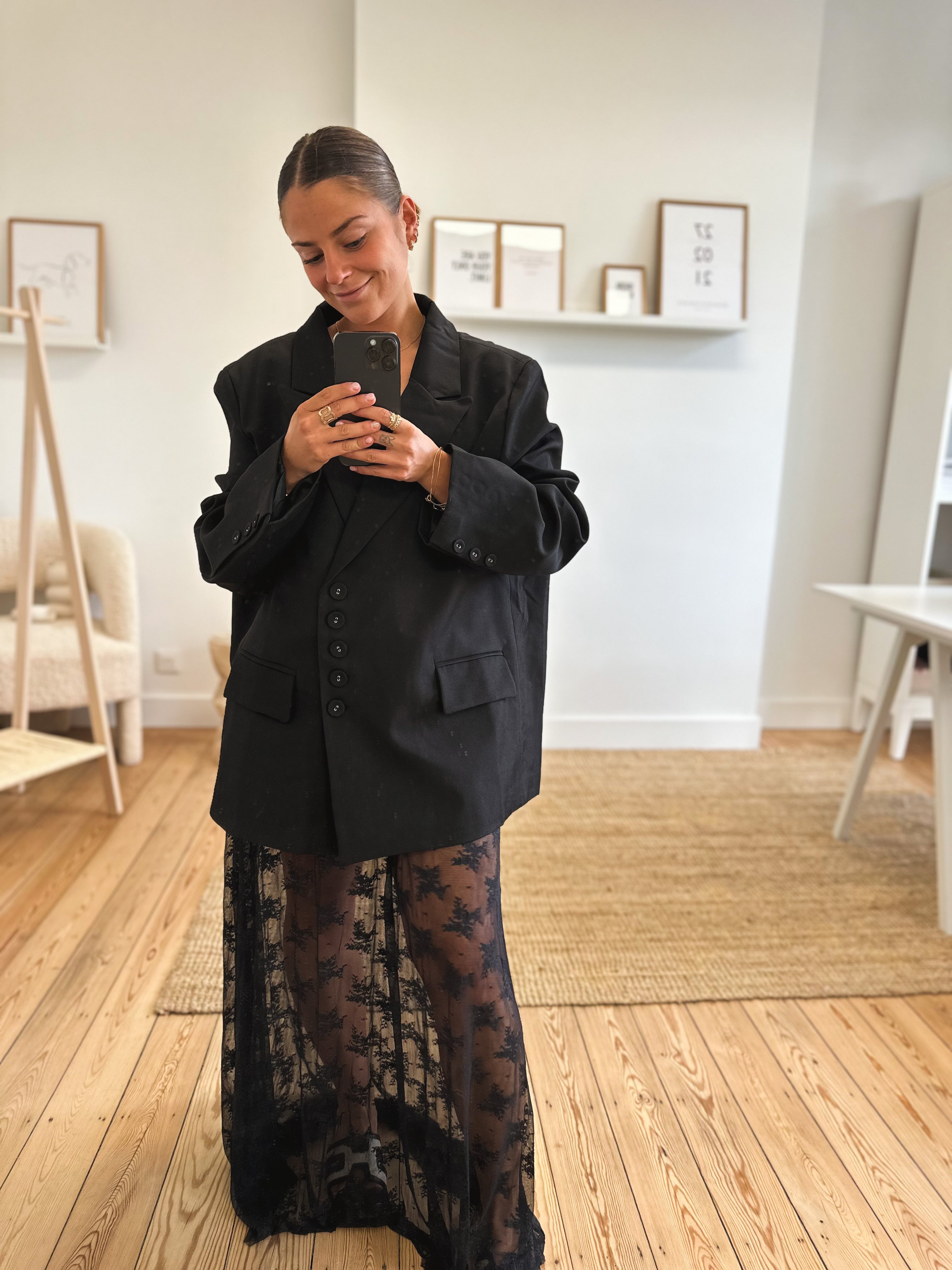 Ce blazer très oversize, orné de cinq boutons sur le devant, se décline en bordeaux, taupe, beige et noir. Conçu en taille unique, il convient parfaitement à toutes les silhouettes, offrant un style impeccable et adaptable à chaque morphologie.