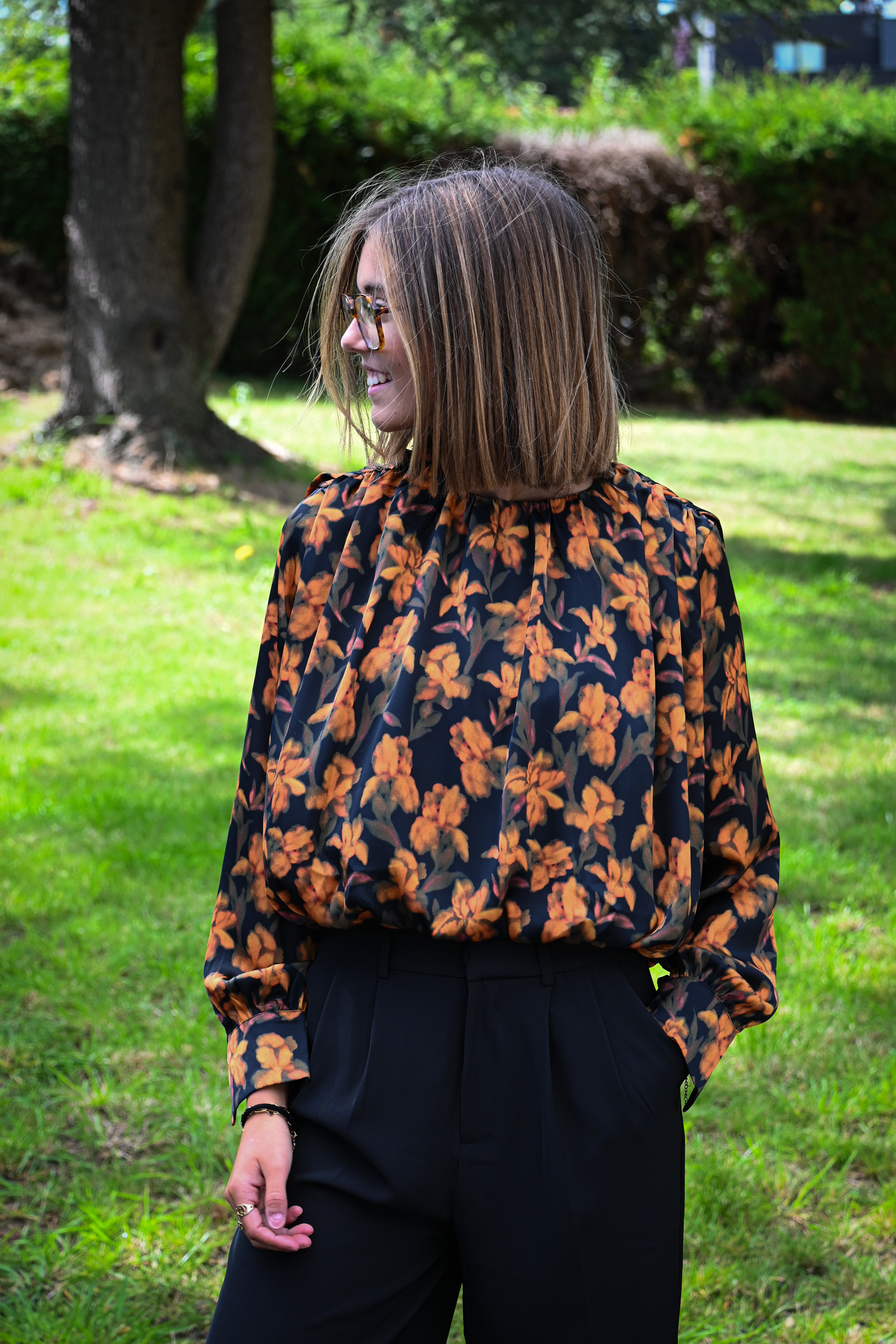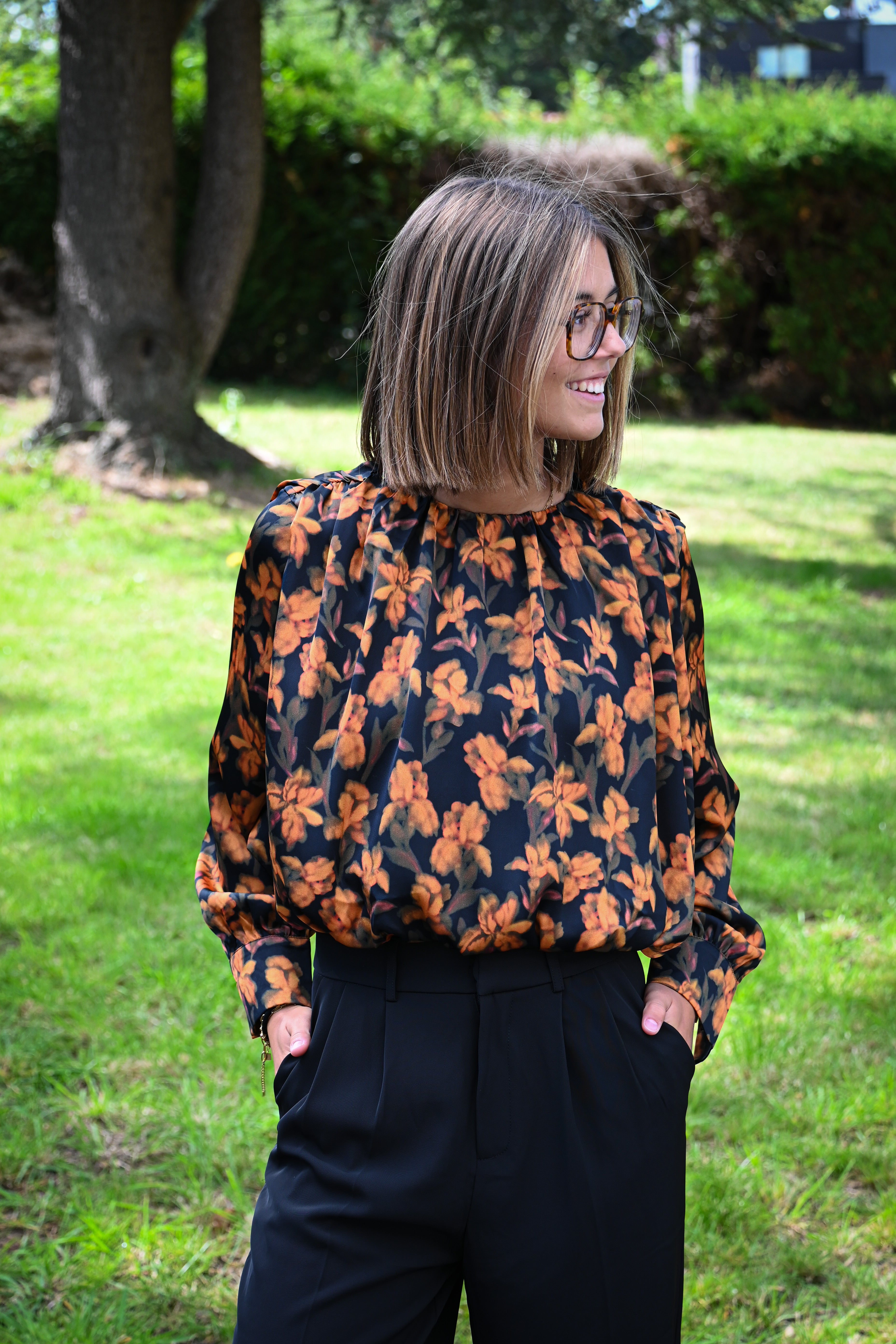 Blouse courte ajustée à la taille avec manches longues, déclinée en noir et orange. Disponible en tailles S, M, et L, elle allie style et confort pour sublimer votre silhouette.
