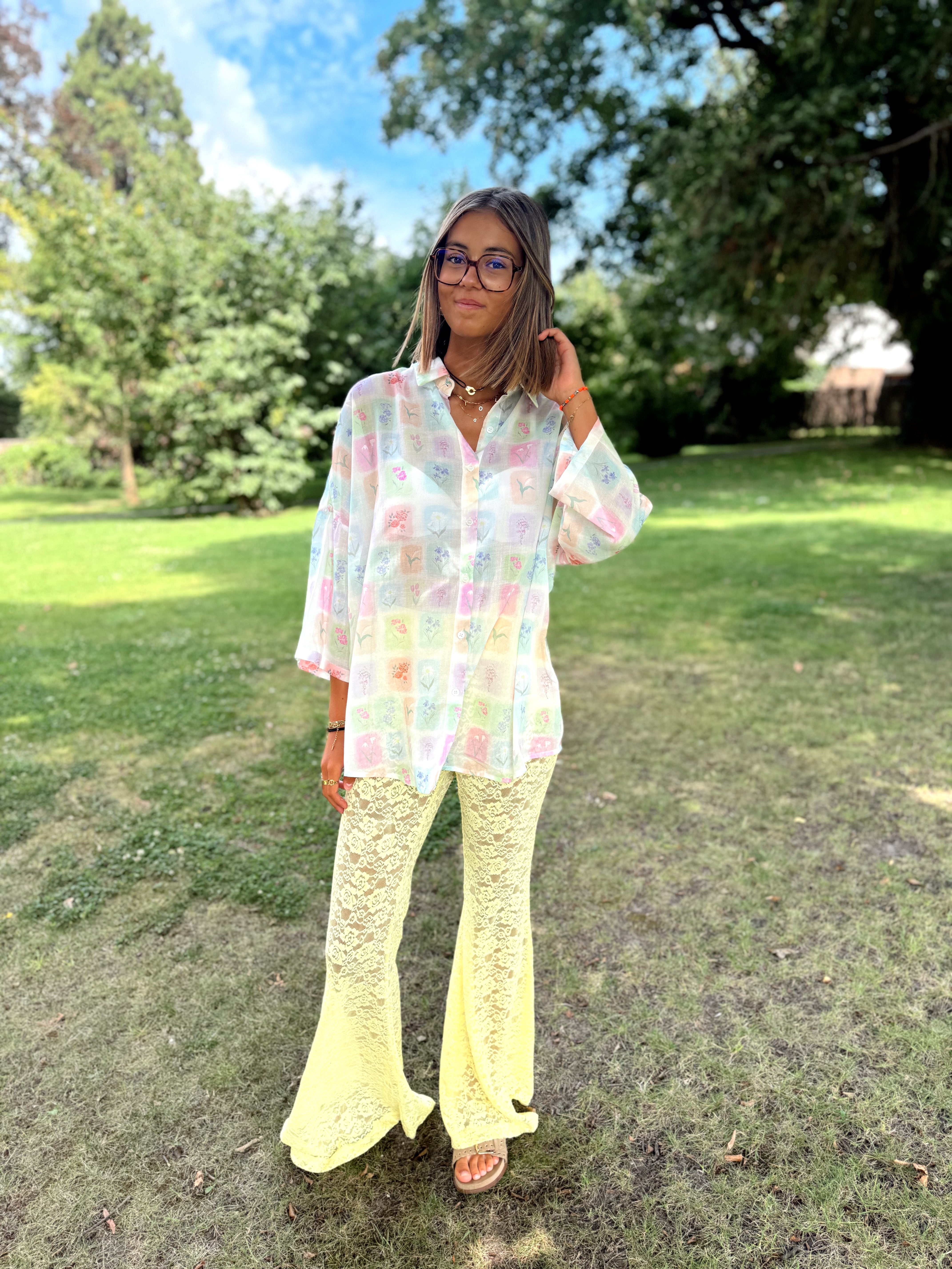 Cette chemise longue à manches trois-quarts présente un motif floral délicat et une coupe oversize, avec une légère transparence qui ajoute une touche de féminité et d'élégance à votre tenue. Disponible en S-M et L.