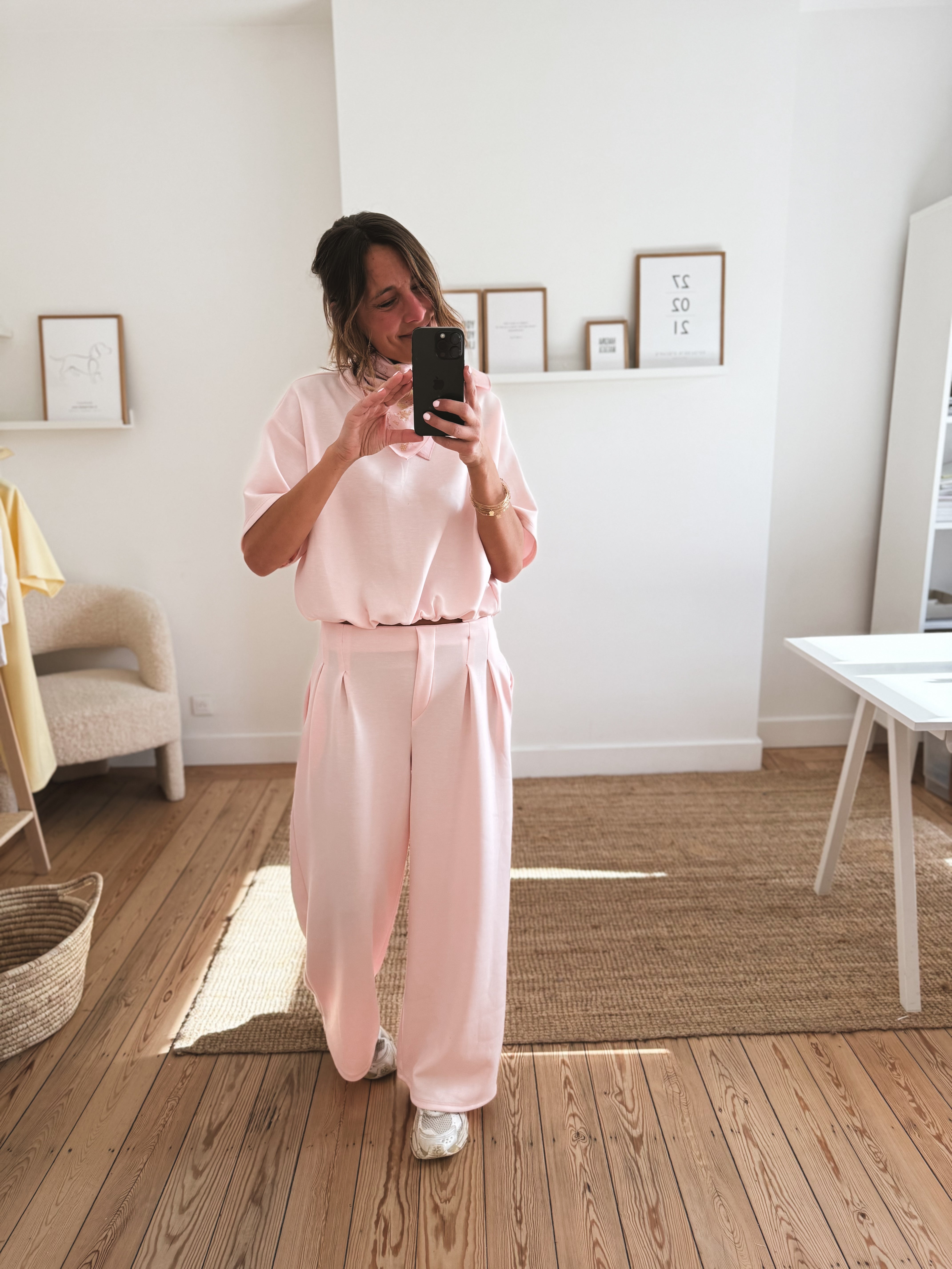 Ce pantalon est proposé en plusieurs couleurs et motifs, avec une coupe ajustée sur les cuisses et évasée en bas. Confectionné dans une matière douce et extensible, il assure un confort optimal. Disponible en tailles S, M et L.