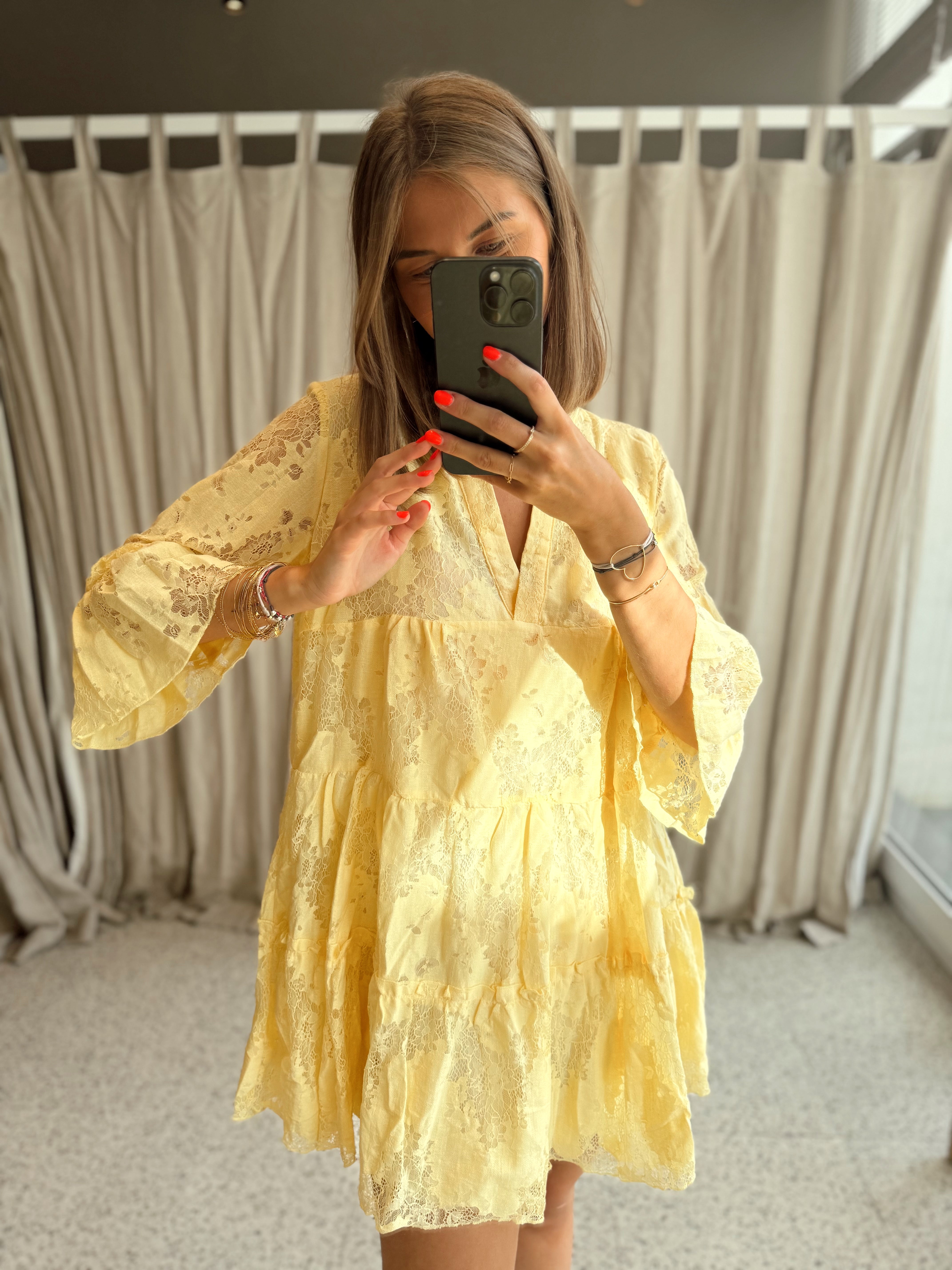 Cette robe jaune en dentelle, dotée de manches trois-quarts, se distingue par son col en V élégant qui sublime votre silhouette. Elle est disponible en taille unique.