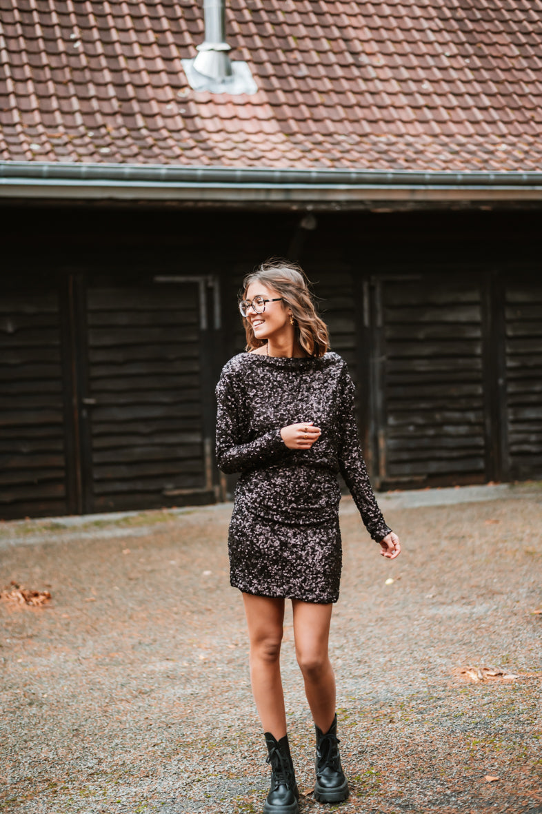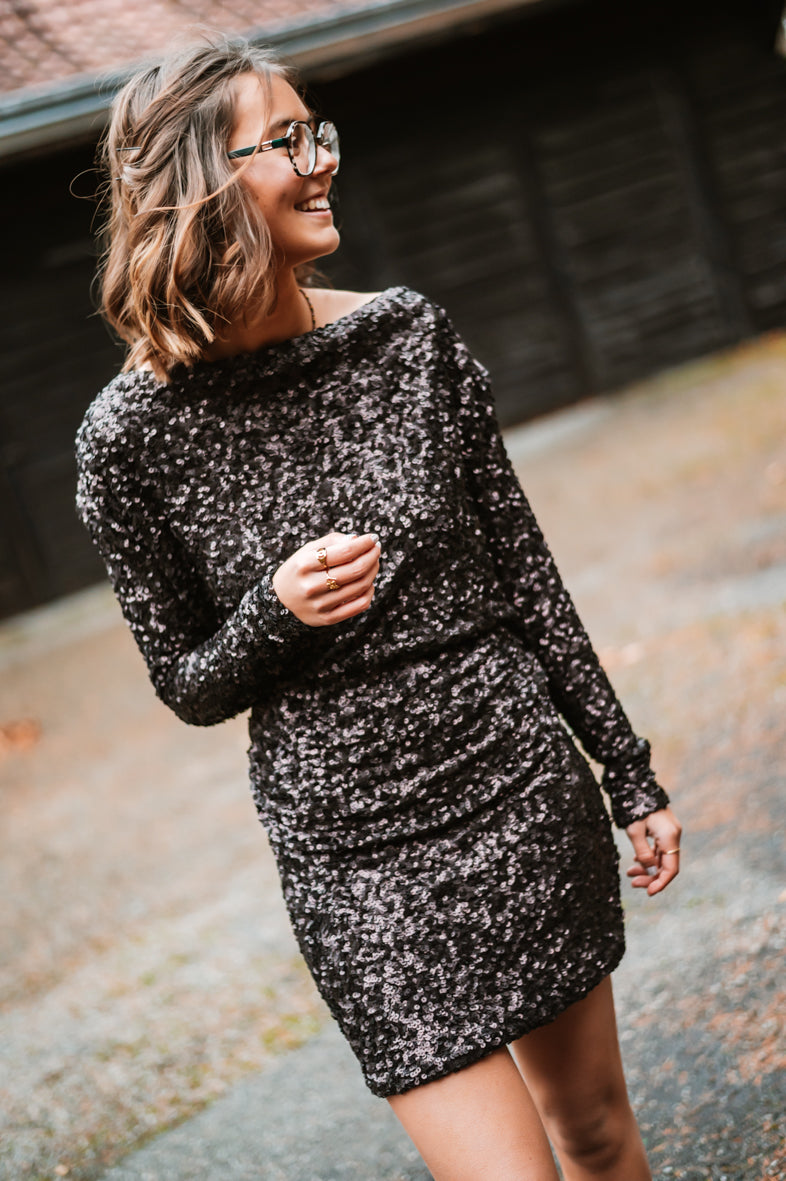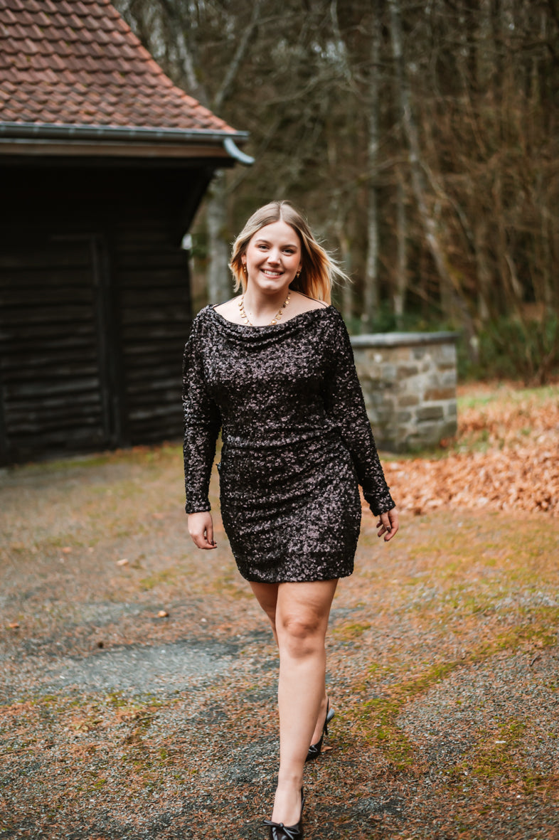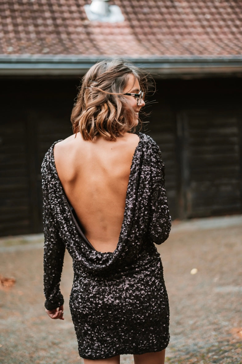 Découvrez la Robe LIDIA, une pièce pour vos soirées glamour. Avec ses sequins scintillants, ses manches longues élégantes et son dos plongeant audacieux, elle garantit une allure irrésistible. Disponible en S, M et L pour un ajustement parfait.