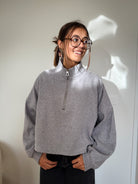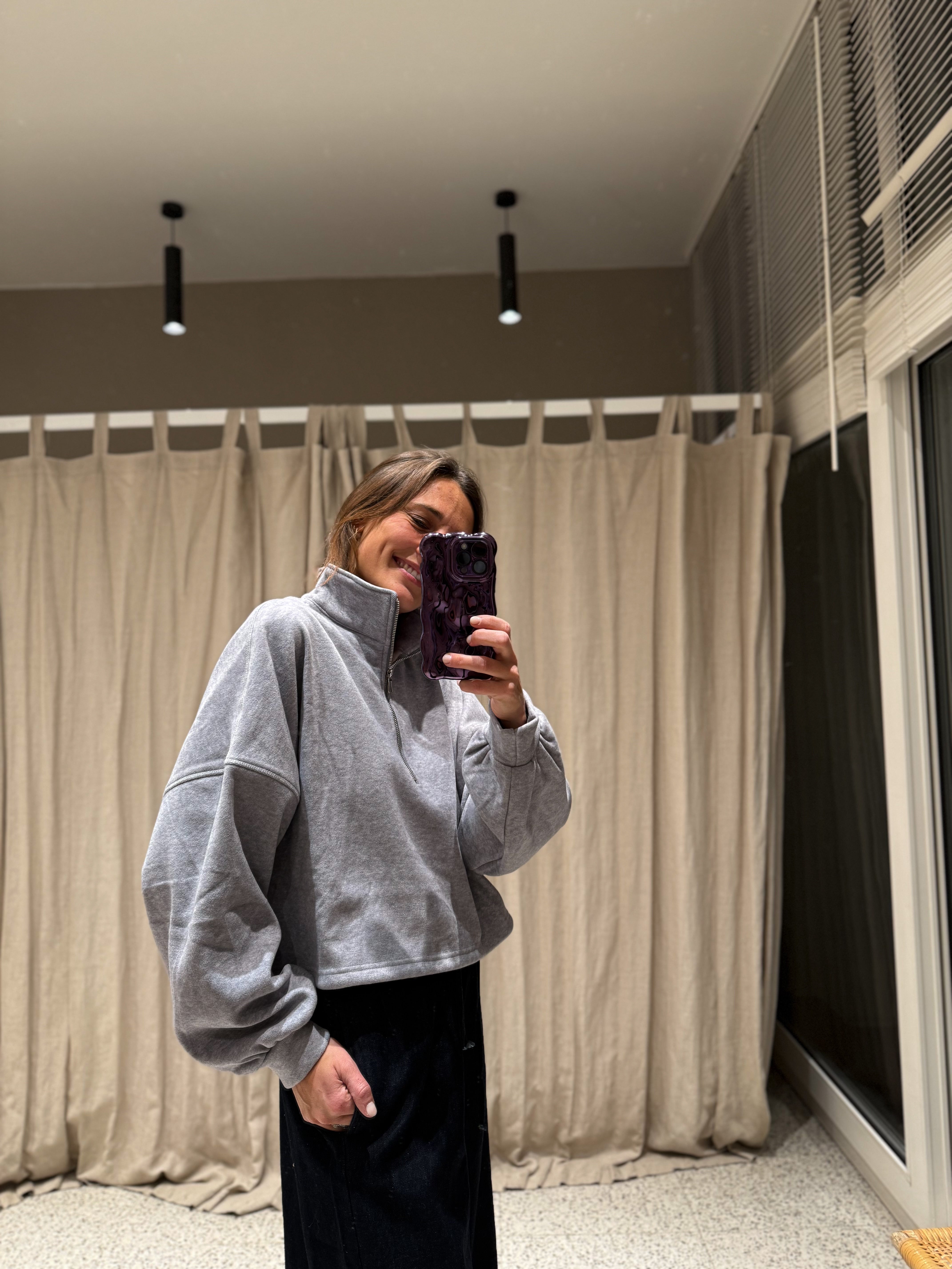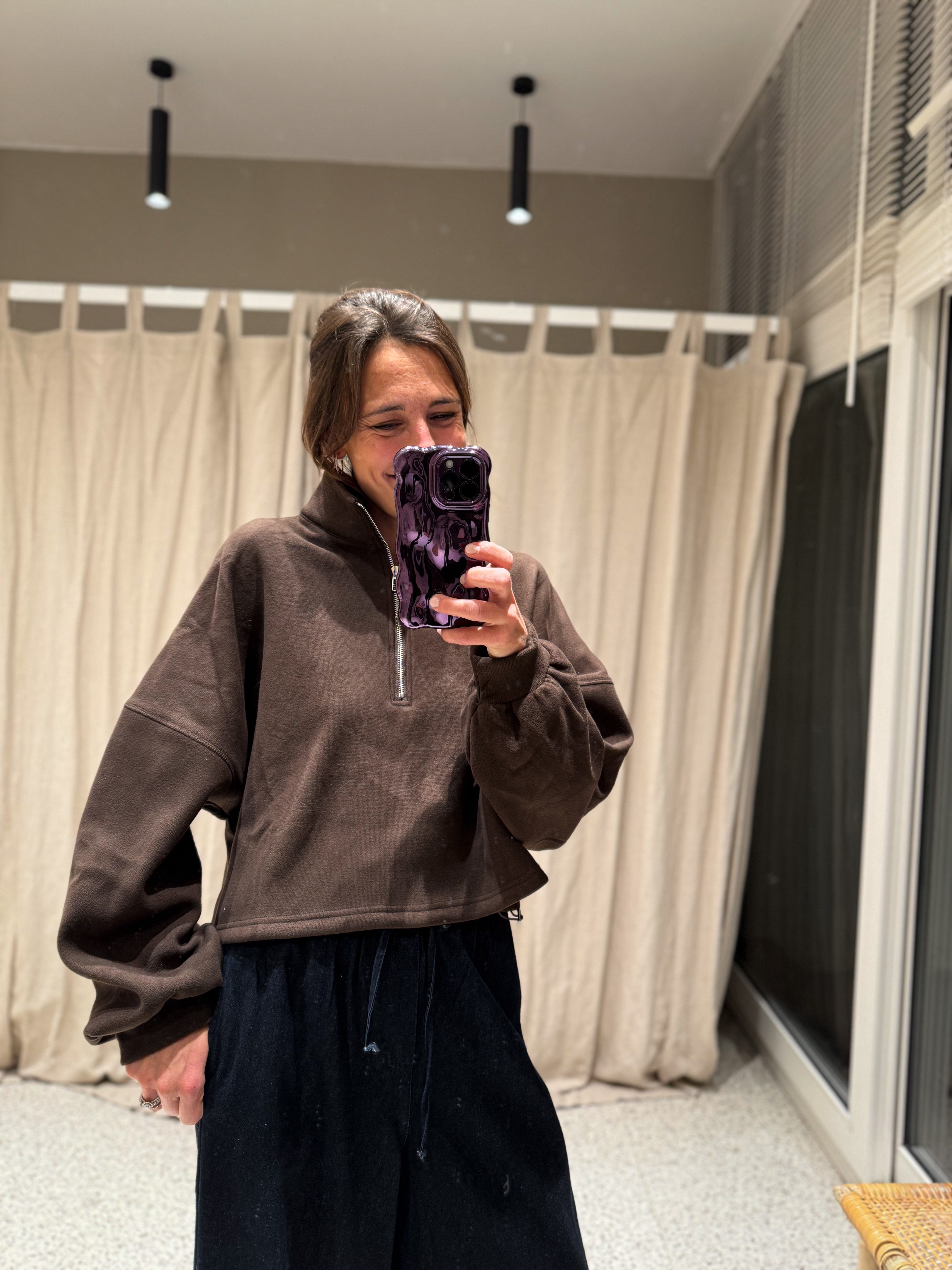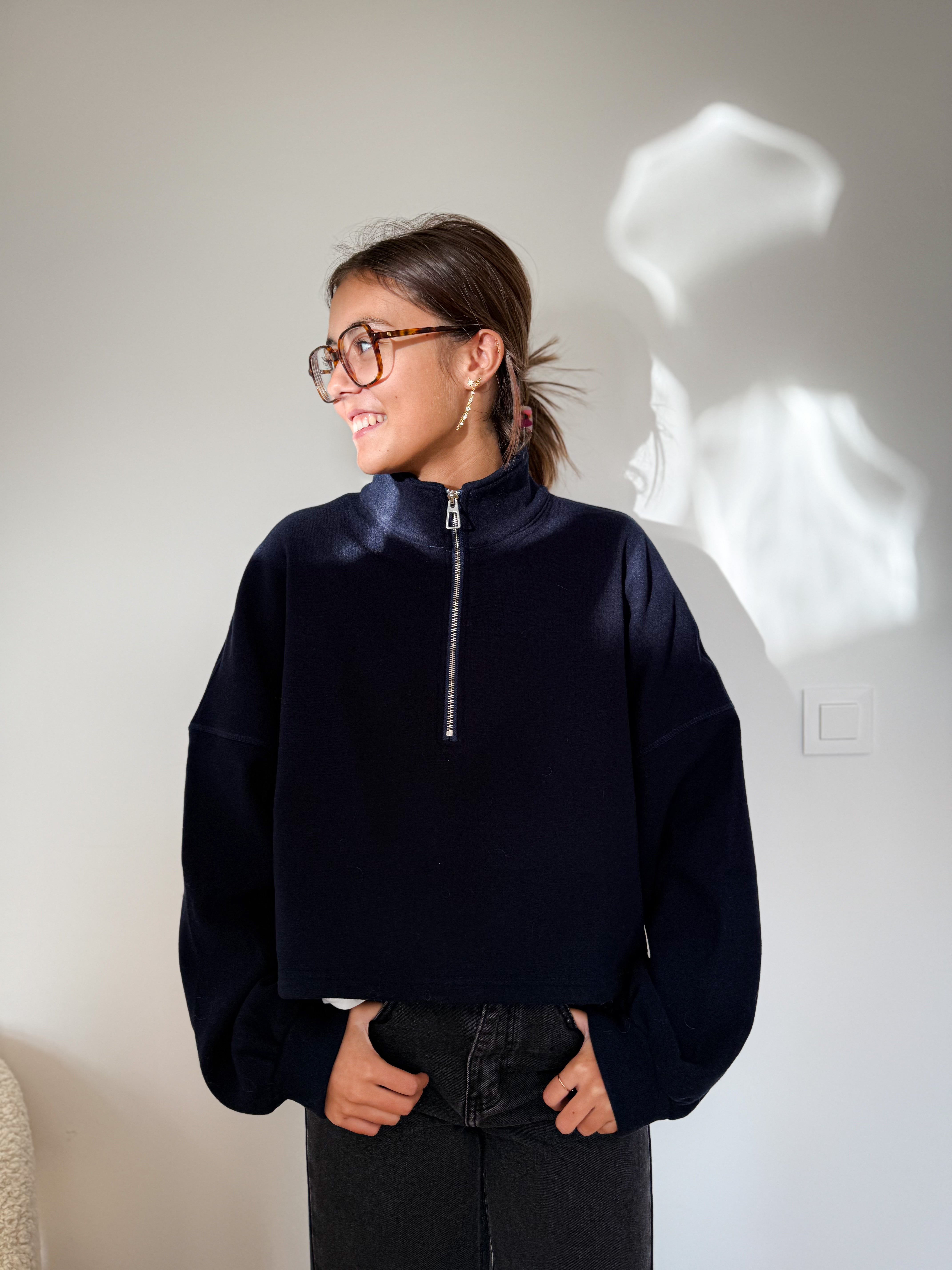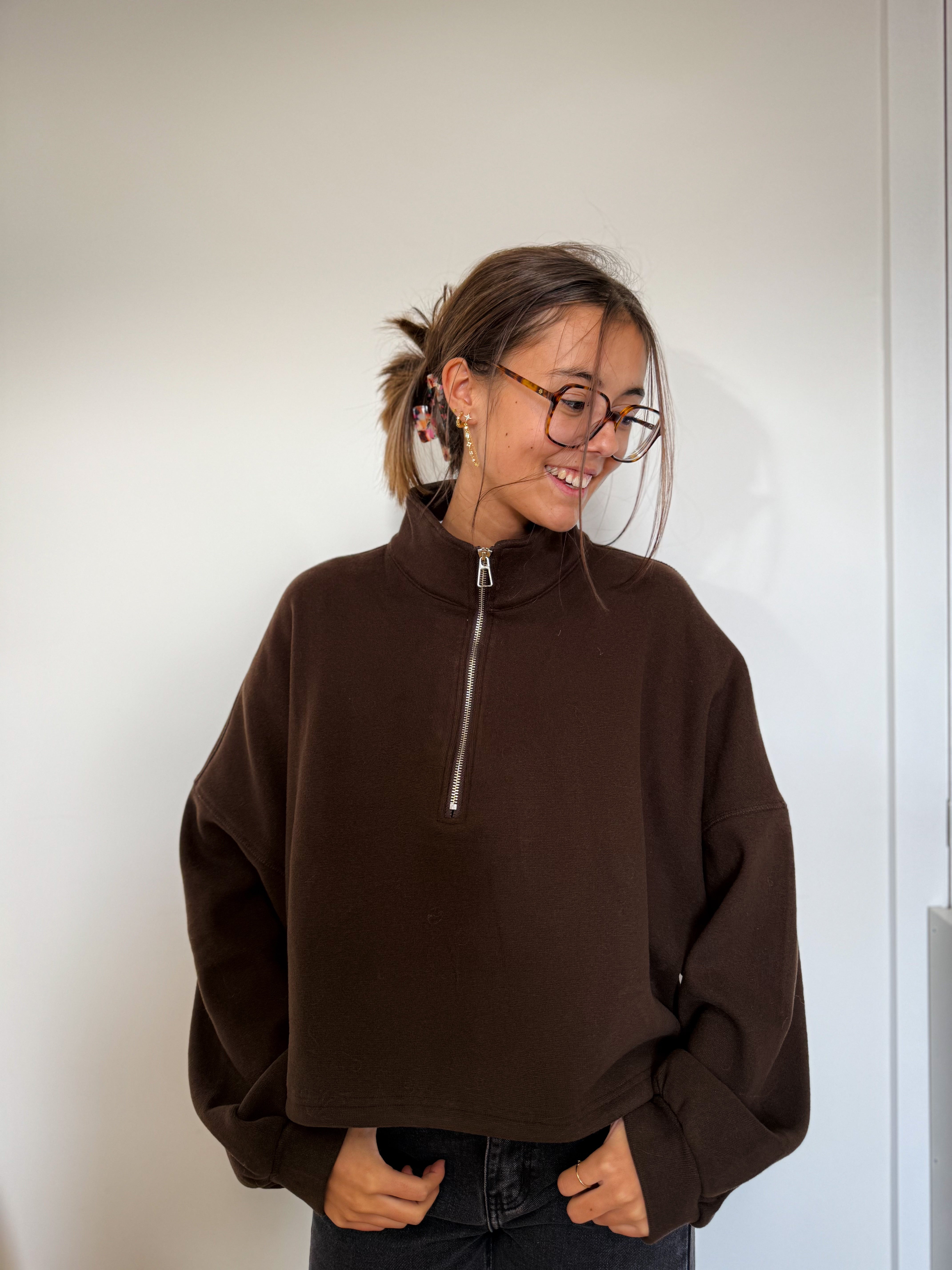 Ce sweat court à manches longues, doté d'une tirette pratique, est proposé en chocolat, bleu et gris clair. Sa taille unique, ample et confortable, s'adapte parfaitement à toutes les silhouettes. Un choix polyvalent et stylé pour votre garde-robe.