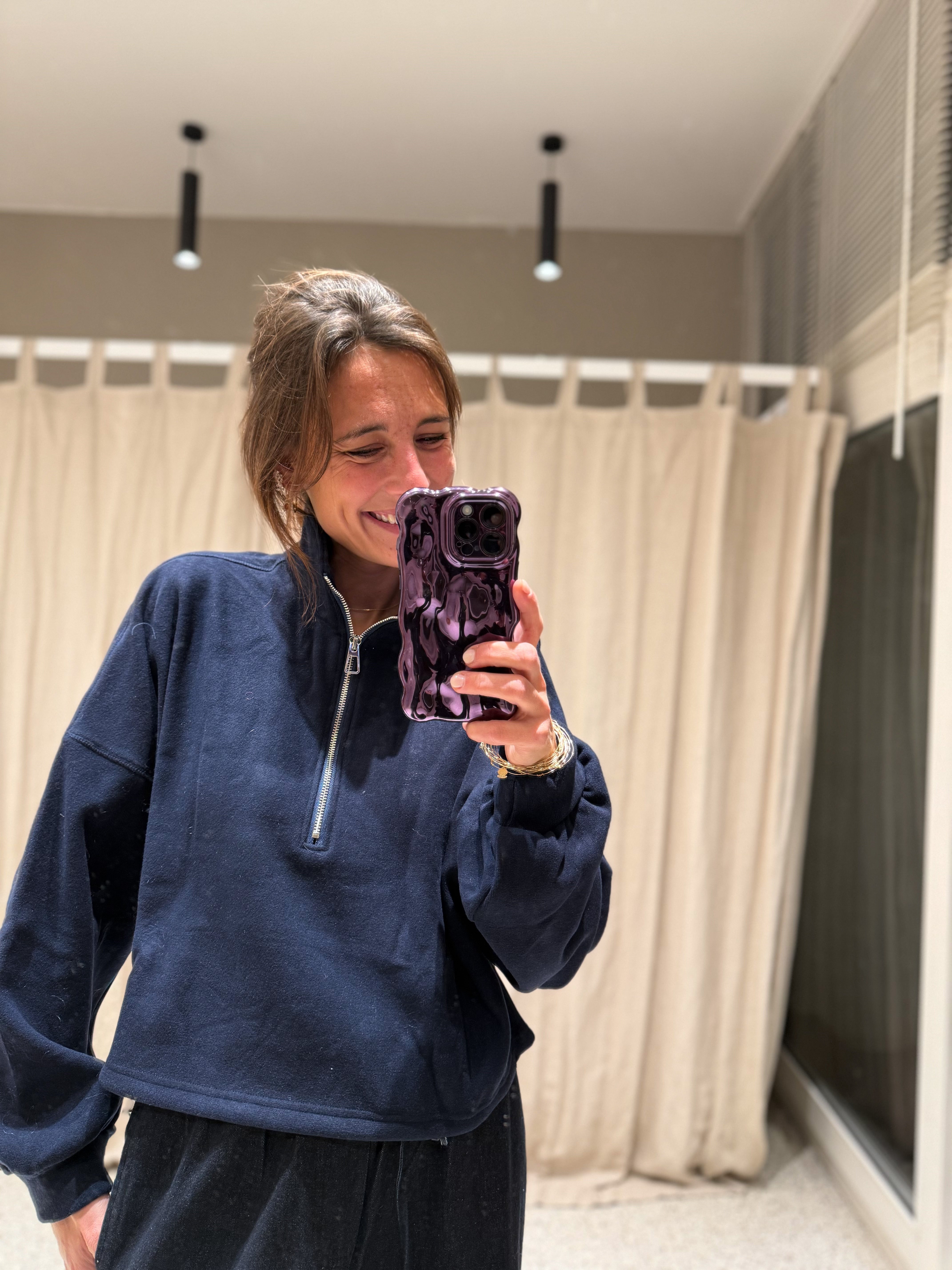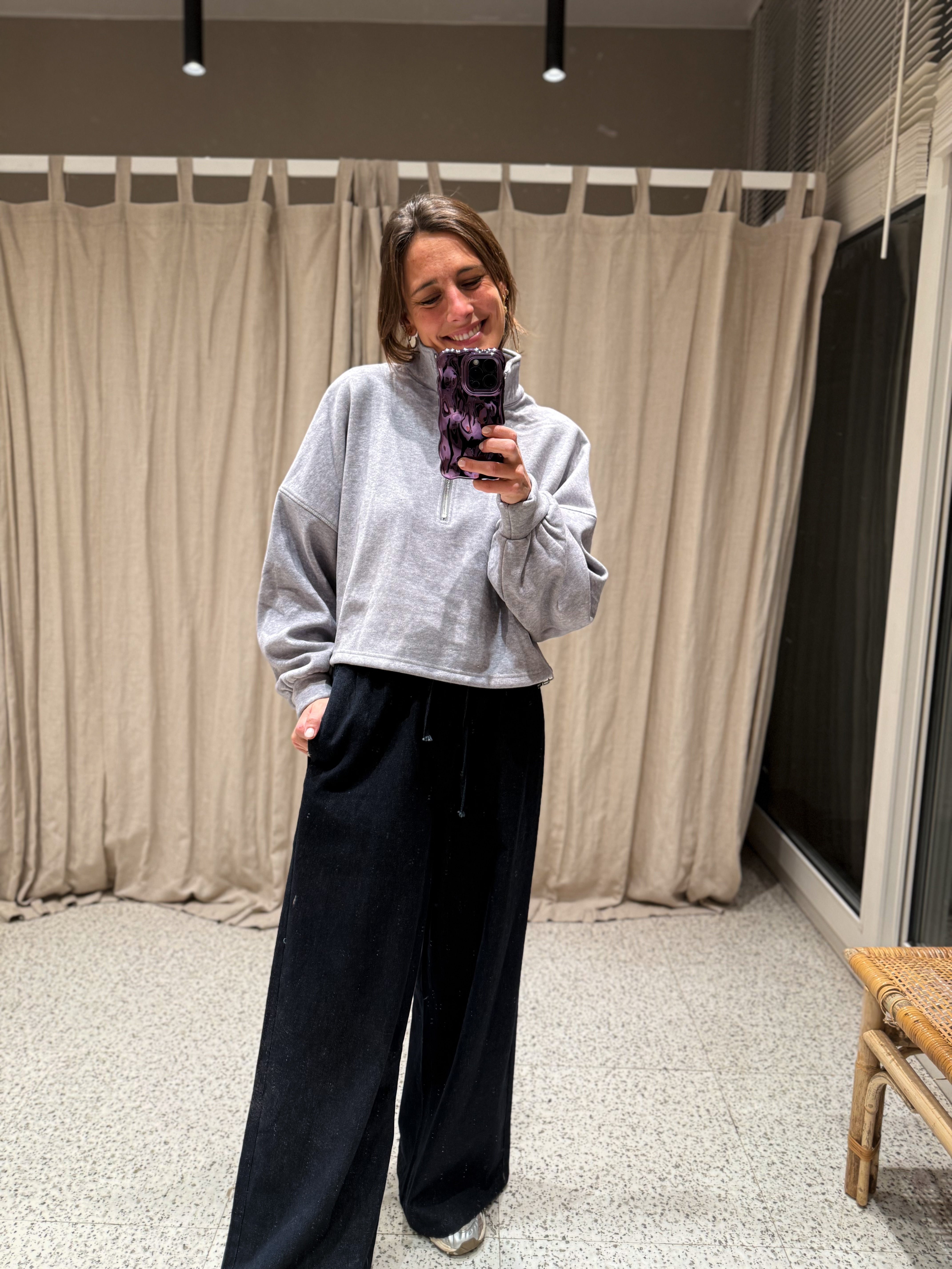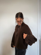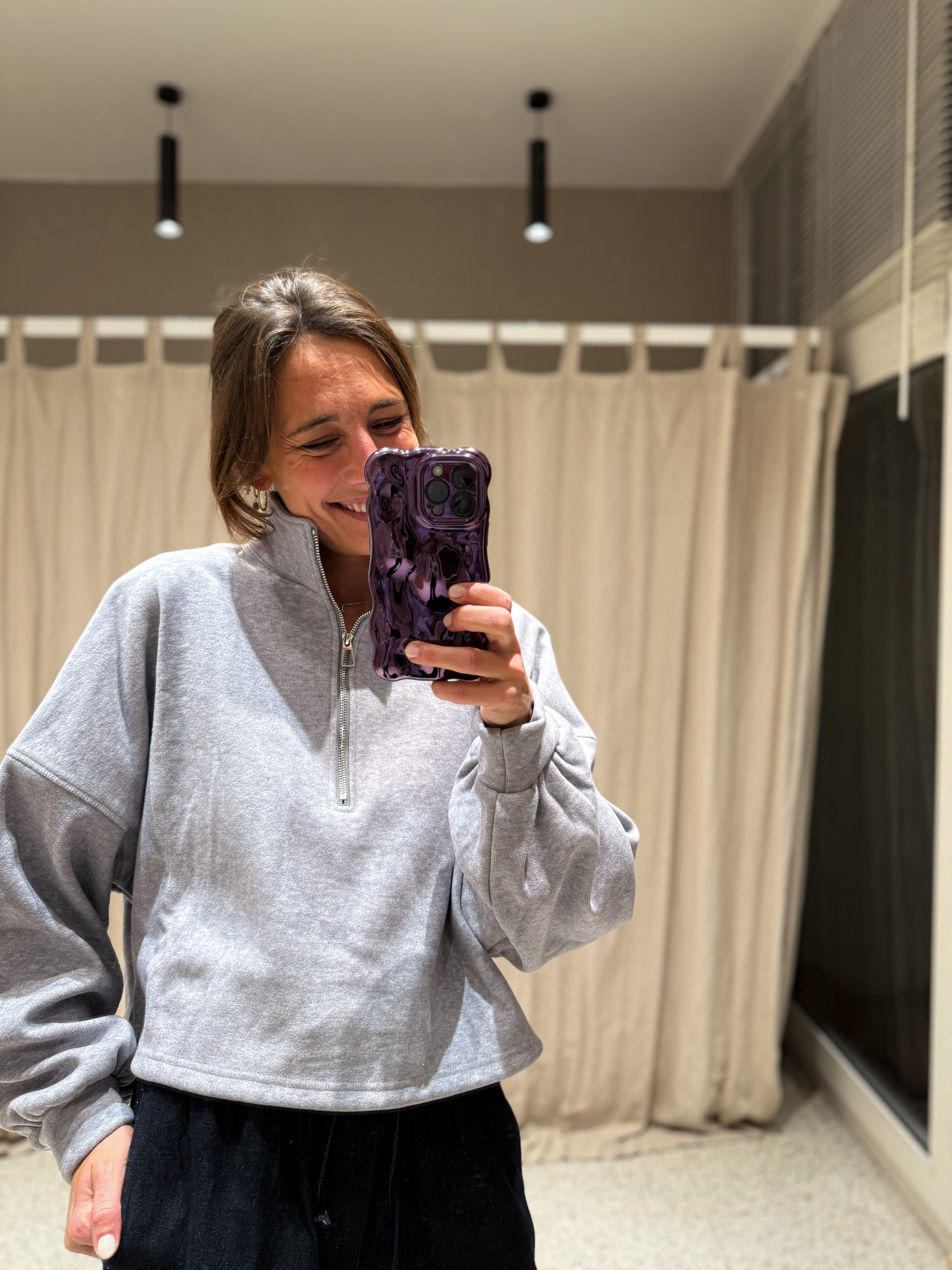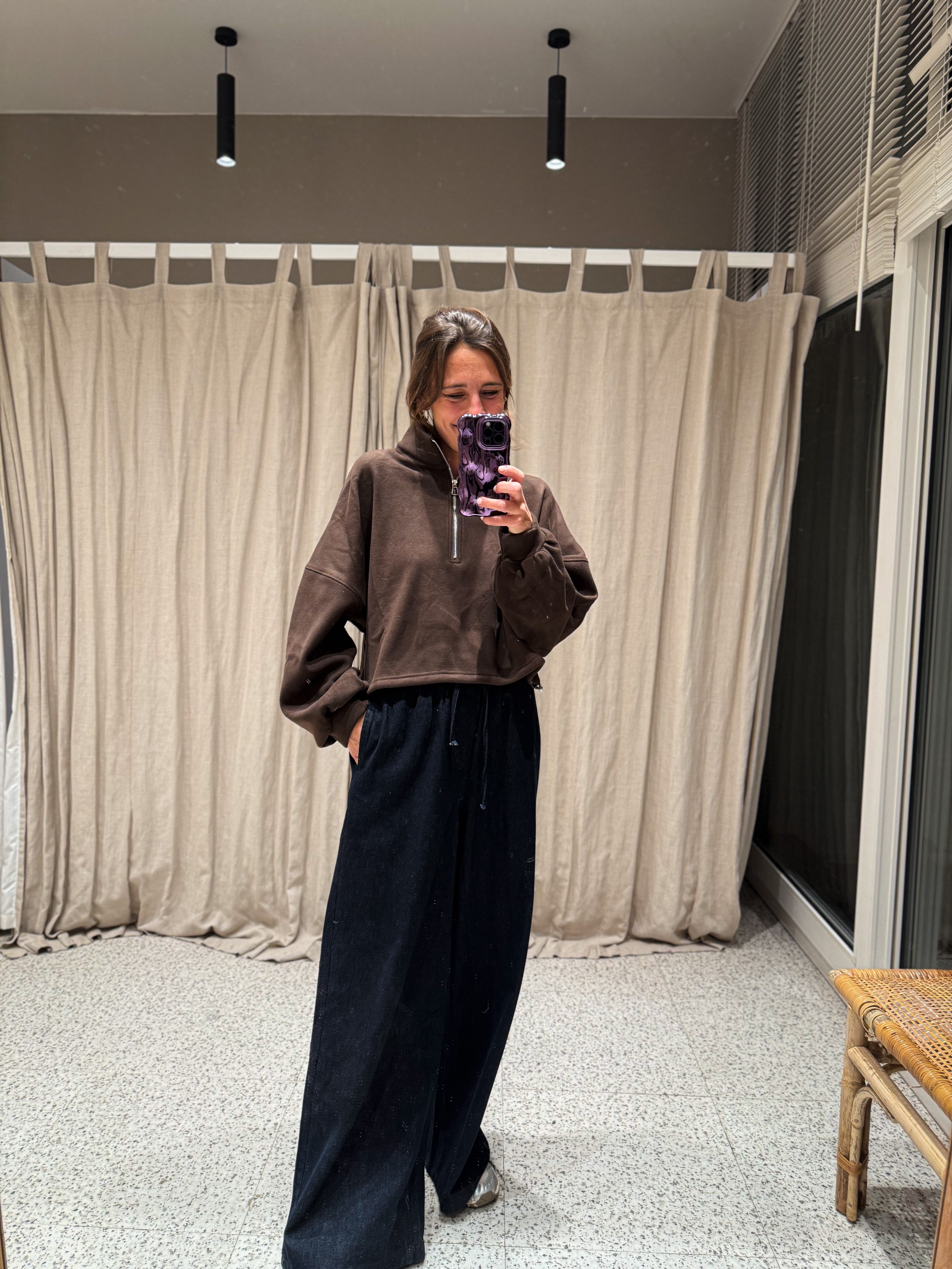 Ce sweat court à manches longues, doté d'une tirette pratique, est proposé en chocolat, bleu et gris clair. Sa taille unique, ample et confortable, s'adapte parfaitement à toutes les silhouettes. Un choix polyvalent et stylé pour votre garde-robe.