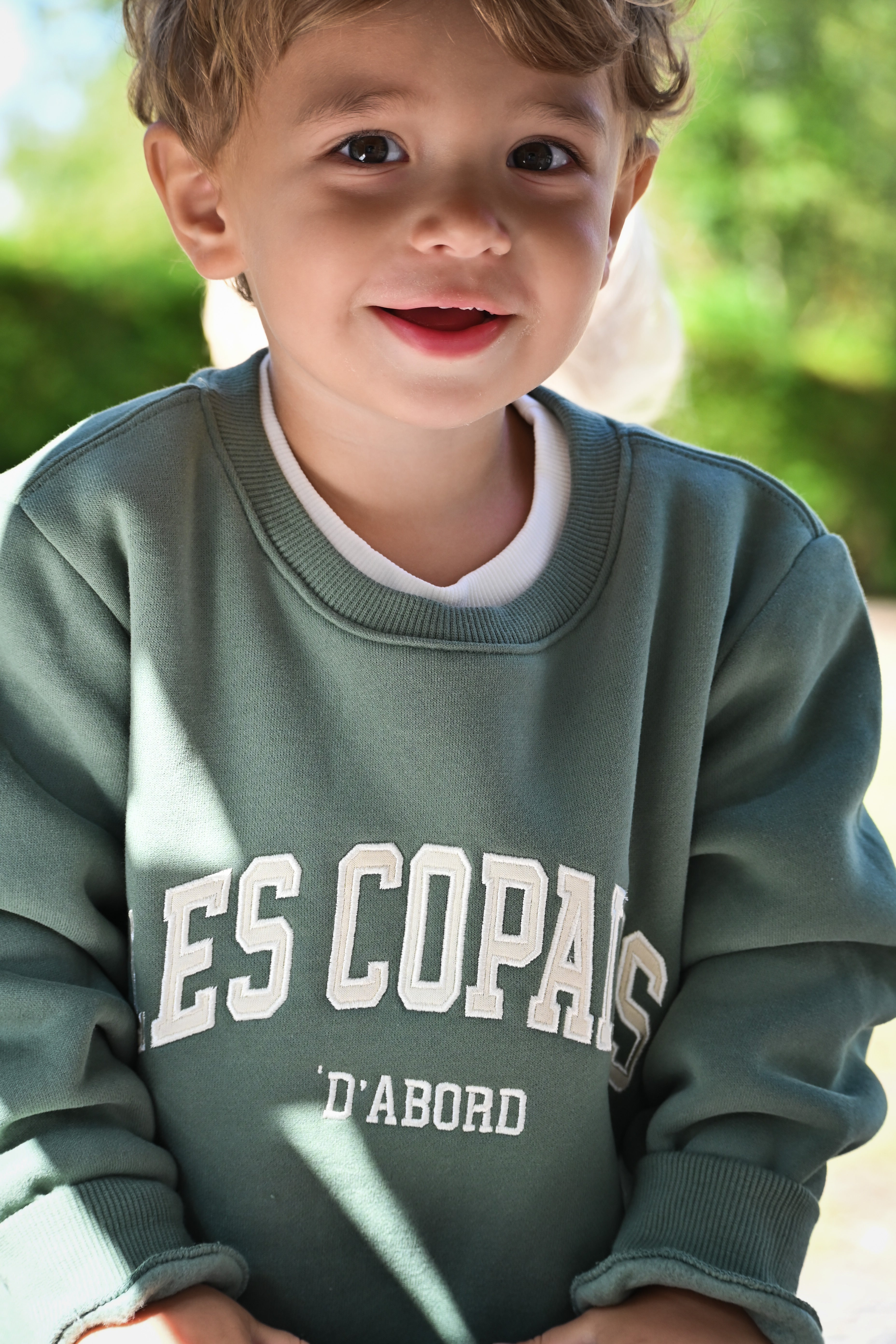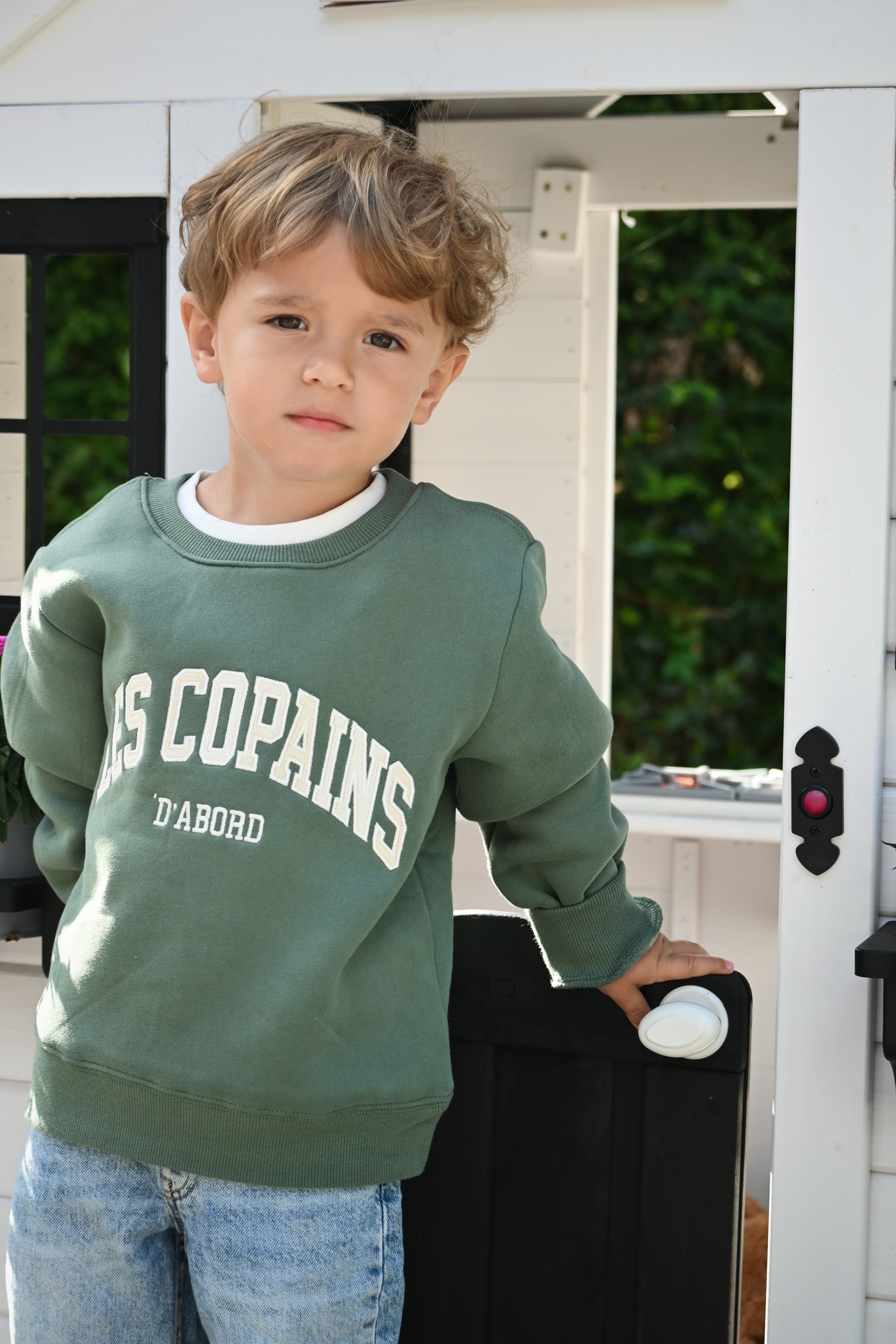 Ce pull enfant à col rond et manches longues arbore l'inscription « les copains d'abord ». Proposé en vert et gris, il est disponible de la taille 2/3 ans jusqu'à 12 ans. Douillet à l'intérieur, il assure un confort optimal pour les petits.