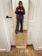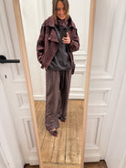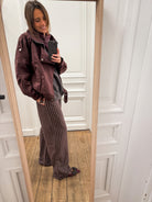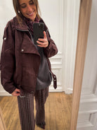 Cette veste courte prune, ajustée à la taille façon bomber, s'inspire du style perfecto avec ses manches bouffantes. Disponible en tailles S, M et L, elle allie élégance et confort pour sublimer votre allure.