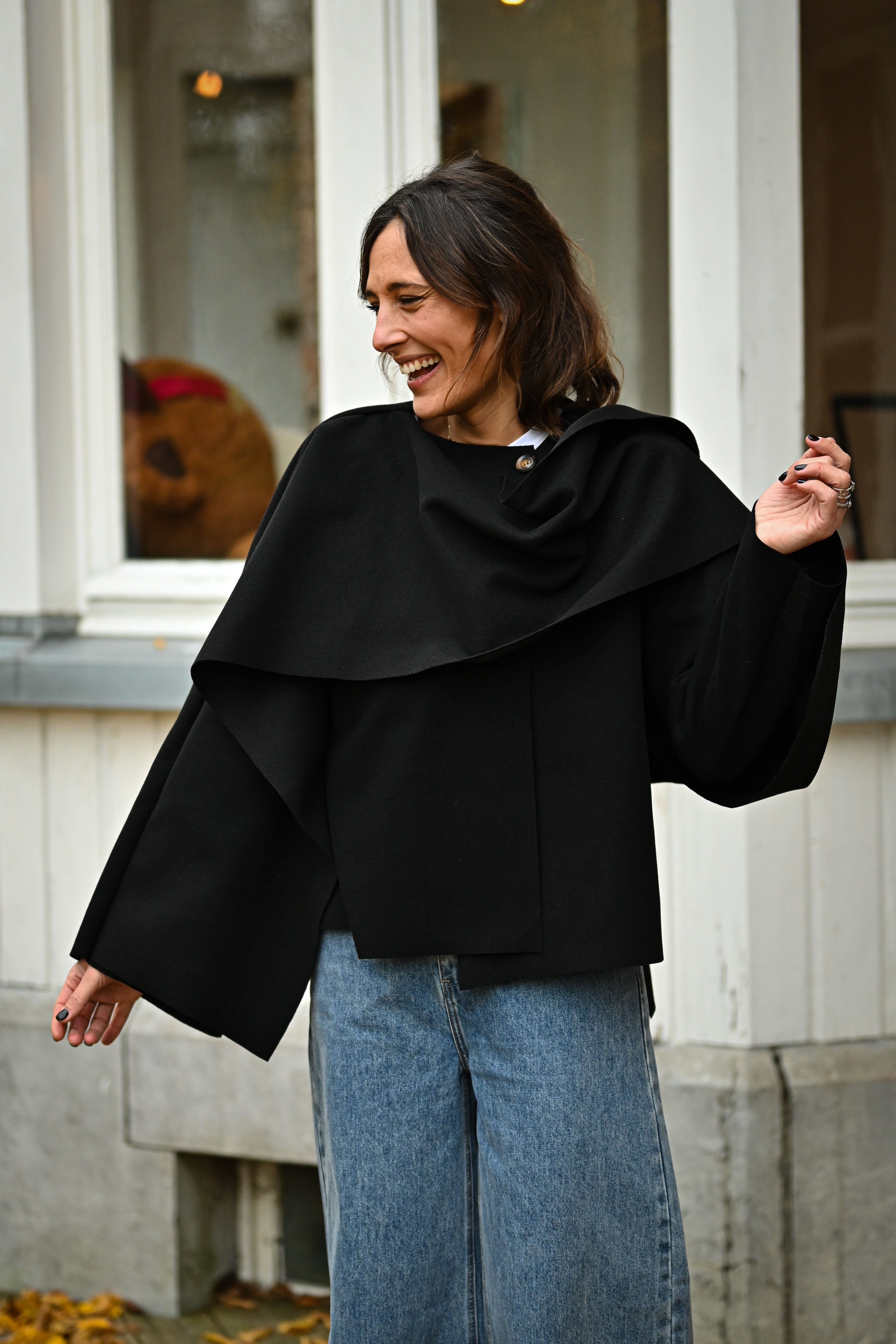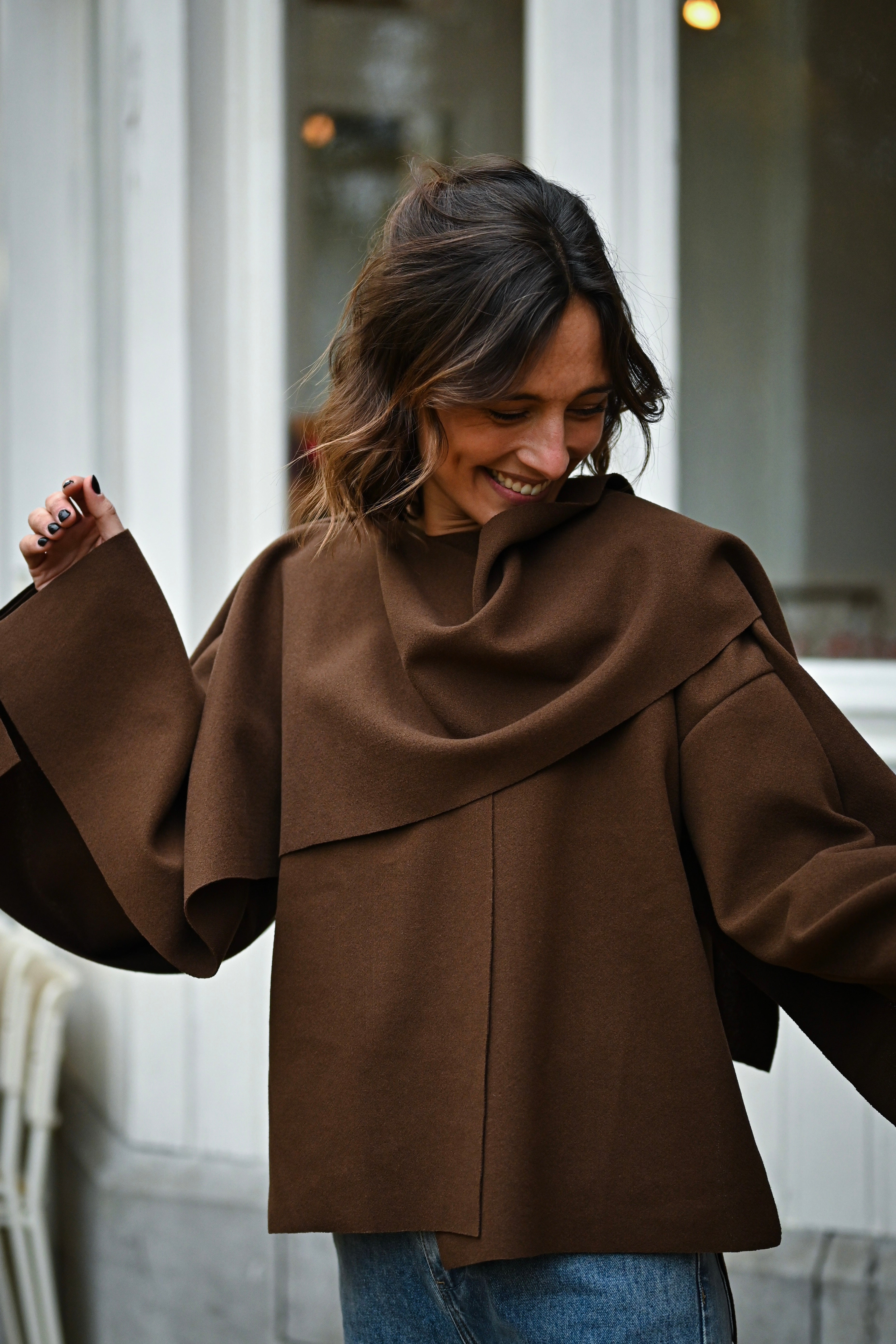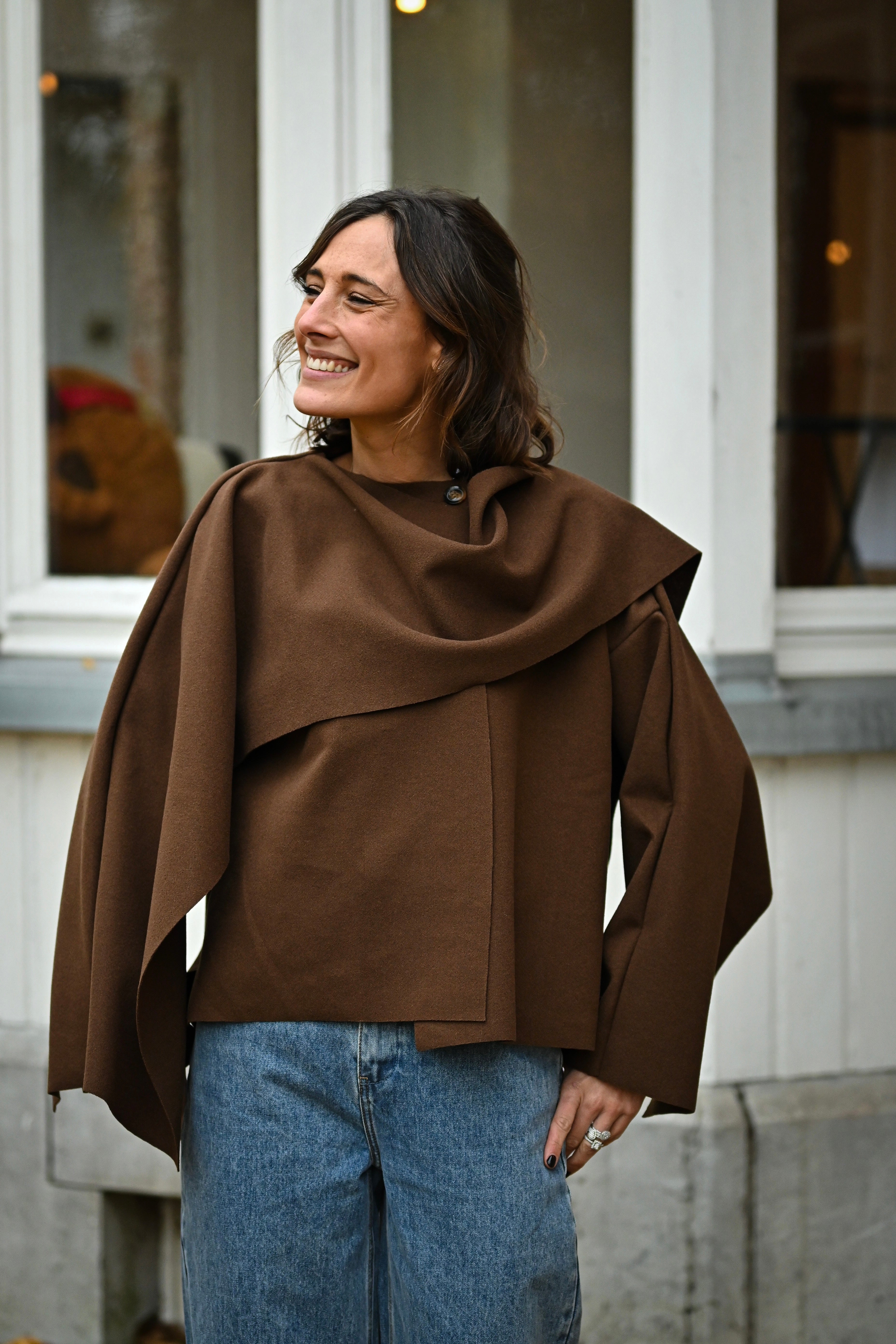 Découvrez la Veste MILA, une pièce incontournable qui allie style et polyvalence. Son design cape sophistiqué, agrémenté d'un rabat élégant au col, crée une silhouette flatteuse et intemporelle. Disponible en noir classique ou chocolat chaleureux, cette veste coupe généreuse s'adapte à toutes les morphologies. Parfaite pour sublimer vos tenues quotidiennes ou créer des looks plus affirmés, elle devient rapidement un basique indispensable de votre garde-robe.