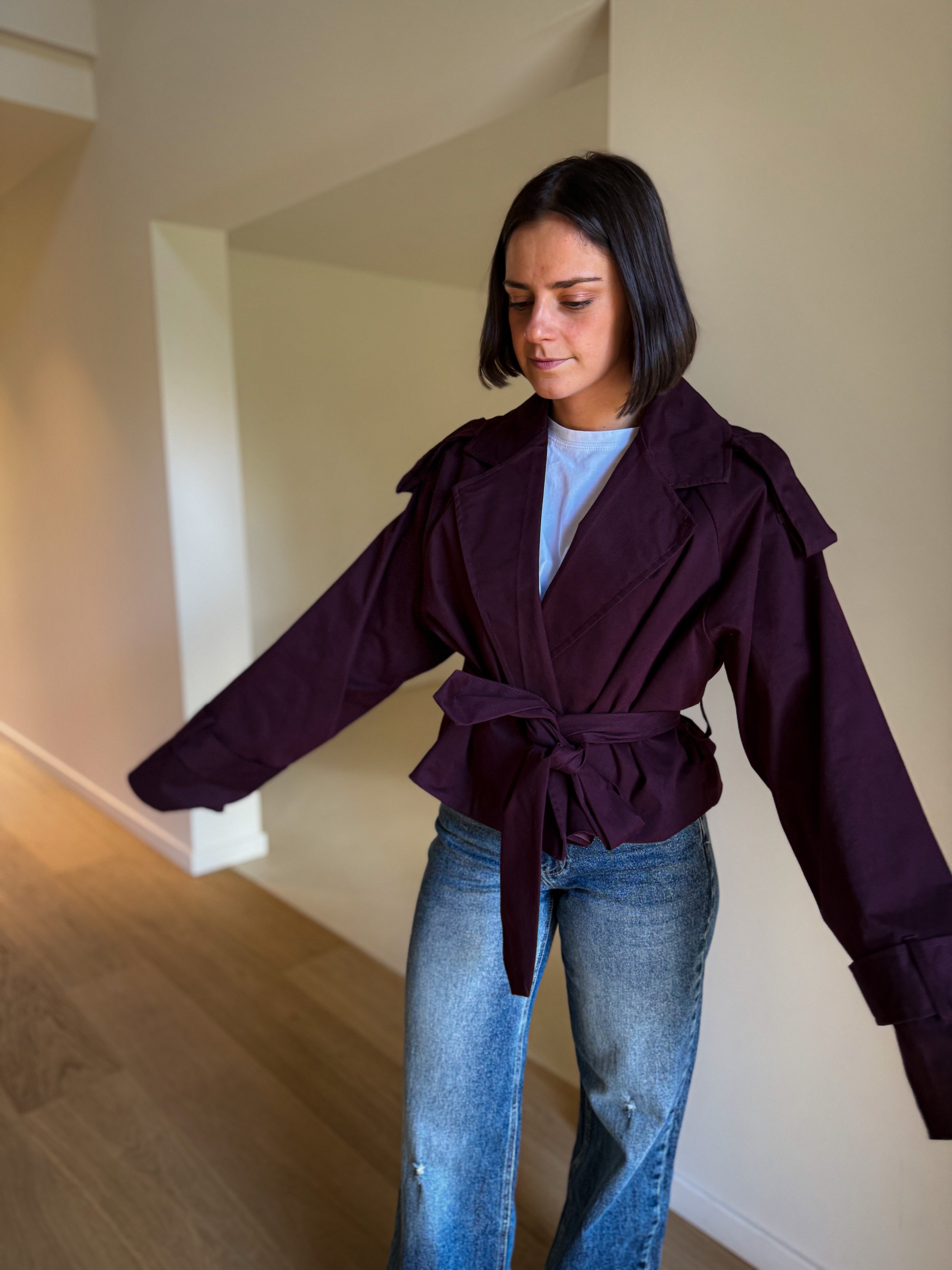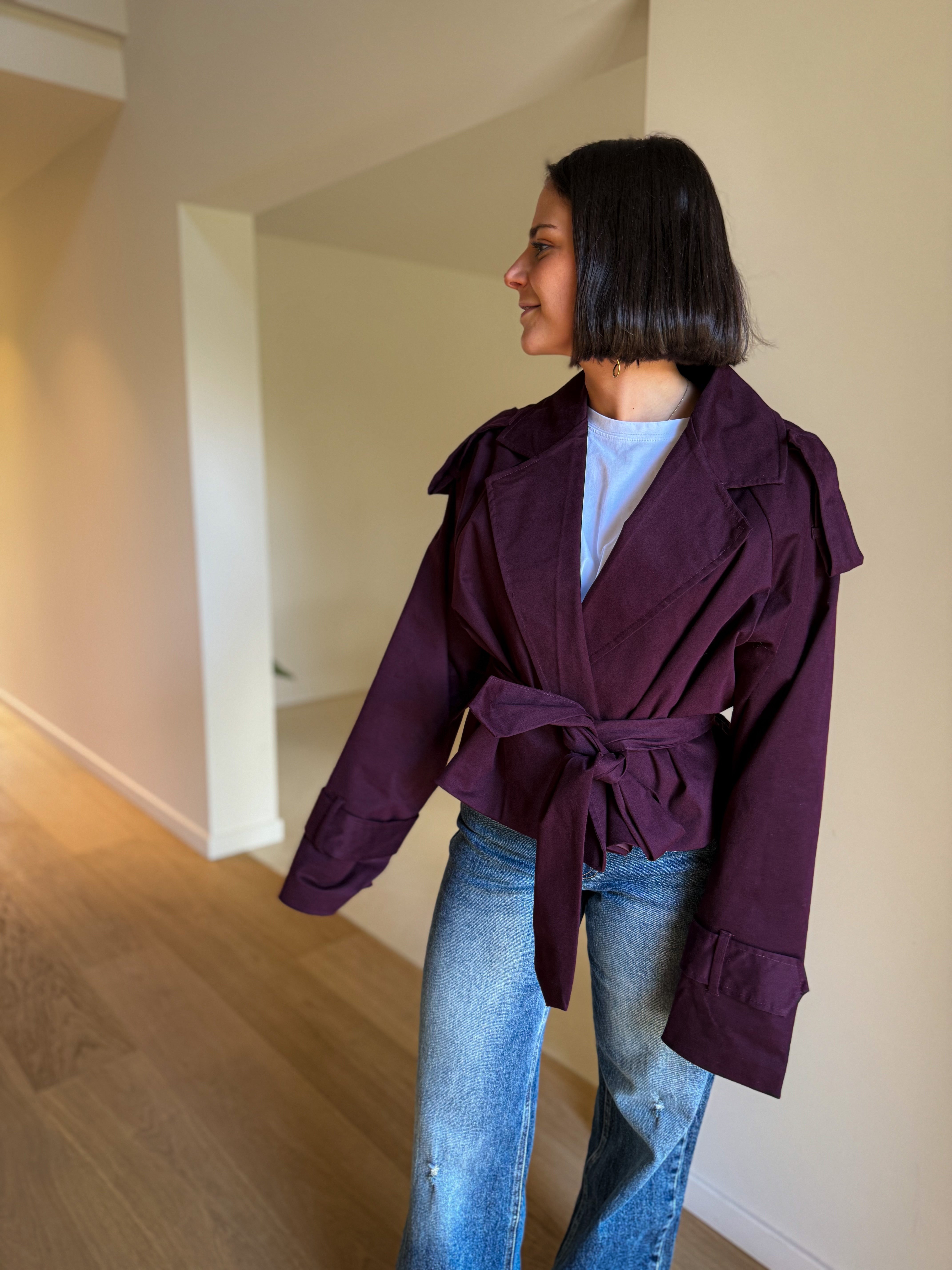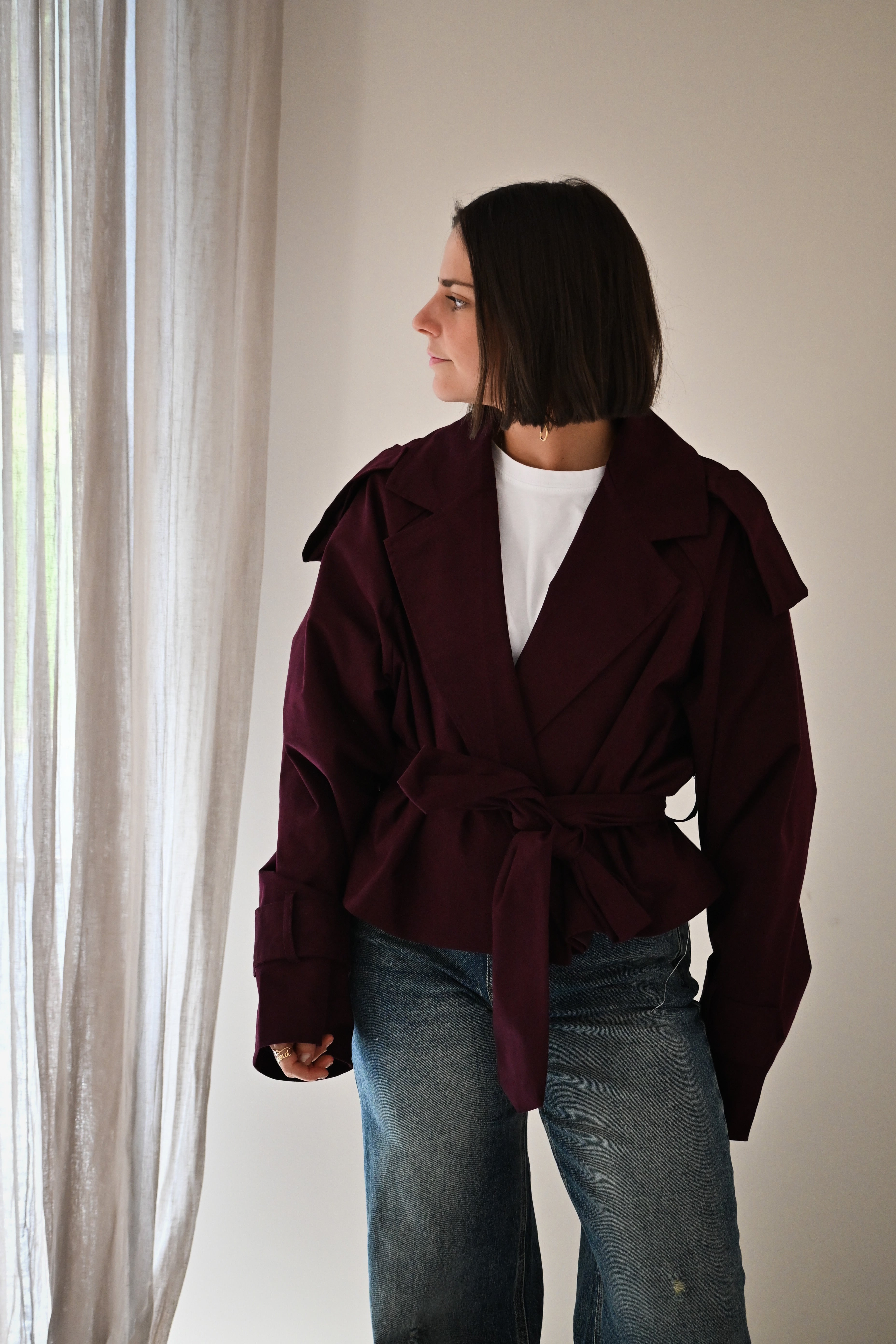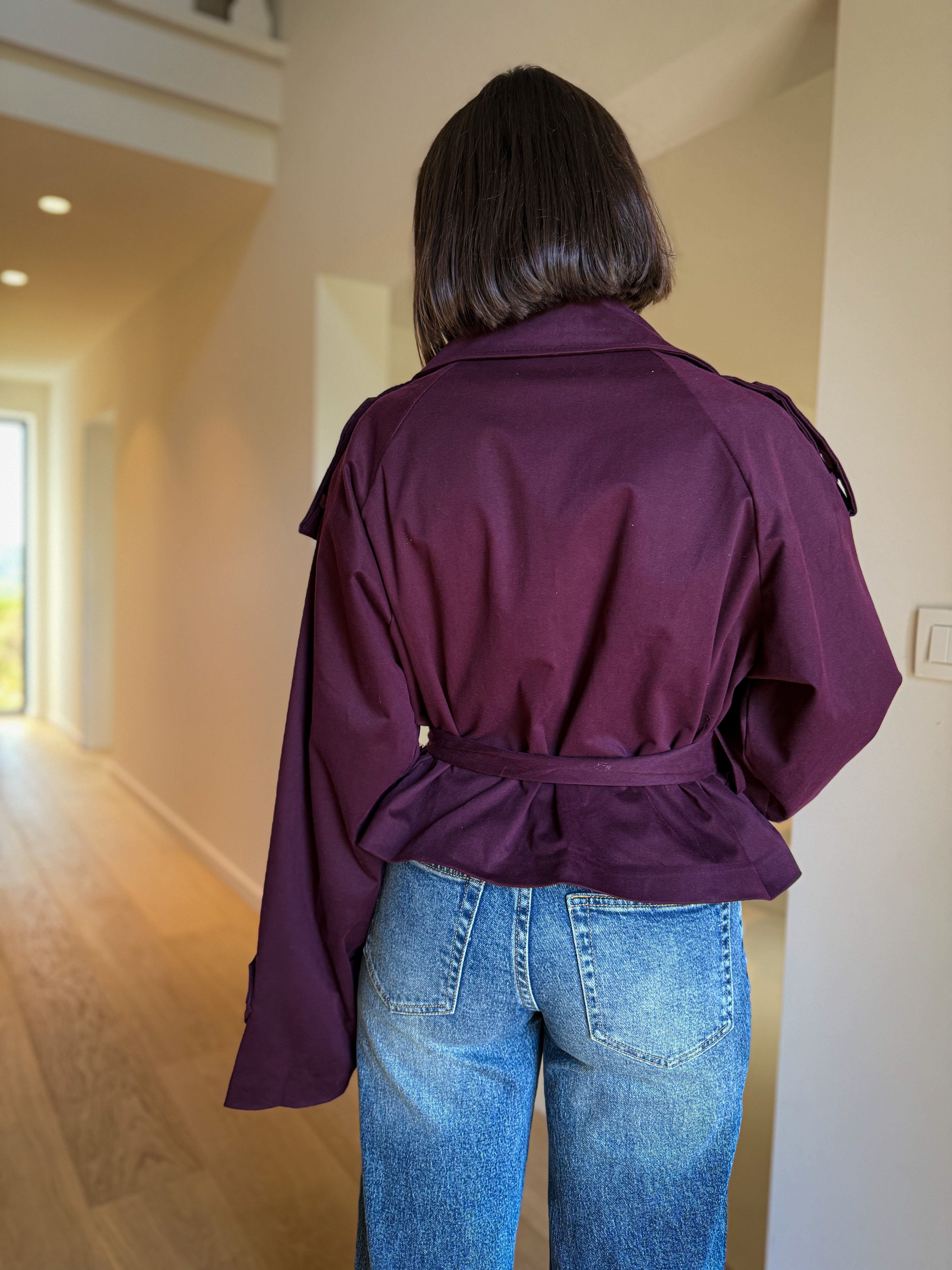 Découvrez la veste courte style trench prune, un modèle unique conçu pour s’ajuster parfaitement à toutes les tailles grâce à sa coupe universelle et tendance.
